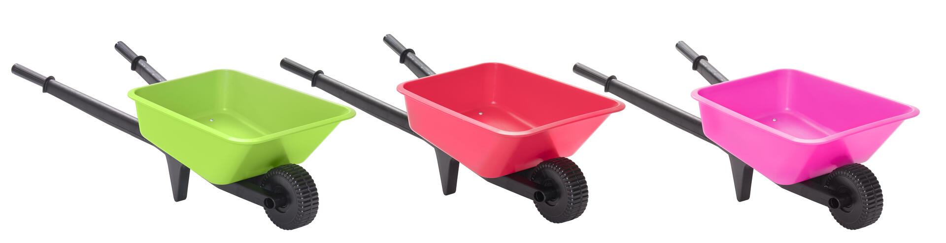 En stadig skottkärra för de yngre barnen som rymmer ca 10L. Klarar vikt upp till 50 kg. Av PE med gummihjul. Mått: 68x33,5x33 cm. Svanenmärkt, licensnummer 50950001. PVC-fri. Från 2 år.