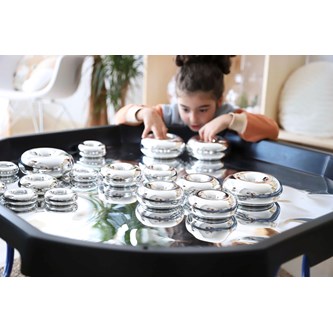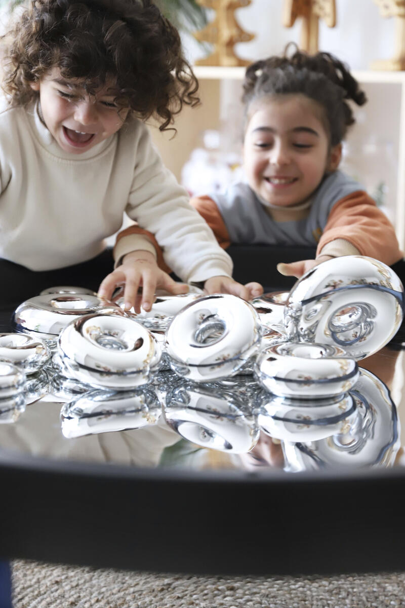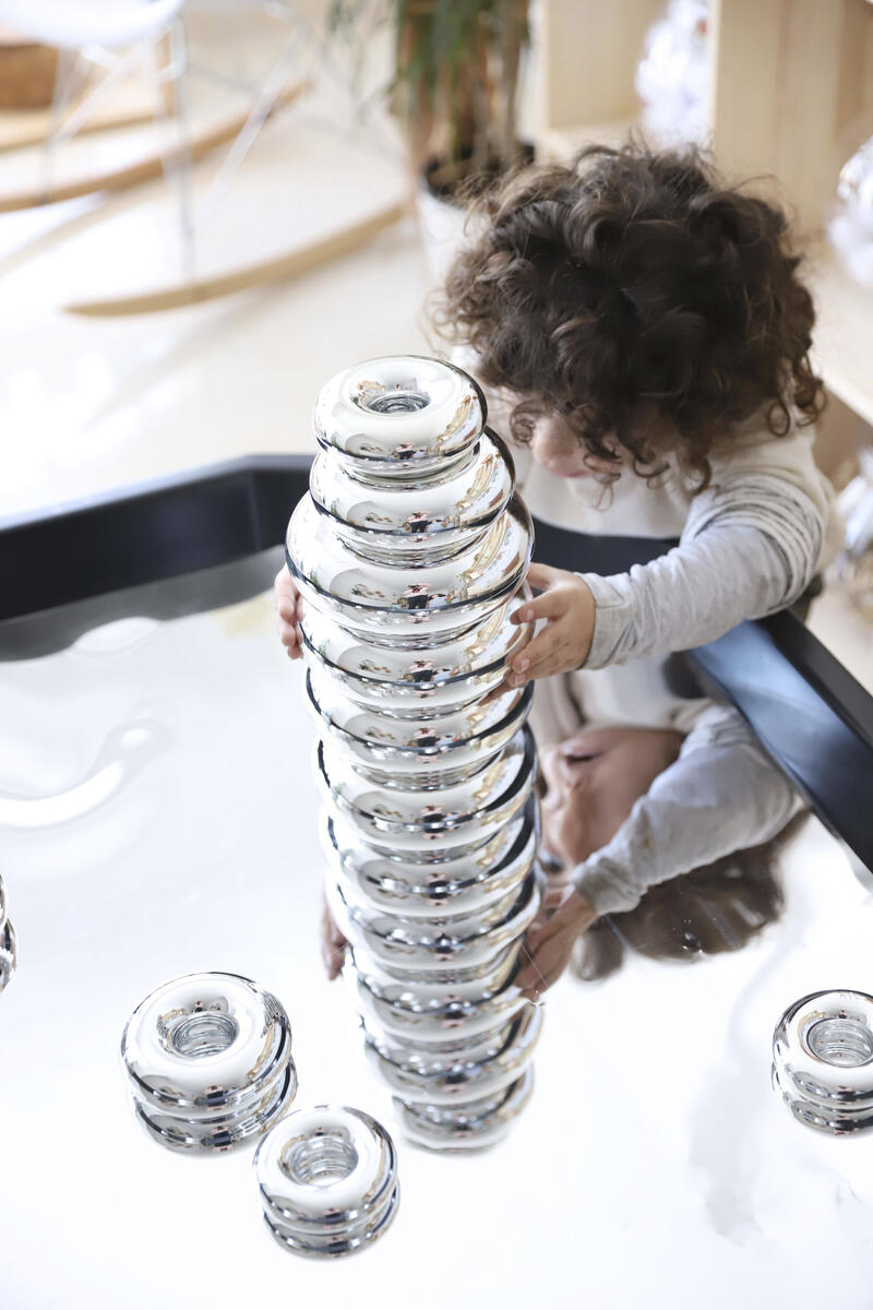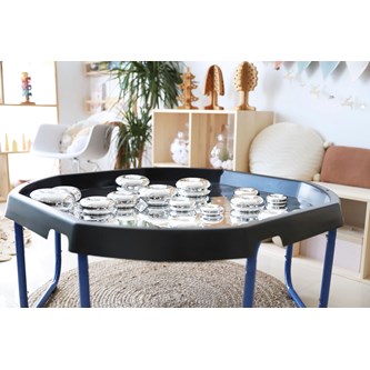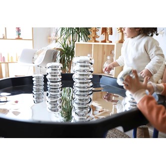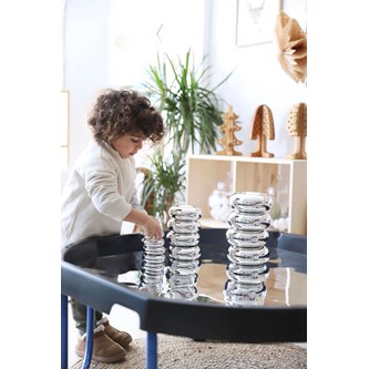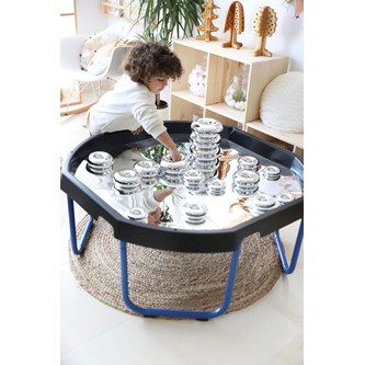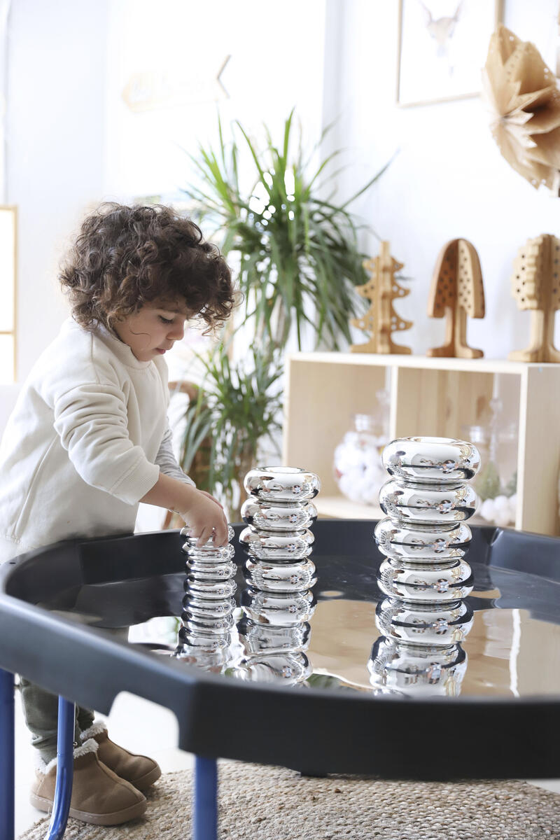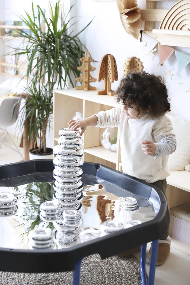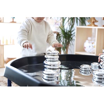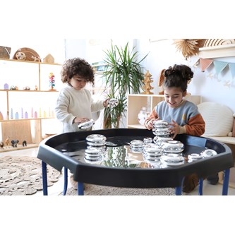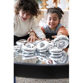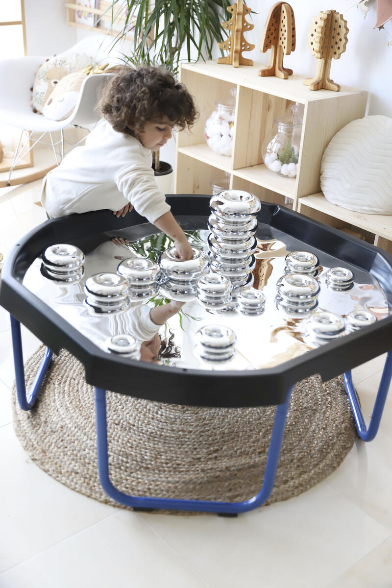 Bygg, sortera, skapa eller bara titta på den fina spegelbilden. Läggs i lekbordssetet 53200 eller på annan plan yta. Rengörs med fuktig trasa och milt rengöringsmedel. Används med fördel med mjuka tillbehör, då vassa föremål kan repa ytan. Mått: ø 86 cm. Av PS. PVC-fri.