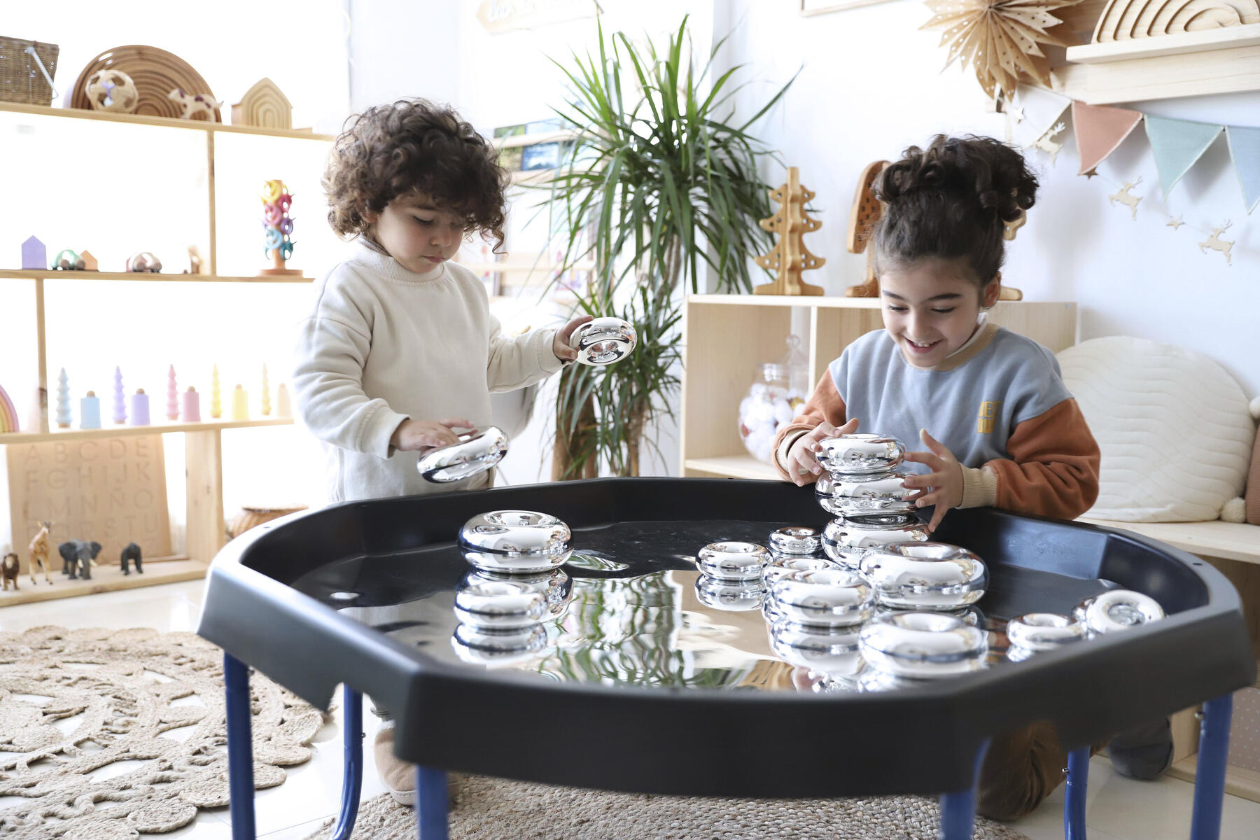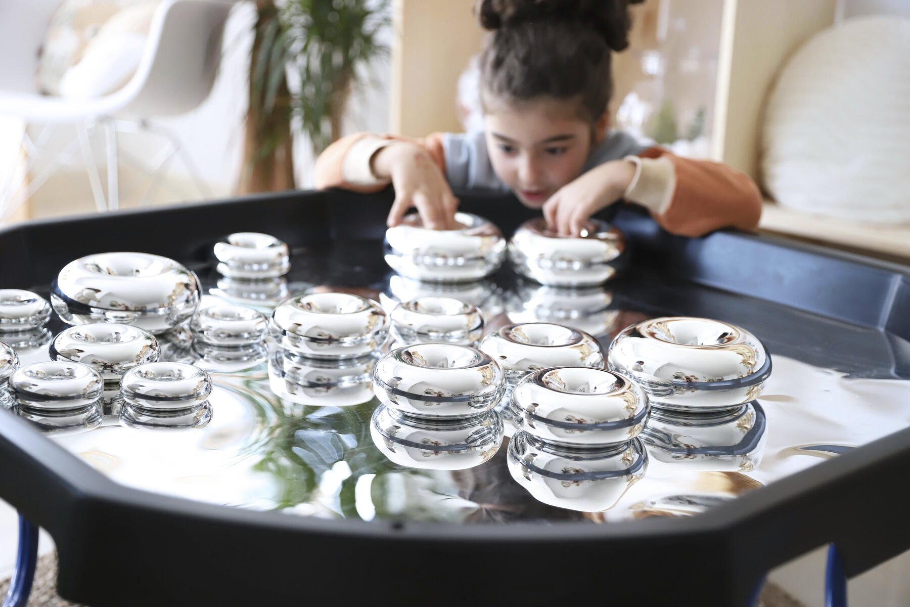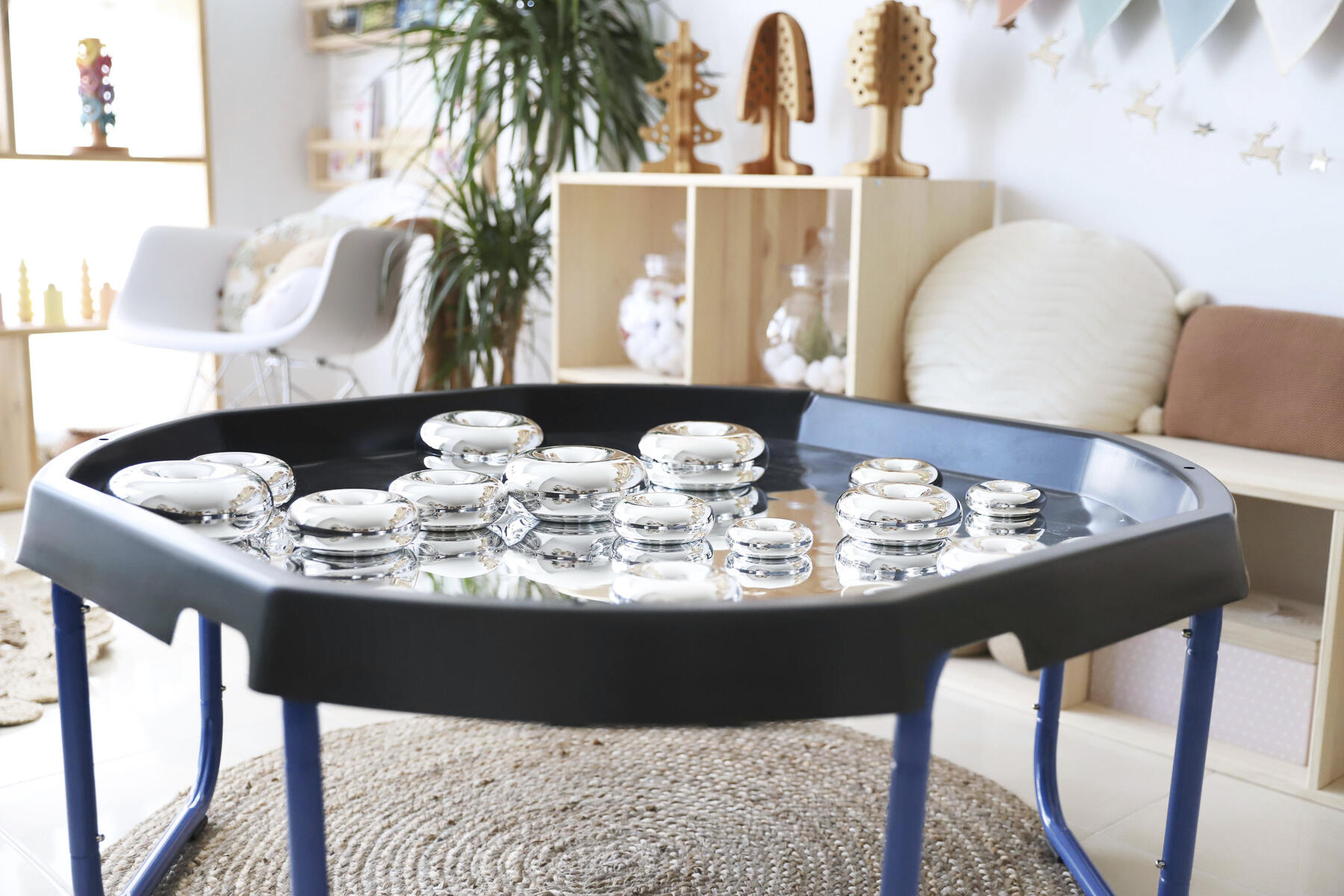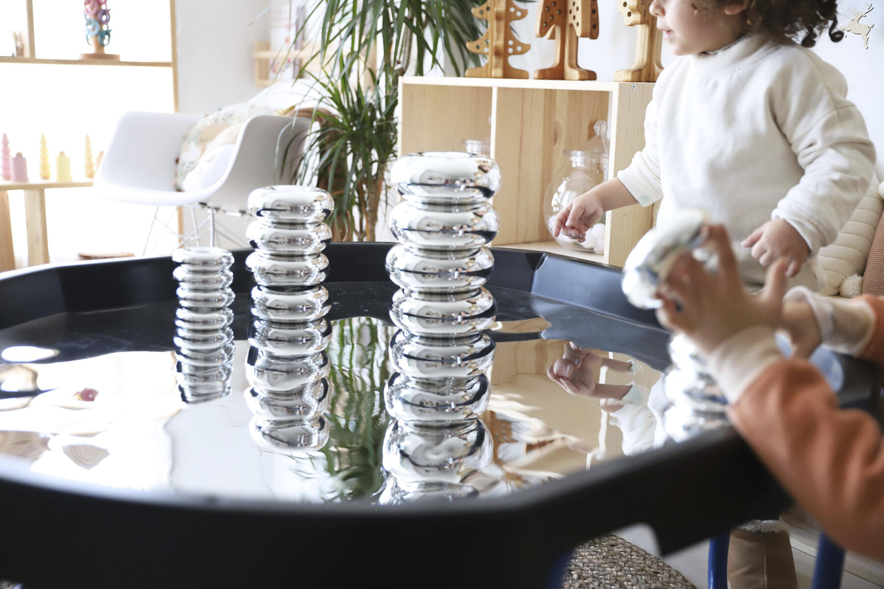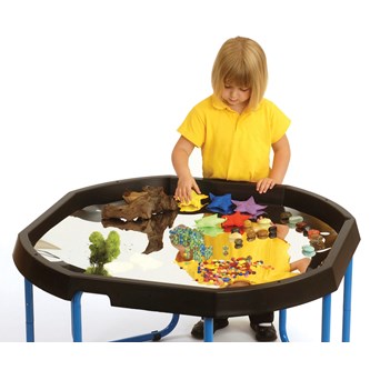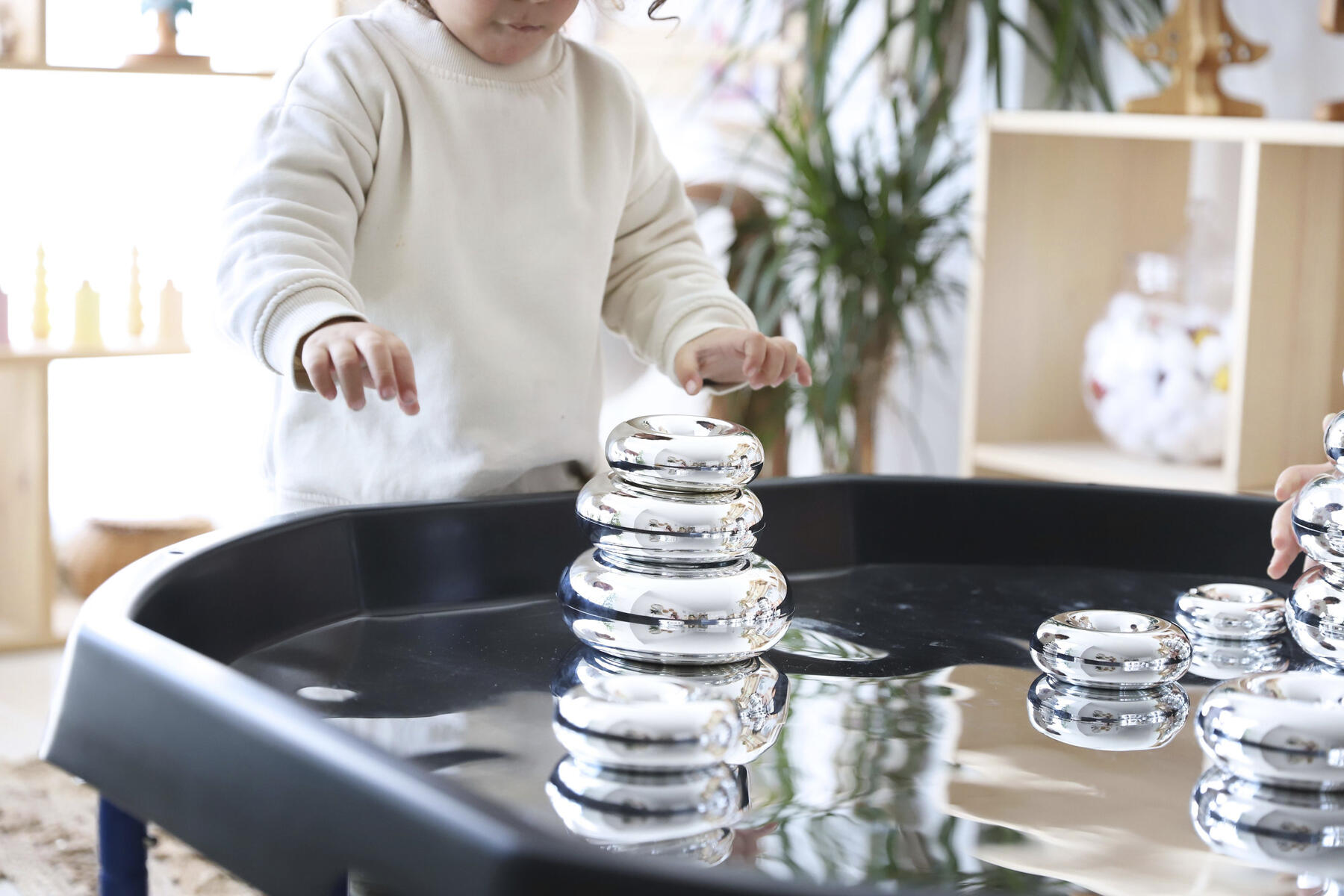 Bygg, sortera, skapa eller bara titta på den fina spegelbilden. Läggs i lekbordssetet 53200 eller på annan plan yta. Rengörs med fuktig trasa och milt rengöringsmedel. Används med fördel med mjuka tillbehör, då vassa föremål kan repa ytan. Mått: ø 86 cm. Av PS. PVC-fri.