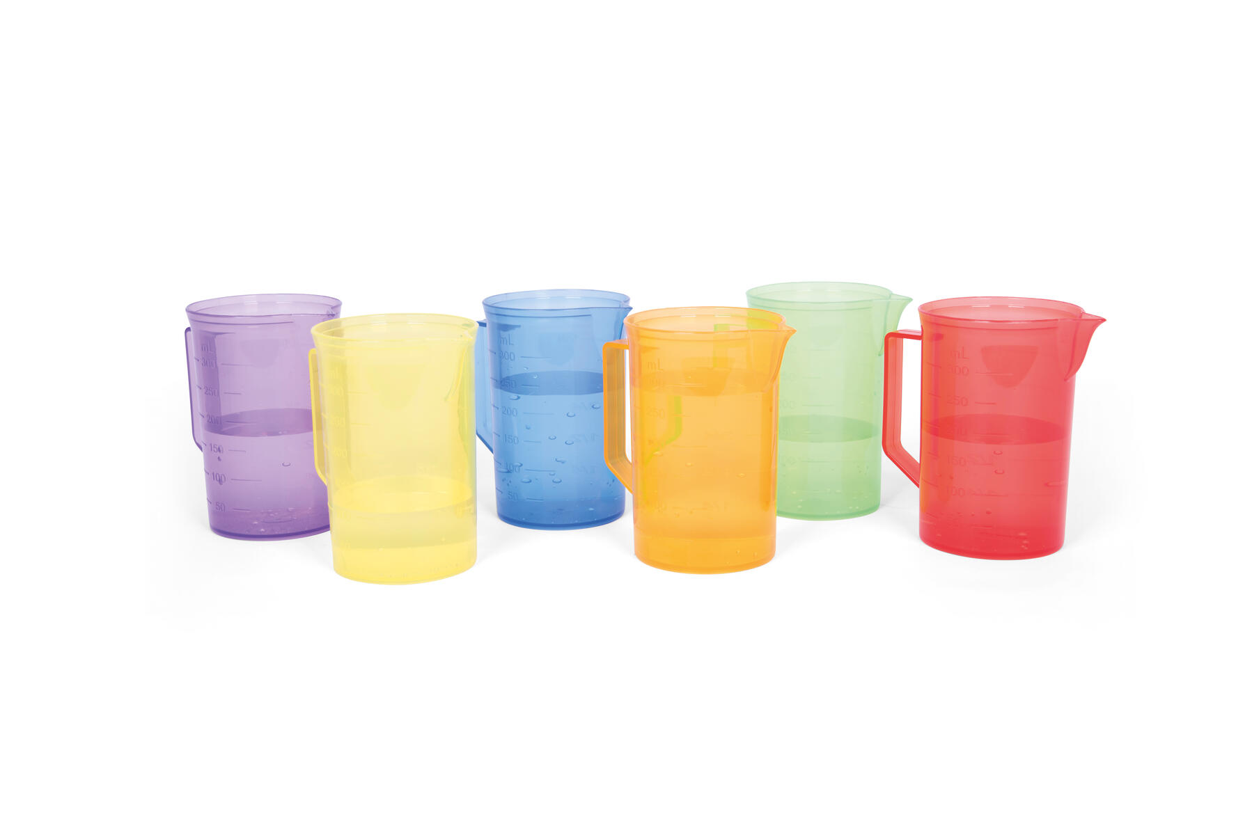 6 st/fp. Lagom stora bägare att hantera för barn. Graderade 50–300 ml. Roliga att använda till experiment, mätning och vattenlek. Levereras i 6 olika fina transparenta färger. Av ABS. Mått: 11,3x7,7 cm. PVC-fri. Från 1,5 år.