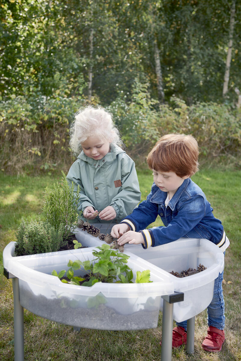 Ett spännande lekbord för kreativa barn. Lekbordets användningsområden kan varieras på många olika sätt. Med hjälp av lekmattan med skogsmotiv kan barnen skapa en värld av material från sin egen omvärld, t.ex. grus, pinnar, gräs och löv. Tillsätt några lekdjur och den kreativa leken är i full gång. Du kan också fylla hela lekbordet med sand eller vatten. I setet ingår lekbord, lekmatta skog och en ställning av lackerat stål. Delarna kan också köpas separat. Tillverkat av 100% återvunnen plast. PVC-fri.