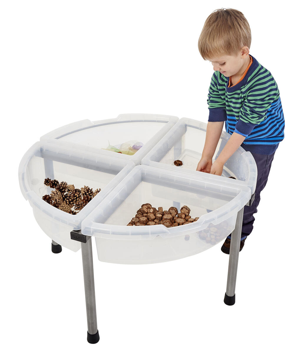 Ett sand- och vattenleksbord där barnen kan leka och upptäcka egenskaper hos olika material som t.ex. löv, sand eller vatten. De 4 transparenta, triangulära baljorna kan man enkelt lyfta, tömma och ta med sig för insamling av material. Den runda formen gör att många barn får plats runt vilket ger en bra grund för samarbete. Med alla fyra baljorna är diametern ca 80 cm, stativet är ca 46 cm högt och djupet på baljorna är ca 15 cm. Hopfällbart, kromat stativ och baljor av PP. PVC-fri. Från 3 år.