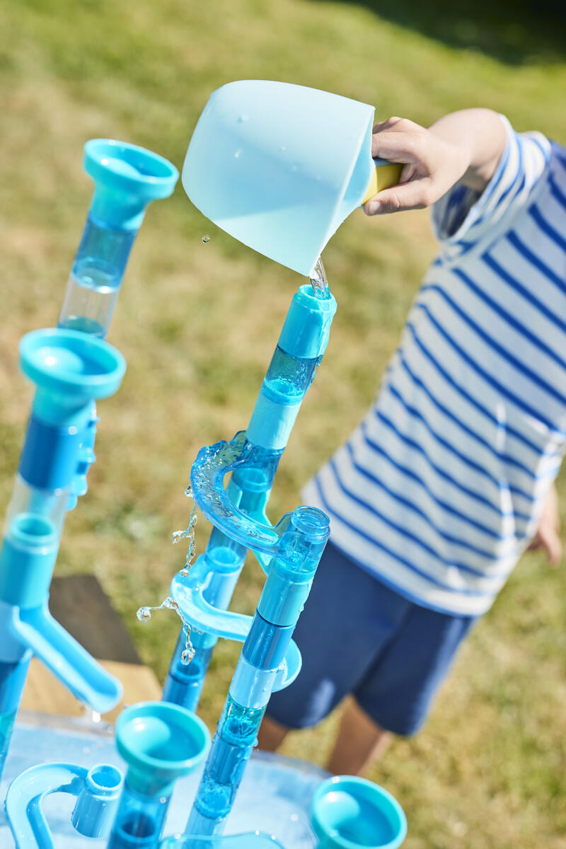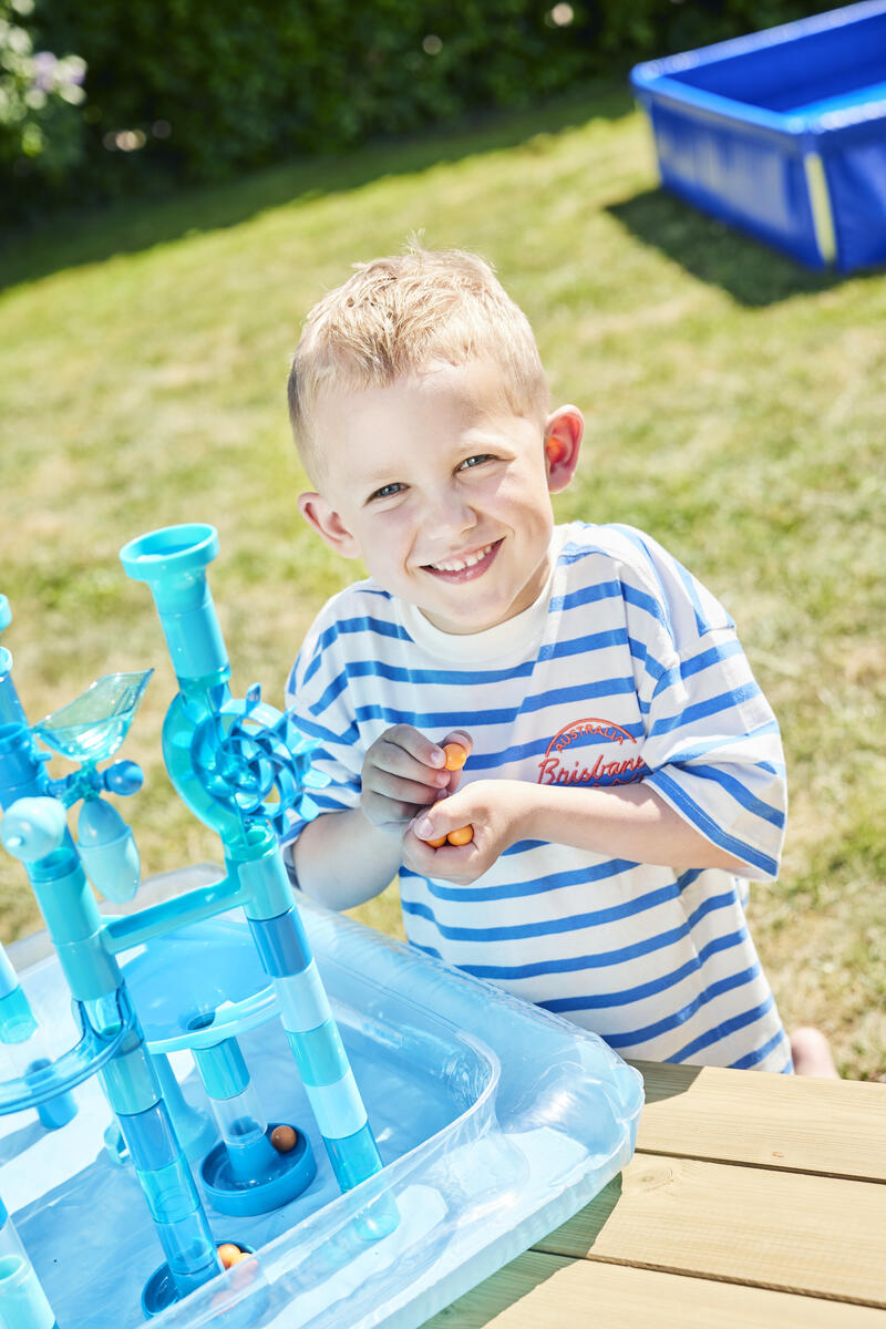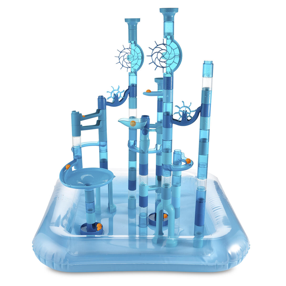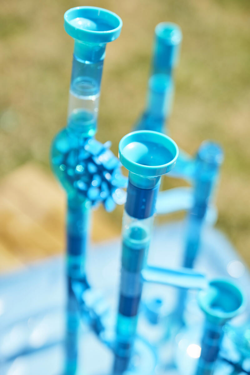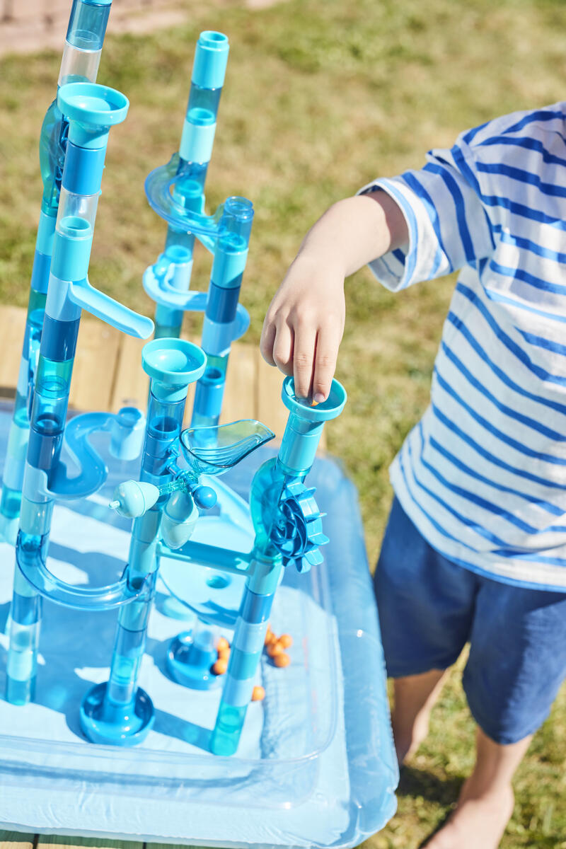 99 delar. En rolig kulbana som utvecklar barnens kreativitet och logiska tänkande. Kulbanan fungerar lika bra med som utan vatten. Setet innehåller 82 byggdelar, 15 flytande kulor, en uppblåsbar vattentät lekmatta och en vattenskopa. PVC-fri. Från 4 år.