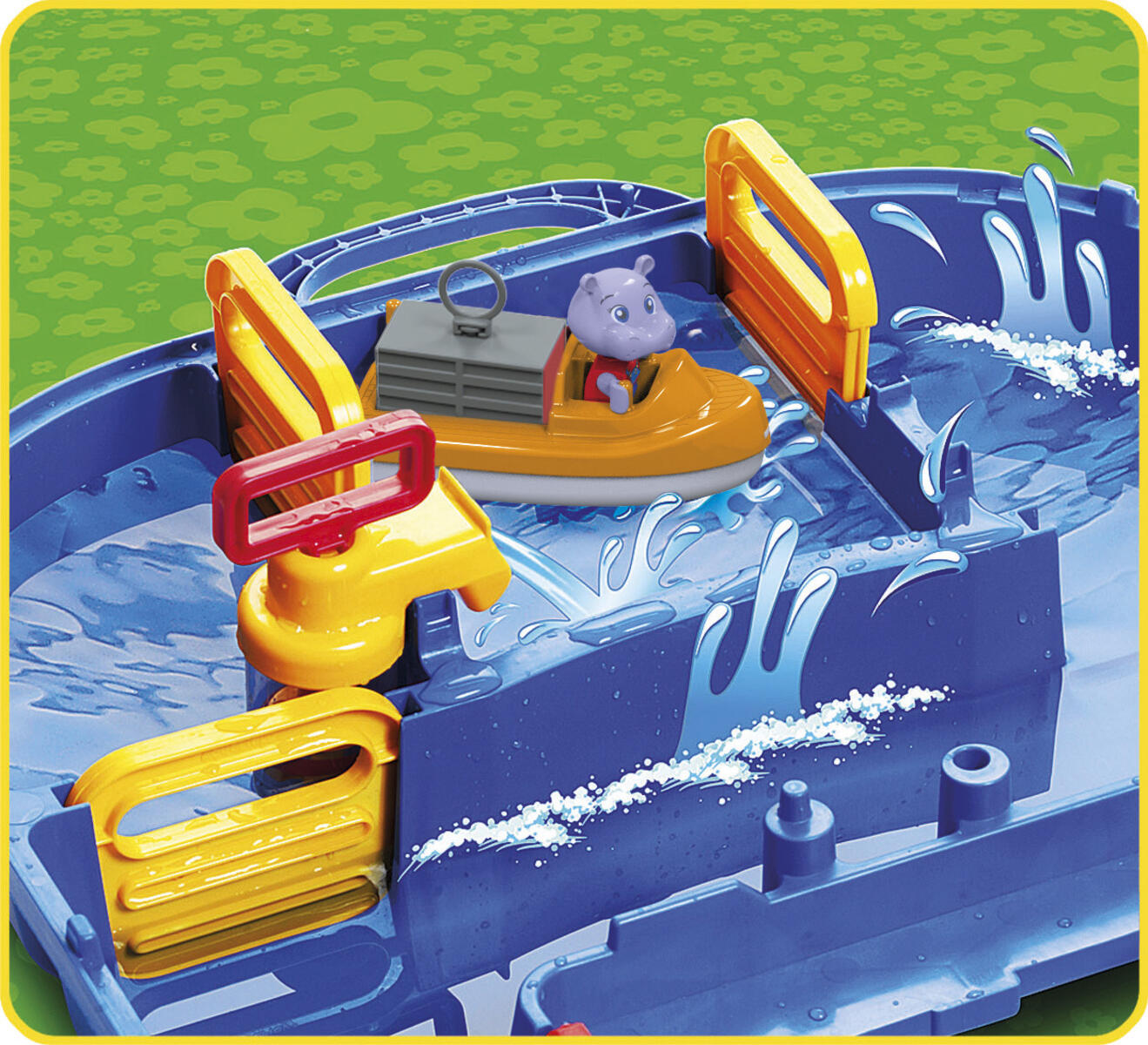 44 delar. Ett roligt kanalsystem för lärande experiment med vatten. Sätt båtarna i rörelse, låt vattnet stiga i slussen och åk med fart nedför berget. Setet innehåller också ett fartyg, en containerbåt och 3 djurfigurer. Tillsammans med figurerna kan barnen utforska bergets mystiska grotta, klättra upp för de branta klipporna, ta fartbåten ner i vattenfallet eller leta efter skatter i kanalerna. Detta är ett kreativt och lekfullt sätt att lära sig hur vatten rör sig. Mått: 126 x 88 x 35 cm. Av polypropenplast. PVC-fri. Från 3 år.