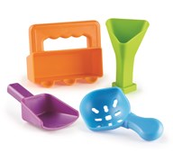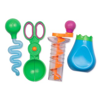 Dessa finmotoriska verktyg är anpassade för små händer och hjälper till att förbättra öga-handkoordination och finmotorik. Med de fyra redskapen kan man öva på att sikta, tratta, rotera, stämpla, vrida hälla eller ösa. Material: HIPS. PVC-fri. Från 3 år.