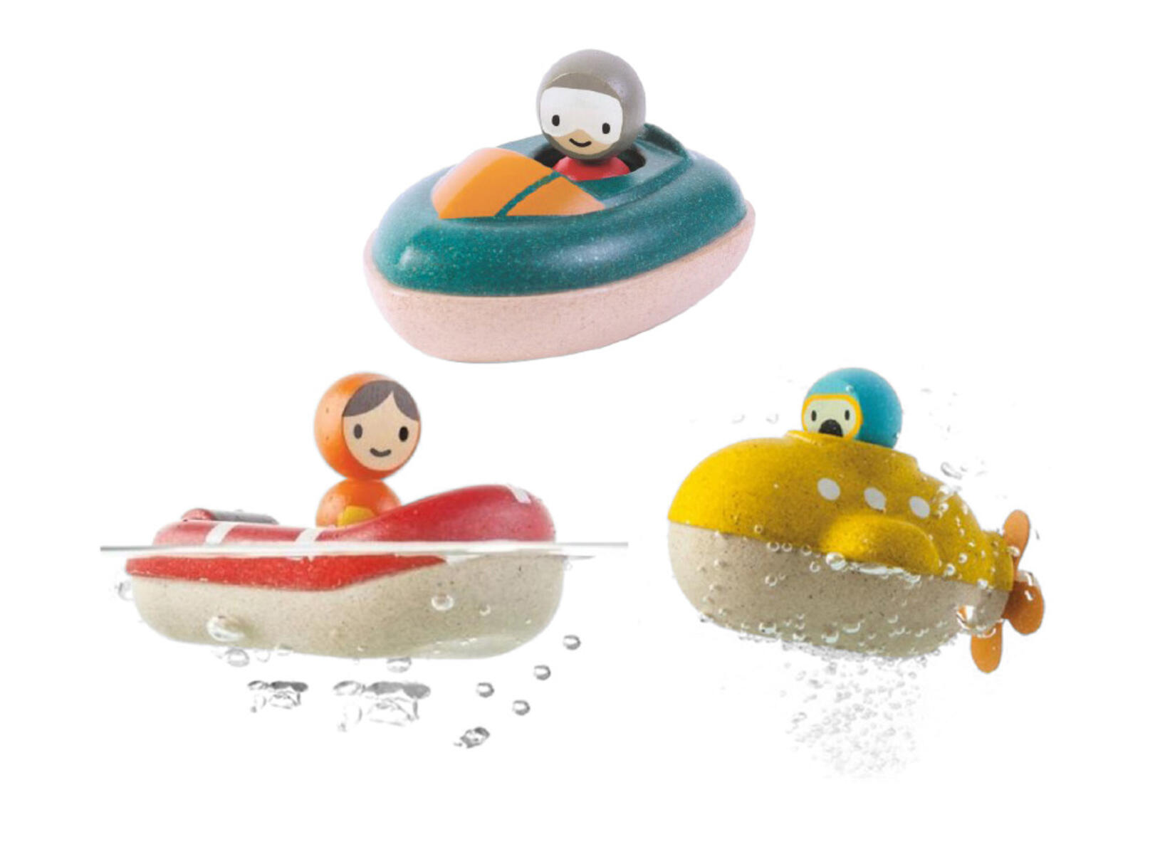 3 st/fp. Låt barnen dyka ner under vattnet med ubåten, köra fort med racerbåten eller var behjälplig med kustbevakningsbåten. Måttexempel på ubåt, längd: 12,4 cm. Av återplanterat gummiträ. PVC-fri. Från 18 månader.