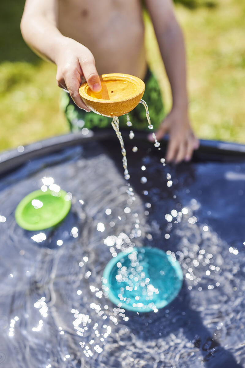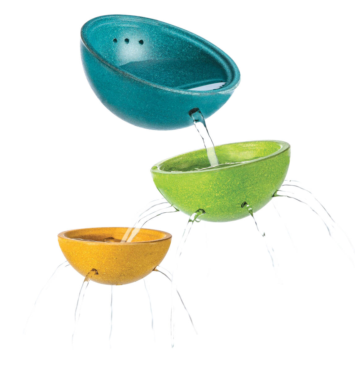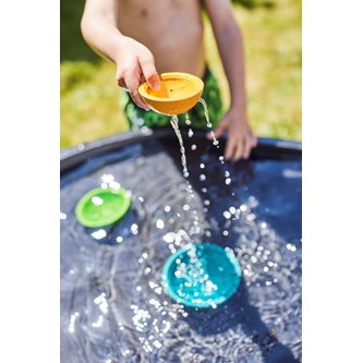 Hur snabbt eller långsamt rinner vattnet ur kopparna? Ett set som består av 3 olika koppar för att experimentera med olika flöden av vatten. Mått: 13x13x6 cm. Tillverkade av återplanterat gummiträd och färgade med ekologisk, vattenbaserad och giftfri färg. PVC-fri. Från 1 år.