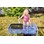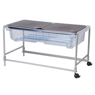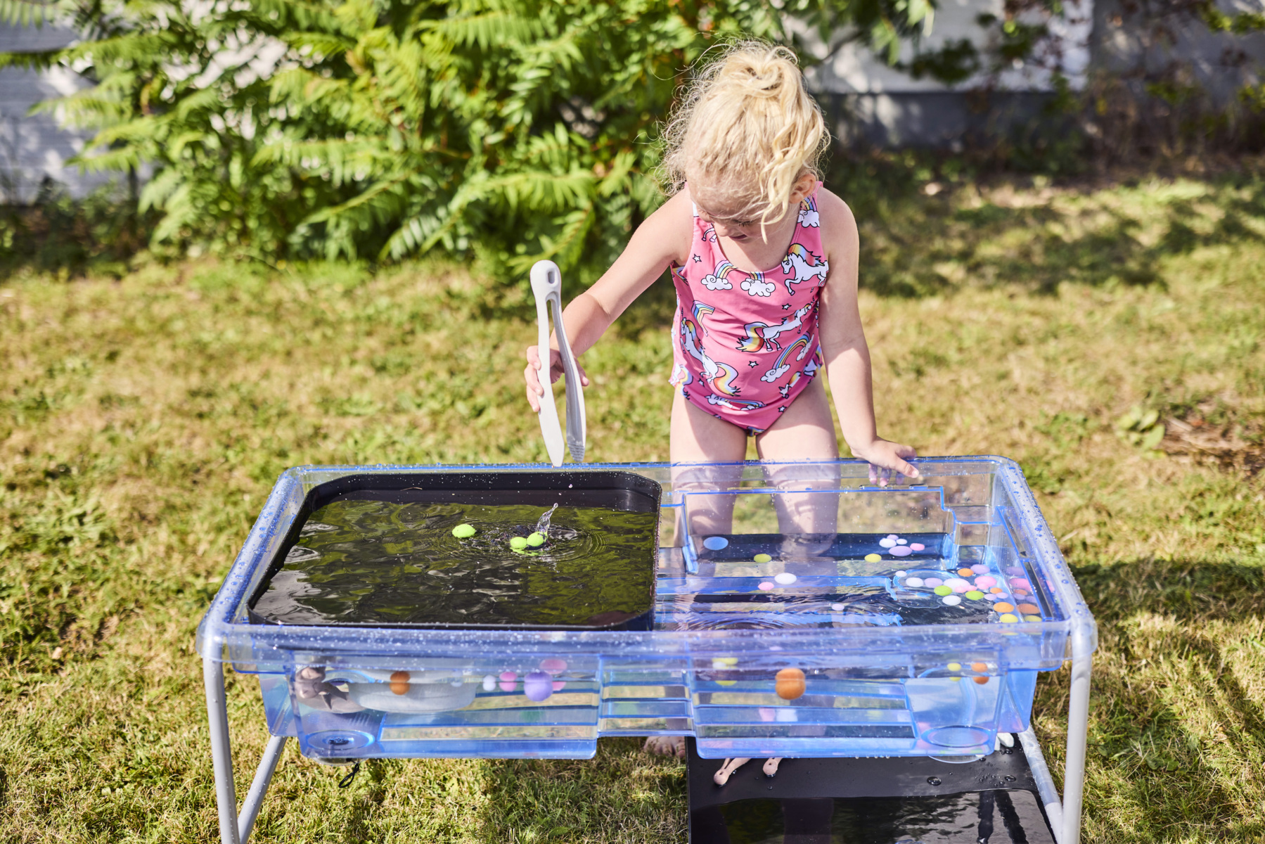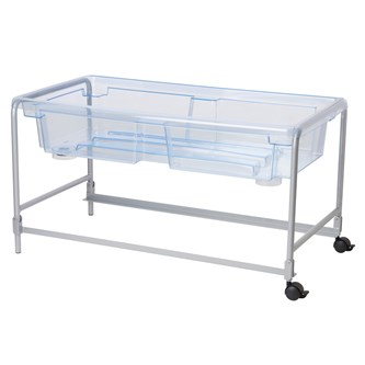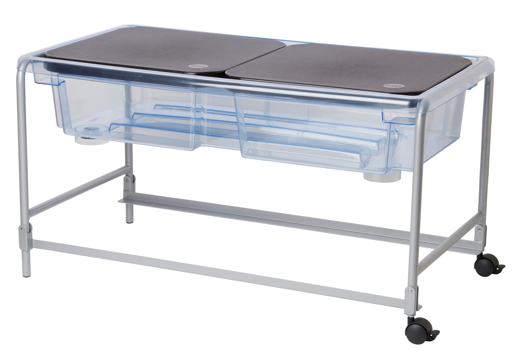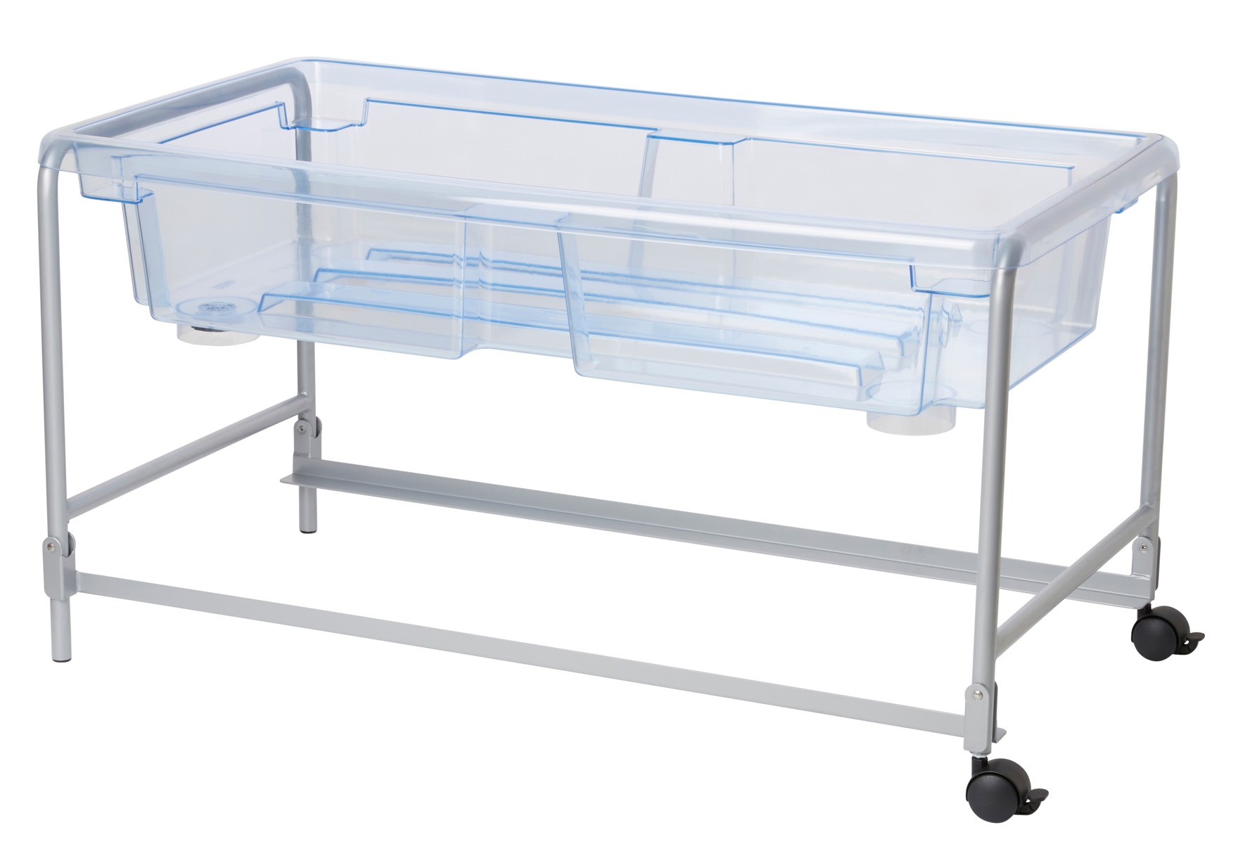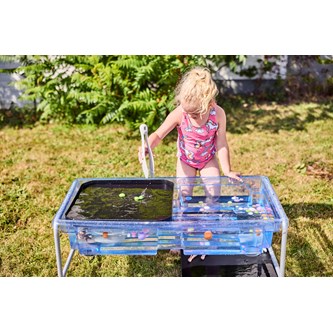 En stor sand- och vattenbalja i transparent plast med två medföljande brickor. Brickorna kan användas var för sig, och går då att skjuta i sidled, eller tillsammans och fungerar då som lock. Bordet är utrustat med avtappningskran i botten för enkel urtappning av vatten. Storlek balja: 110x58x23 cm. Stativ höjd 58 cm. Stativet har hjul på en ena kortsidan för förflyttning och kan fällas ihop för enkel förvarning när produkten inte används. Av stål. PVC-fri.