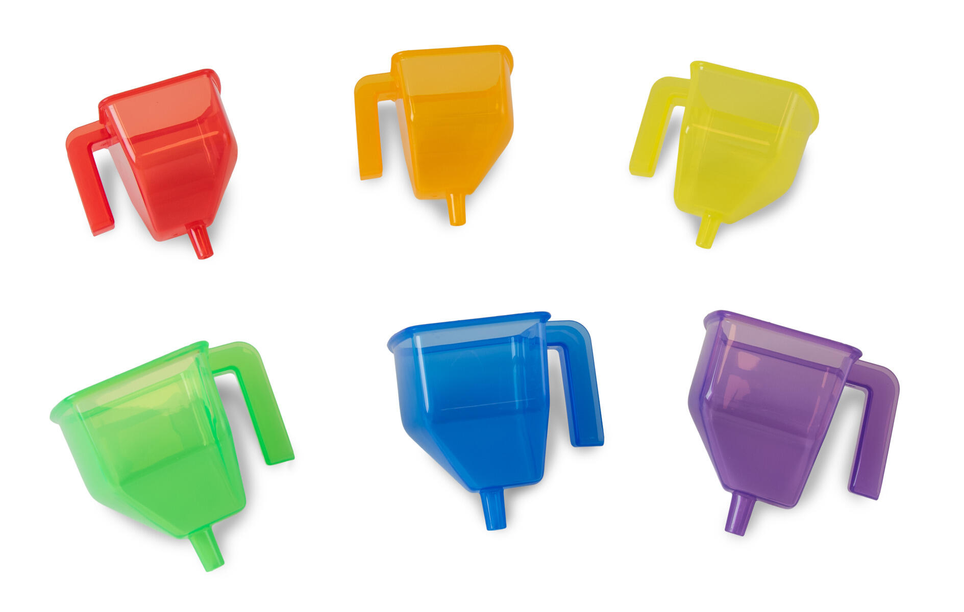 6 st/fp. Roliga färgtrattar för barn att använda i lek med sand och vatten. För färgblandning, matchning och för att experimentera med volym. Mått: 13x13x10 cm. Av ABS. PVC-fri. Från 18 månader.