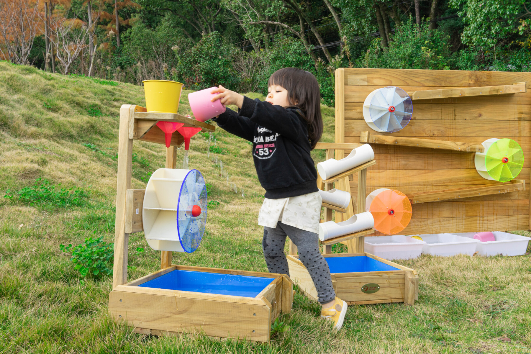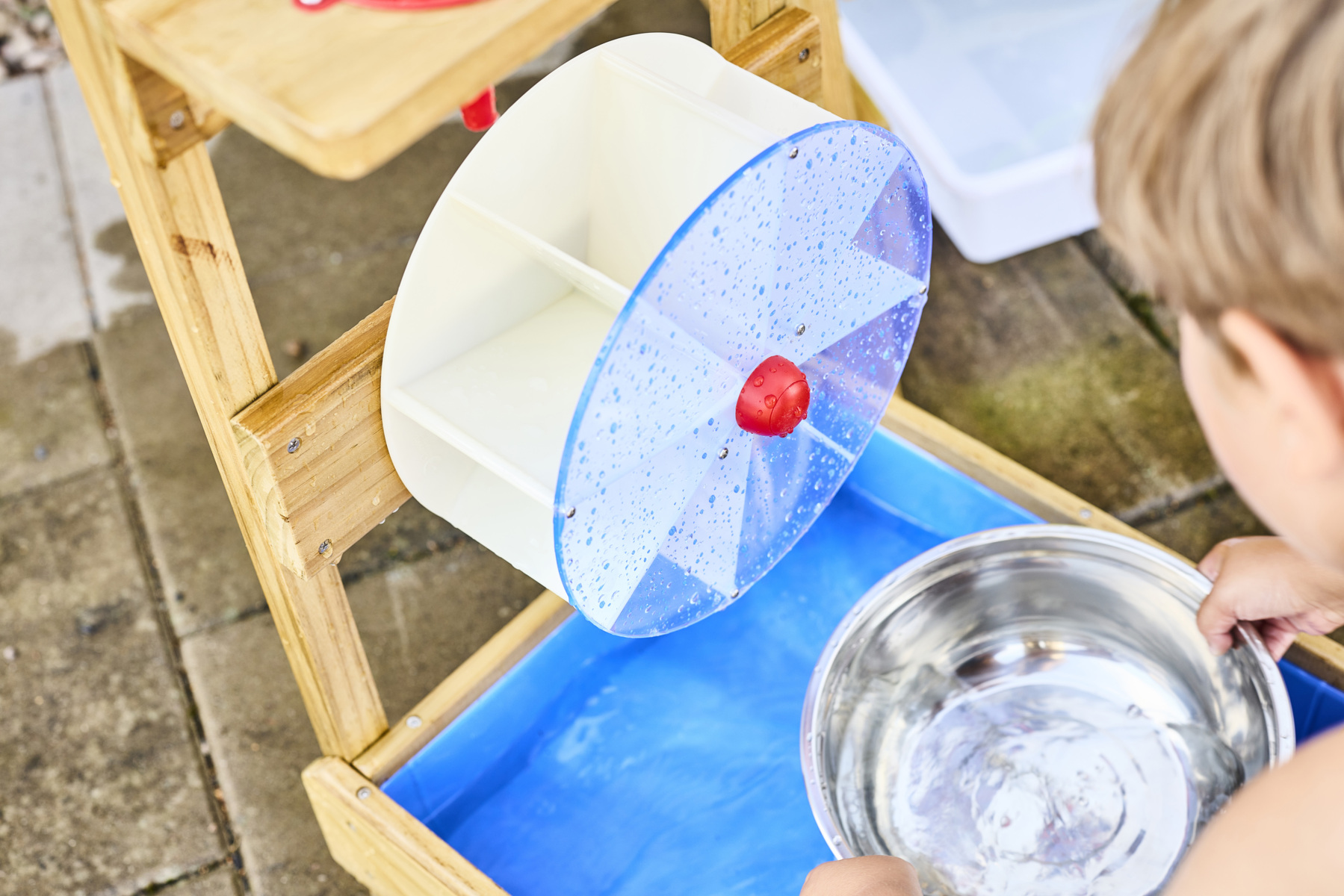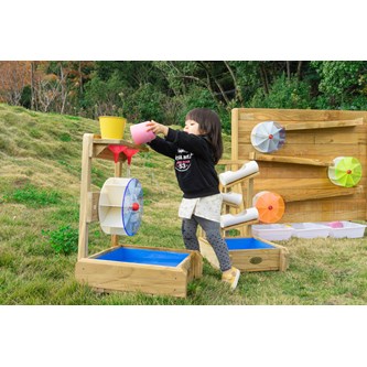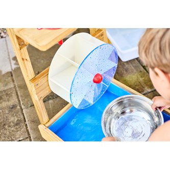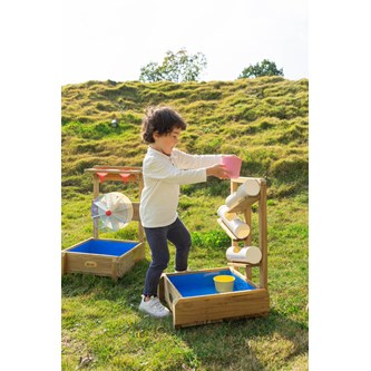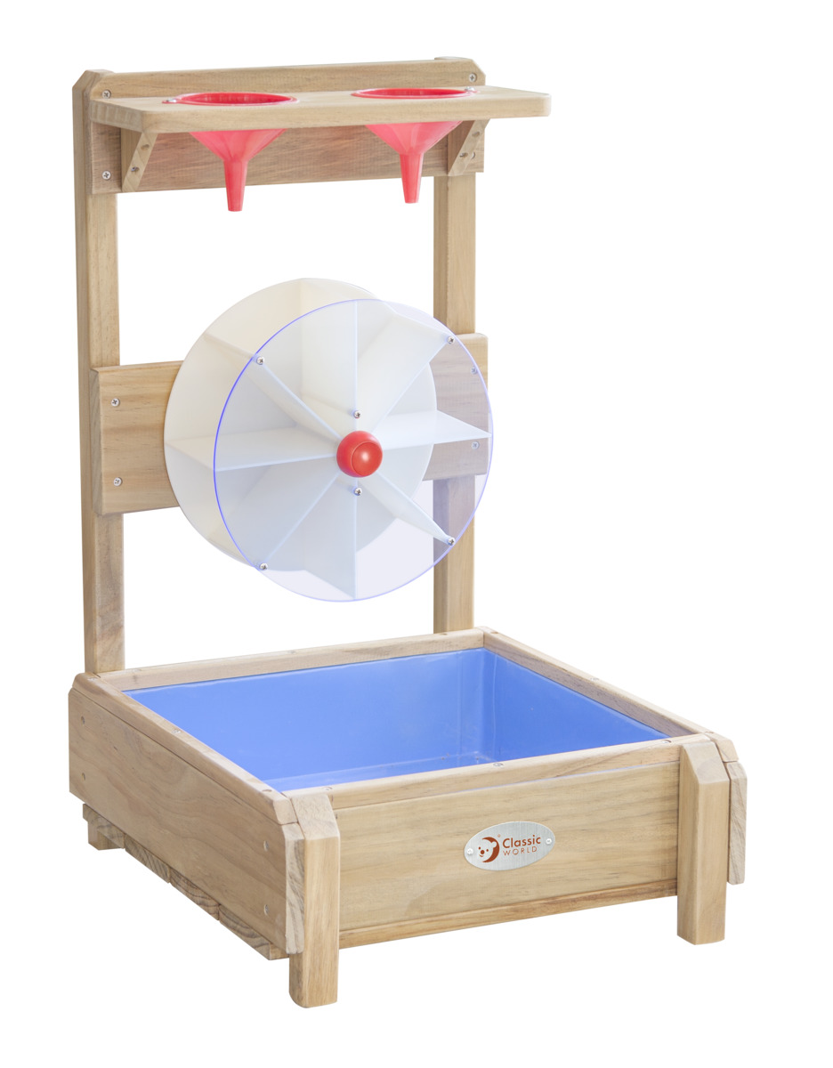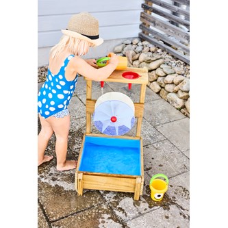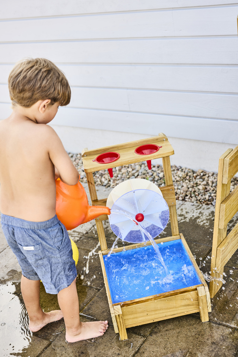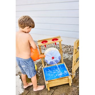 Häll vatten i trattarna och sätt snurr på hjulet. Tillverkat i träskyddsbehandlad furu med smidig uppsamling i botten. Mått: 38x44x65 cm. Från 3 år. Ämnad för utomhusbruk.