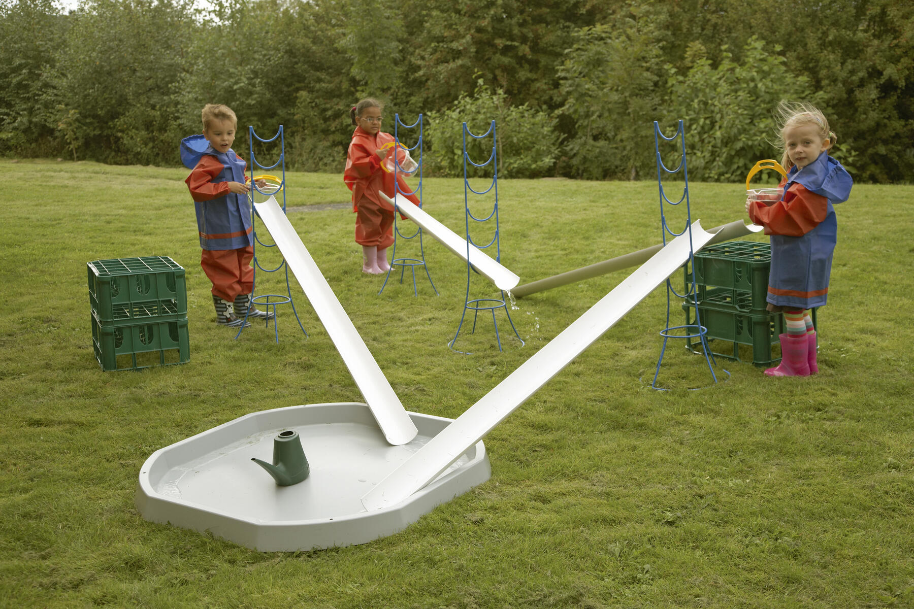 Vattenlek med lösa rännor. Barnen kan bygga och förändra på många olika sätt. 30 st träklossar, 6 st rännor 92 cm och 2 st fördelningsrännor 50 cm. Levereras av Eibe