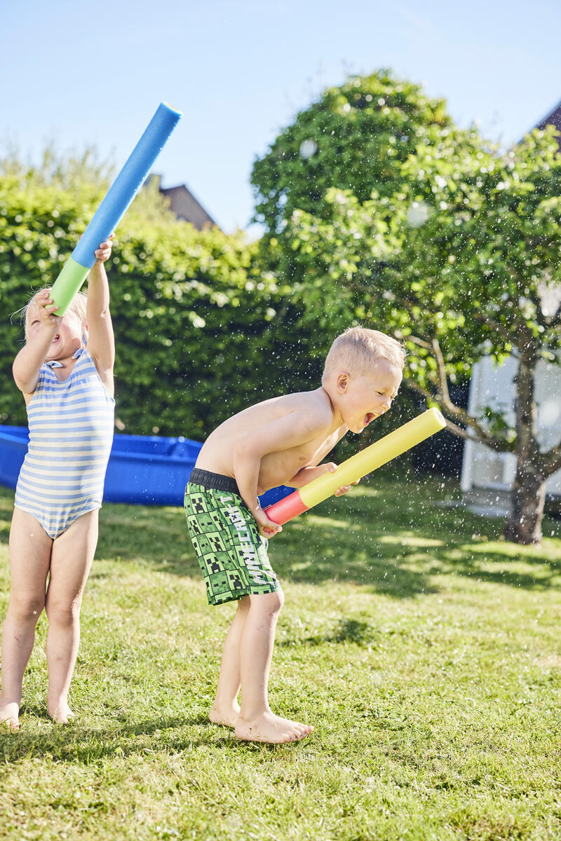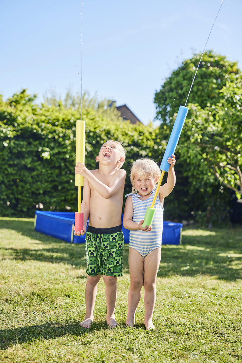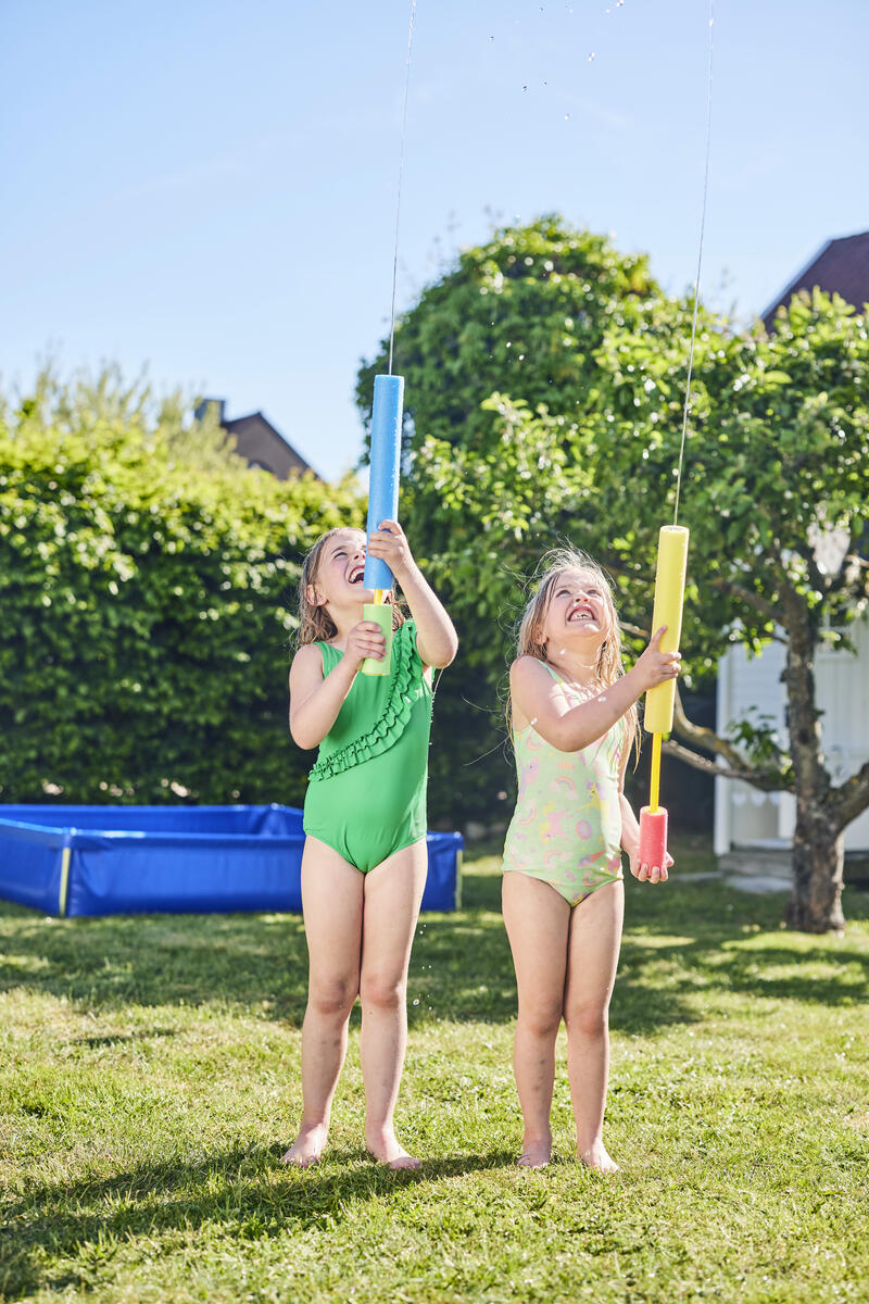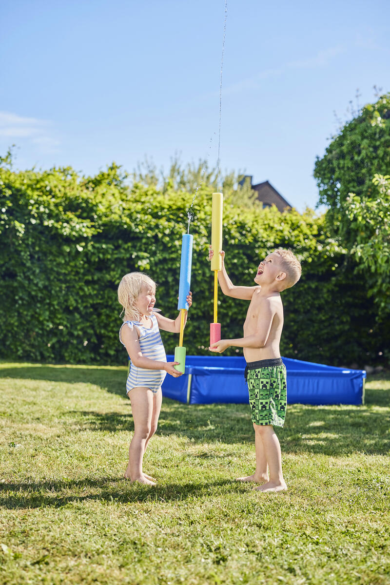 Rulla ut duken, ta fram trädgårdsslangen och sätt på vattnet! Enklare kan det inte bli att anlägga sin egen vattenrutschbana med duschfunktion. Barnen älskar den! Kan även användas på en plan gräsmatta. Den extra hala glidbanan består av en 6 m lång och 1 m bred UV-beständig polyetenfolie. Kommer med fästanordning och en uppblåsbar stoppkudde längst fram på banan. Av PVC, utan förbjudna ftalater. Från 3 år.