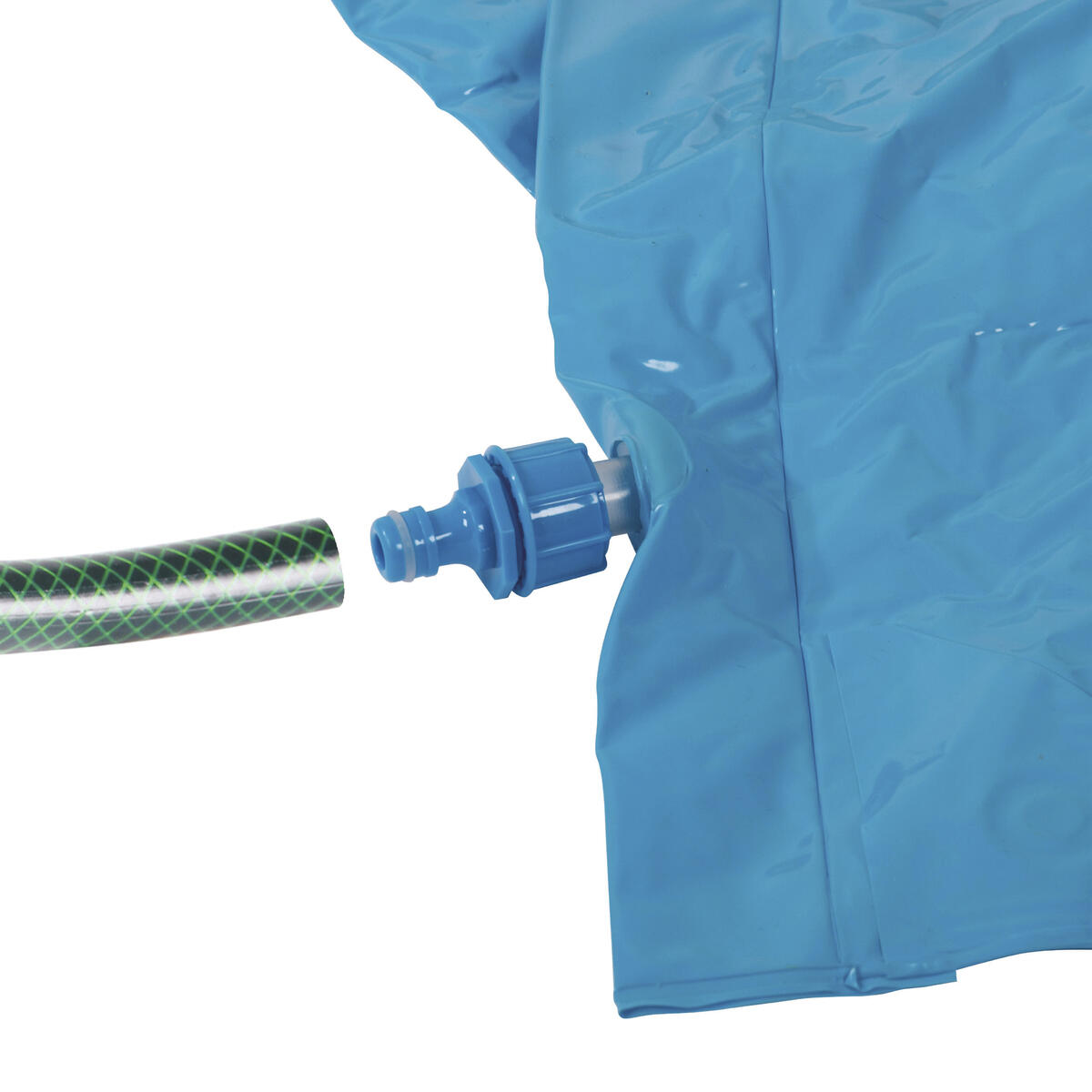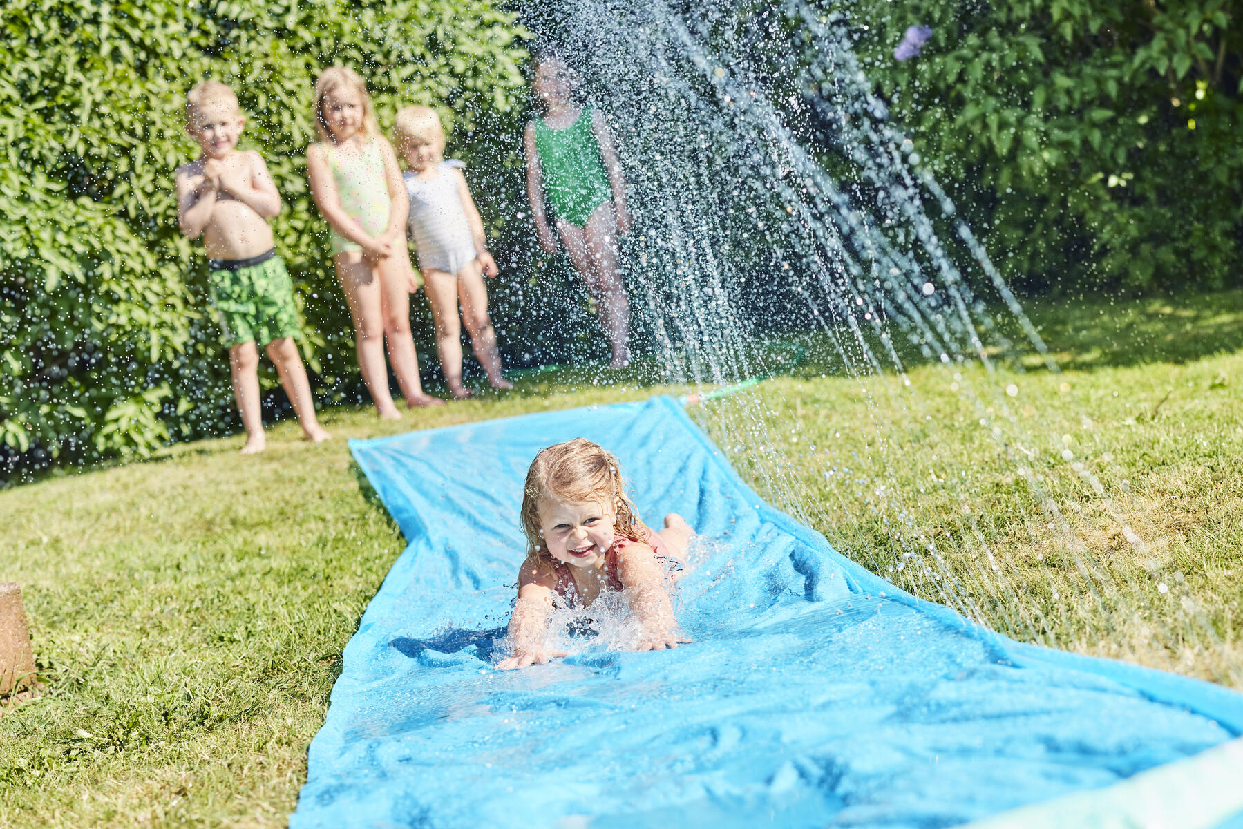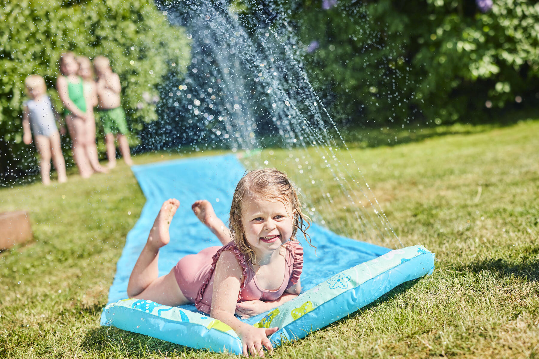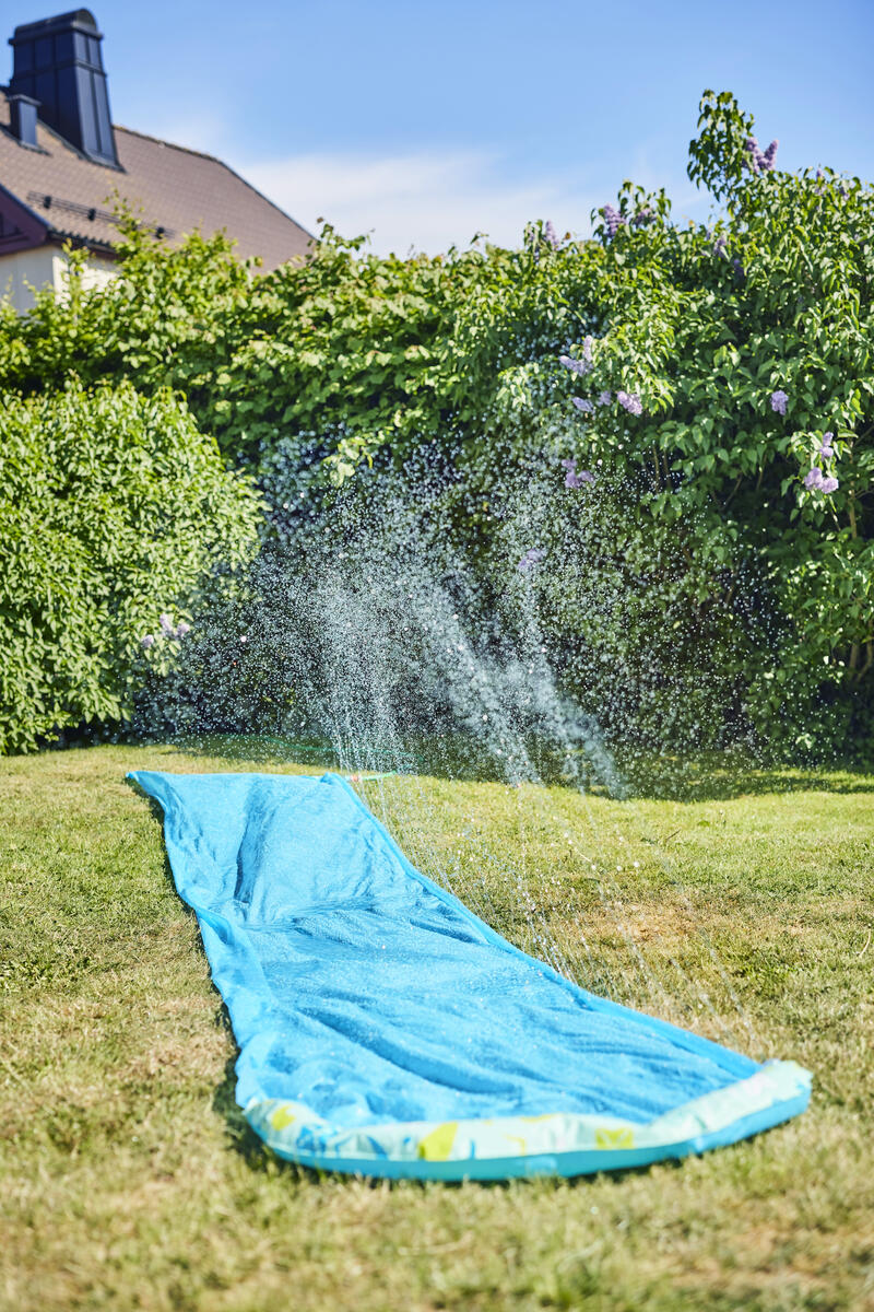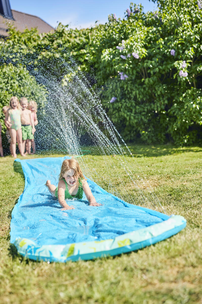 Rulla ut duken, ta fram trädgårdsslangen och sätt på vattnet! Enklare kan det inte bli att anlägga sin egen vattenrutschbana med duschfunktion. Barnen älskar den! Kan även användas på en plan gräsmatta. Den extra hala glidbanan består av en 6 m lång och 1 m bred UV-beständig polyetenfolie. Kommer med fästanordning och en uppblåsbar stoppkudde längst fram på banan. Av PVC, utan förbjudna ftalater. Från 3 år.