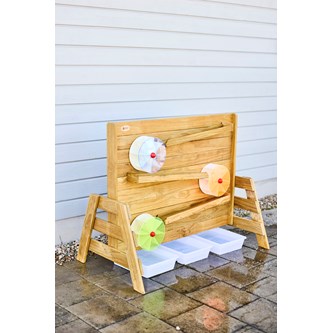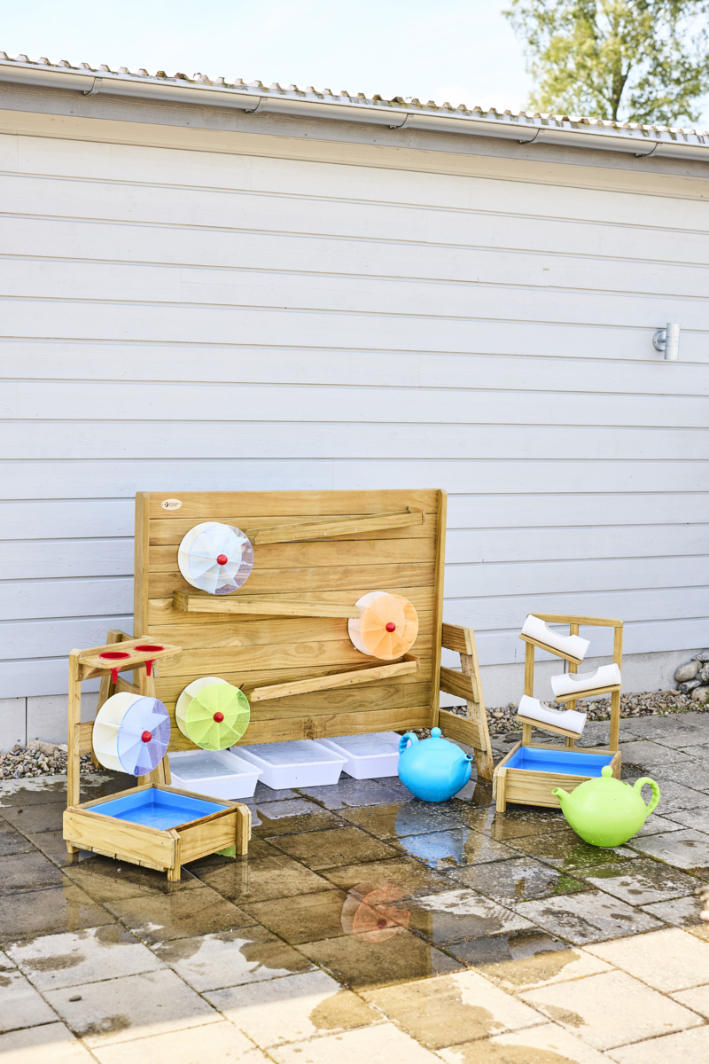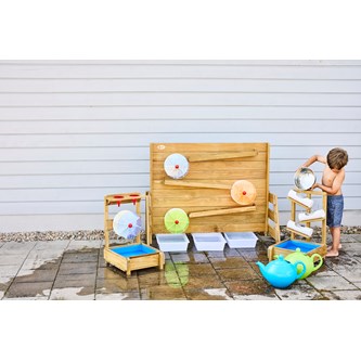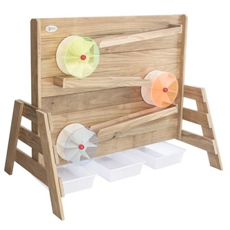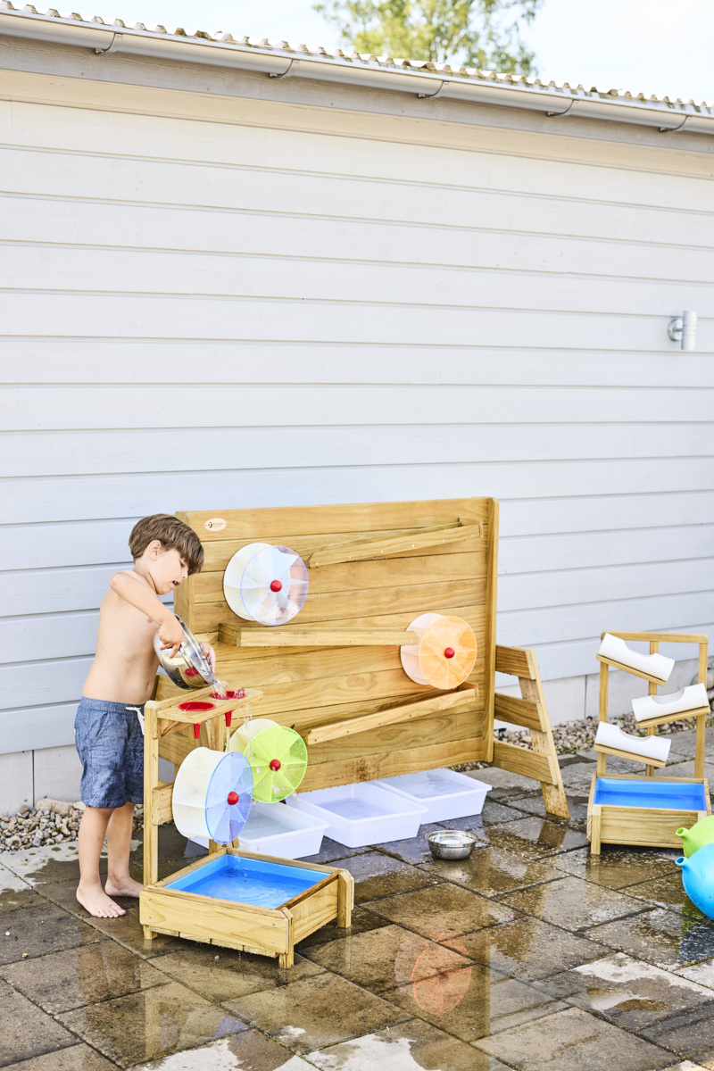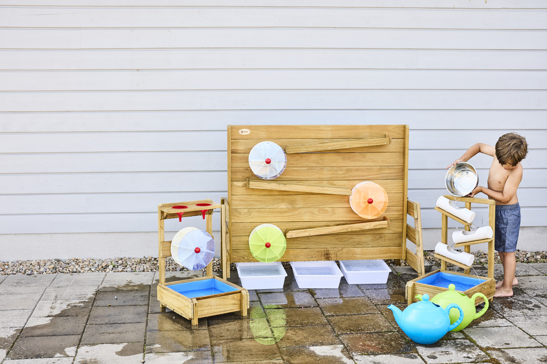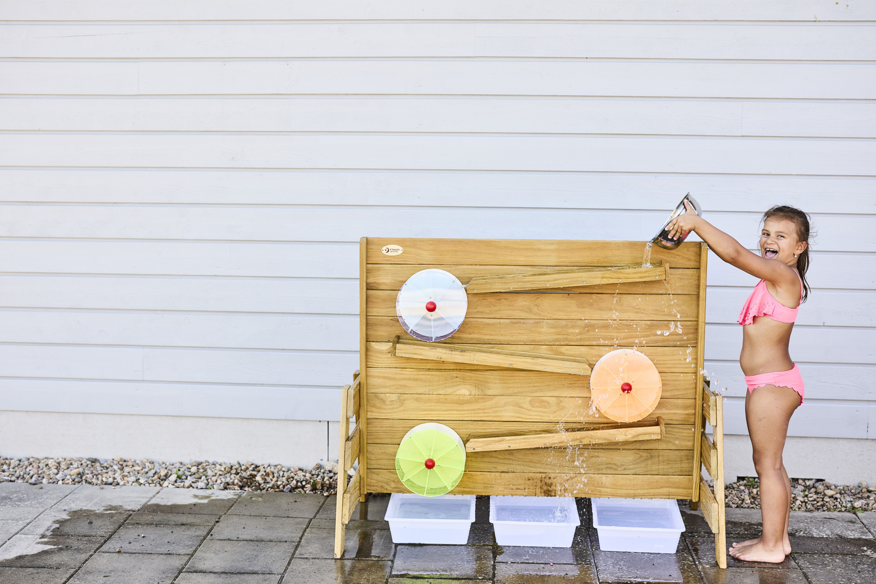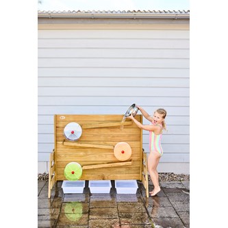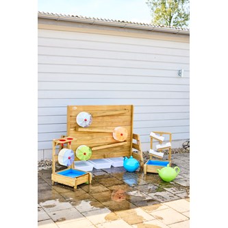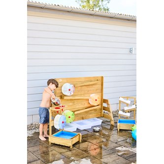 Underhållande vattenvägg med vattenlek på både fram- och baksida. Tillverkad i träskyddsbehandlad furu. Mått: 133x80x108,5 cm. PVC-fri. Från 3 år. Ämnad för utomhusbruk.