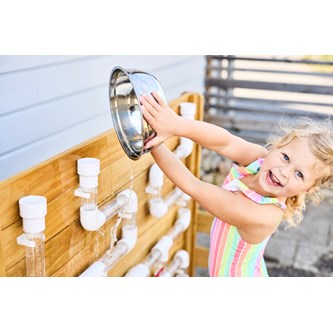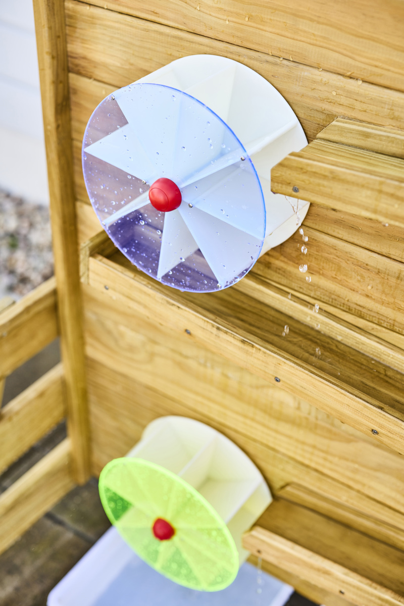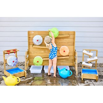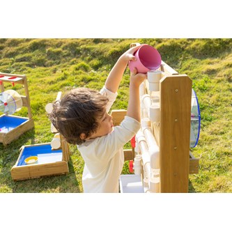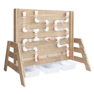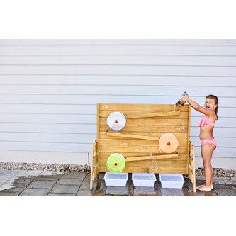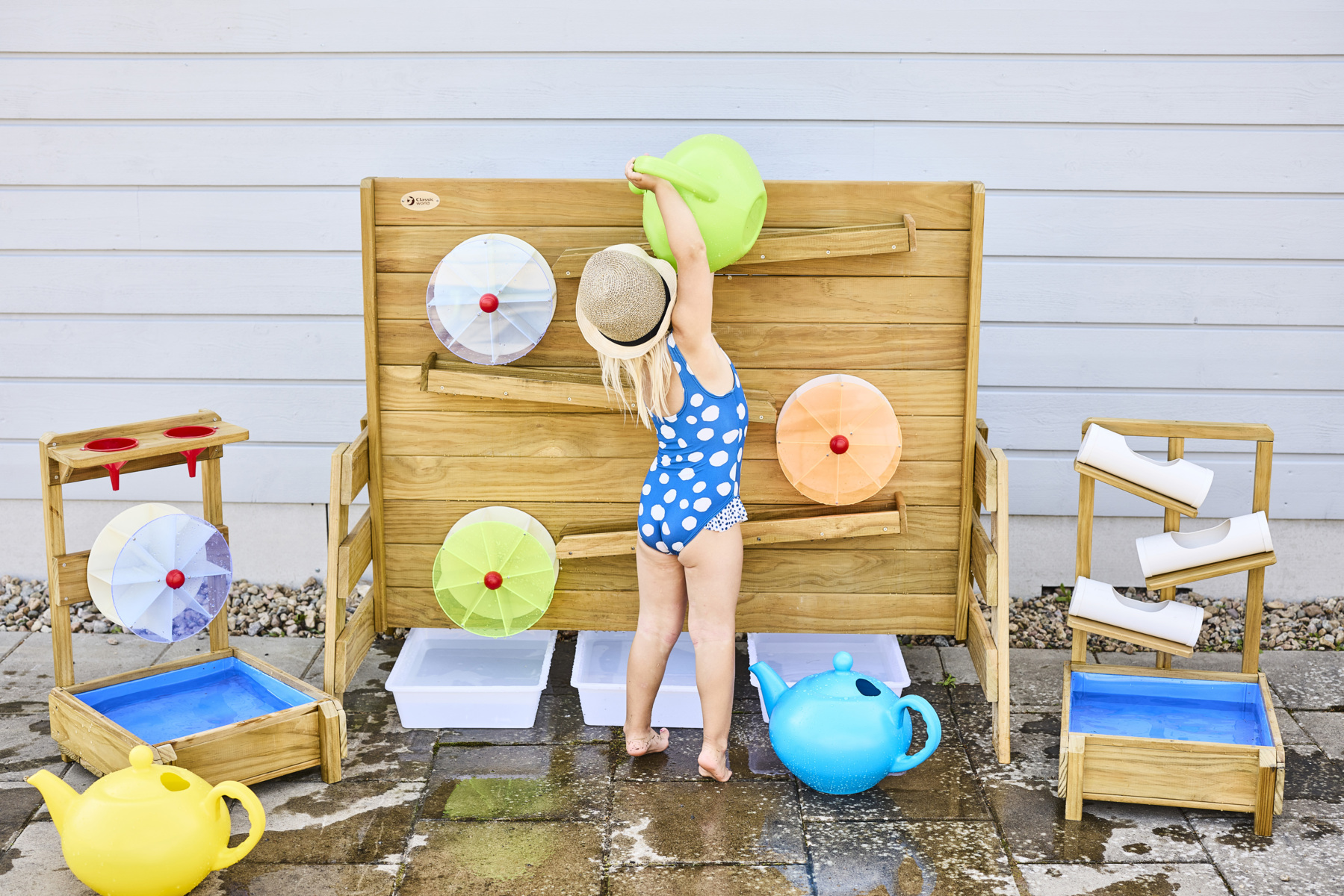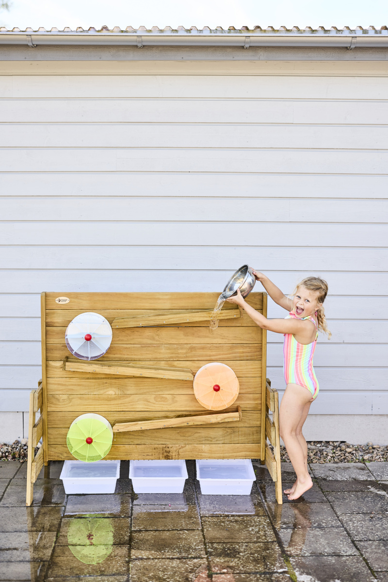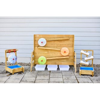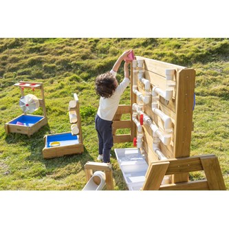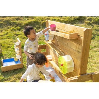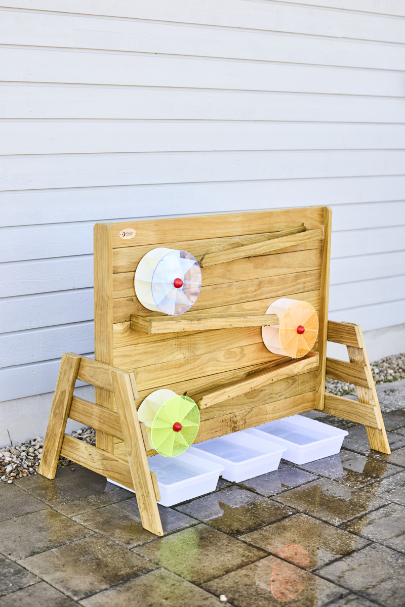 Underhållande vattenvägg med vattenlek på både fram- och baksida. Tillverkad i träskyddsbehandlad furu. Mått: 133x80x108,5 cm. PVC-fri. Från 3 år. Ämnad för utomhusbruk.
