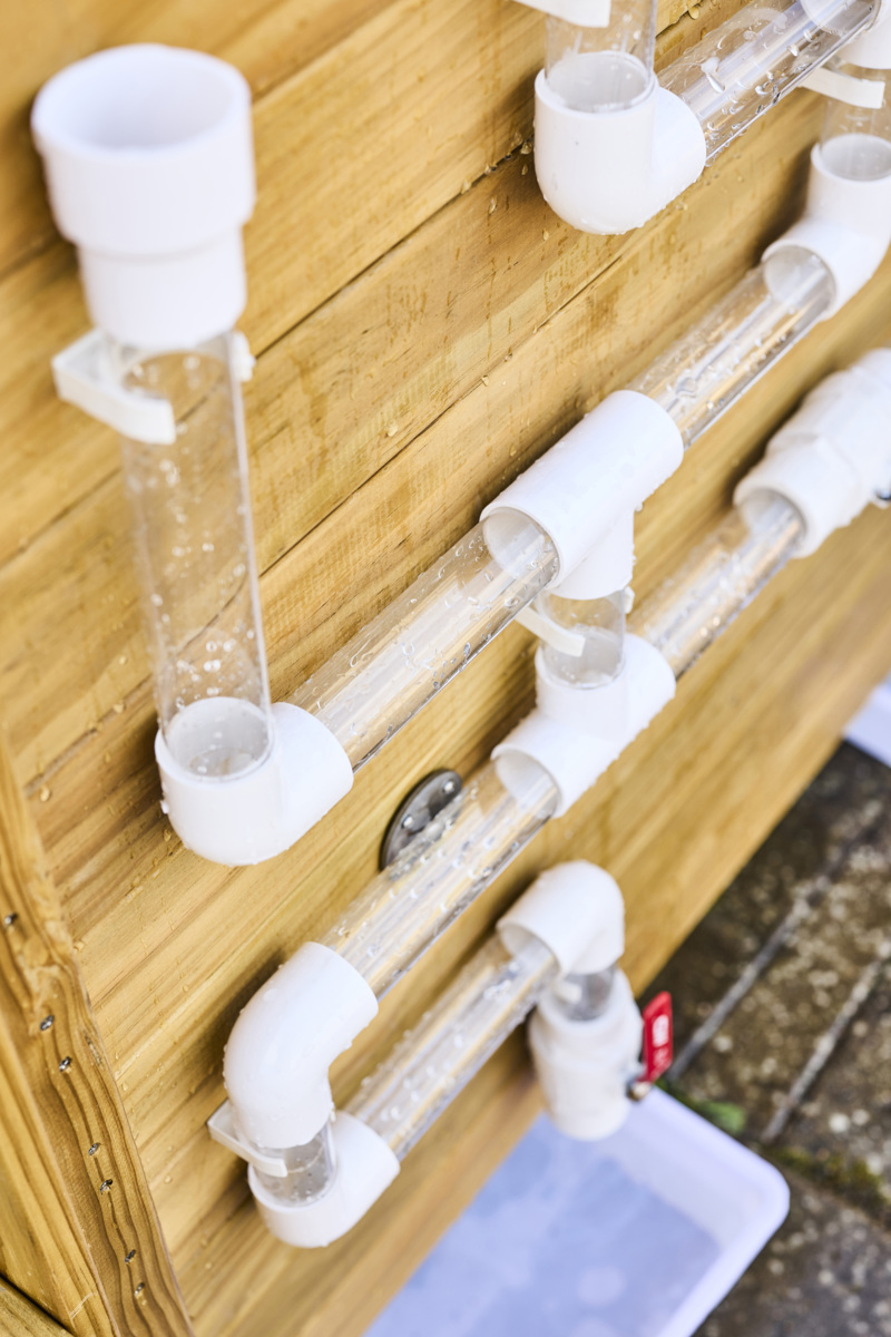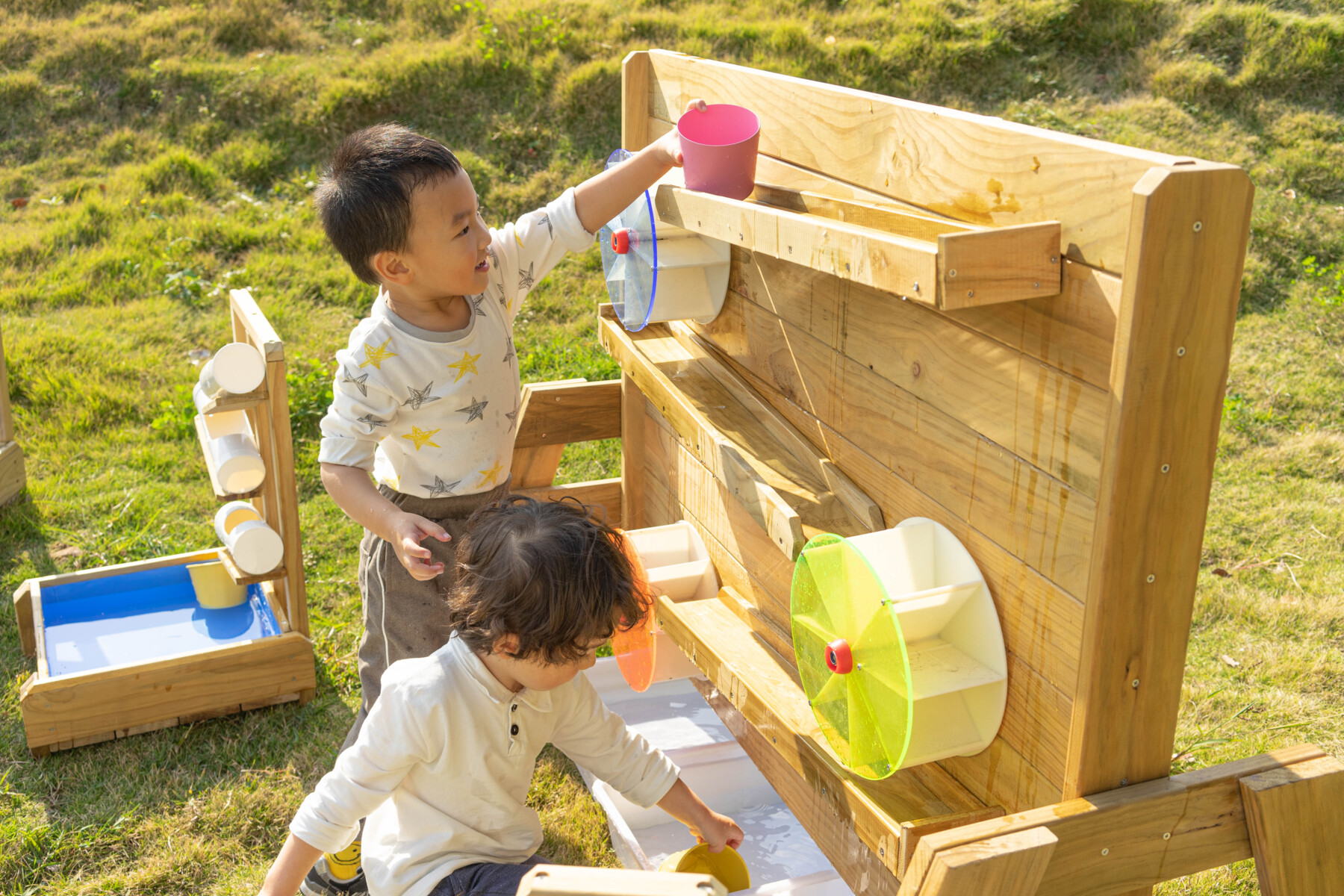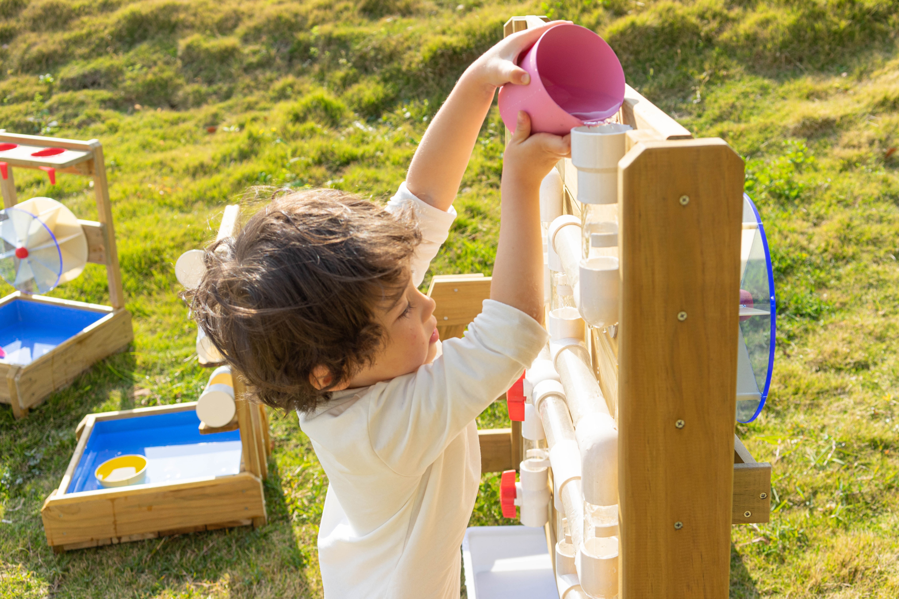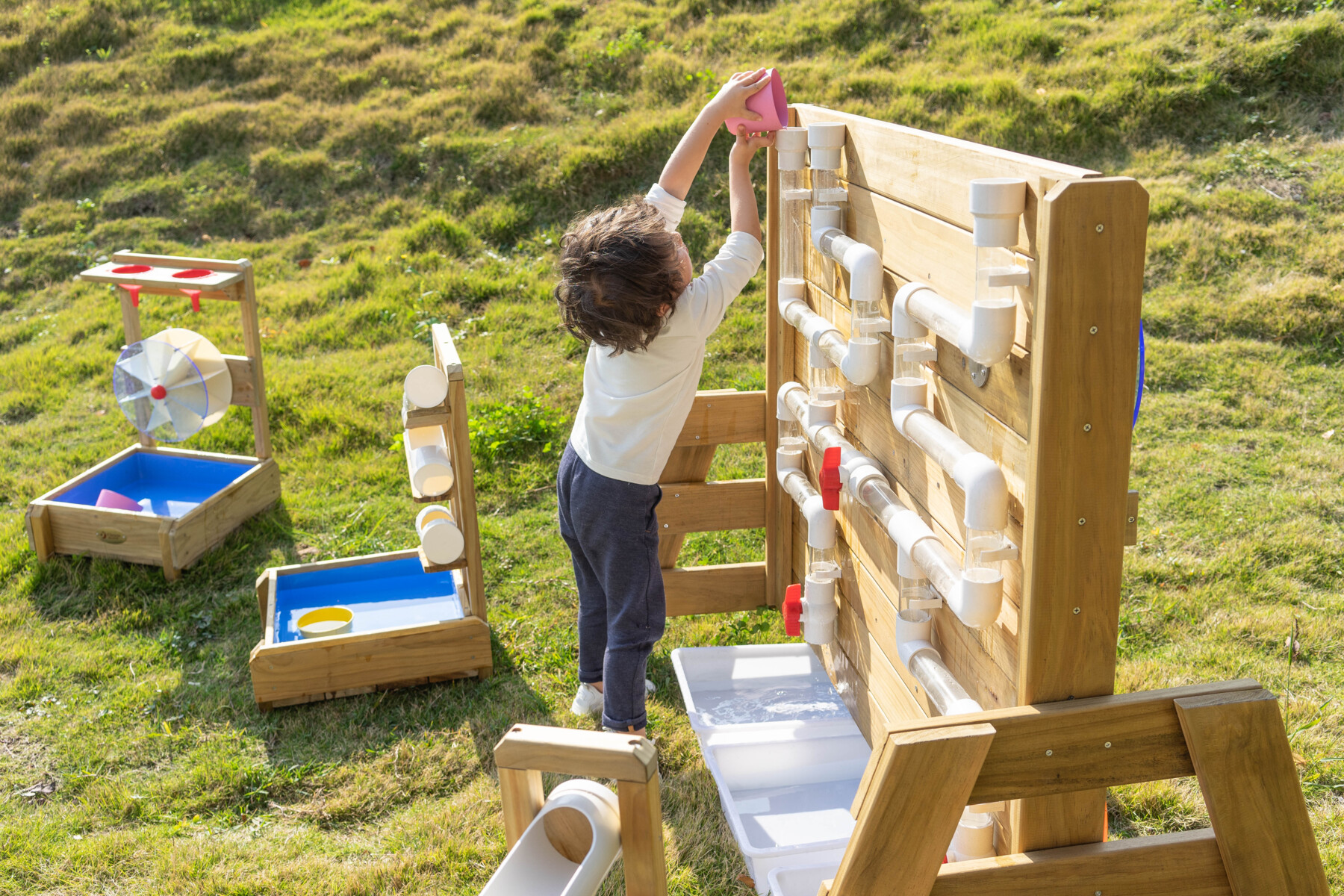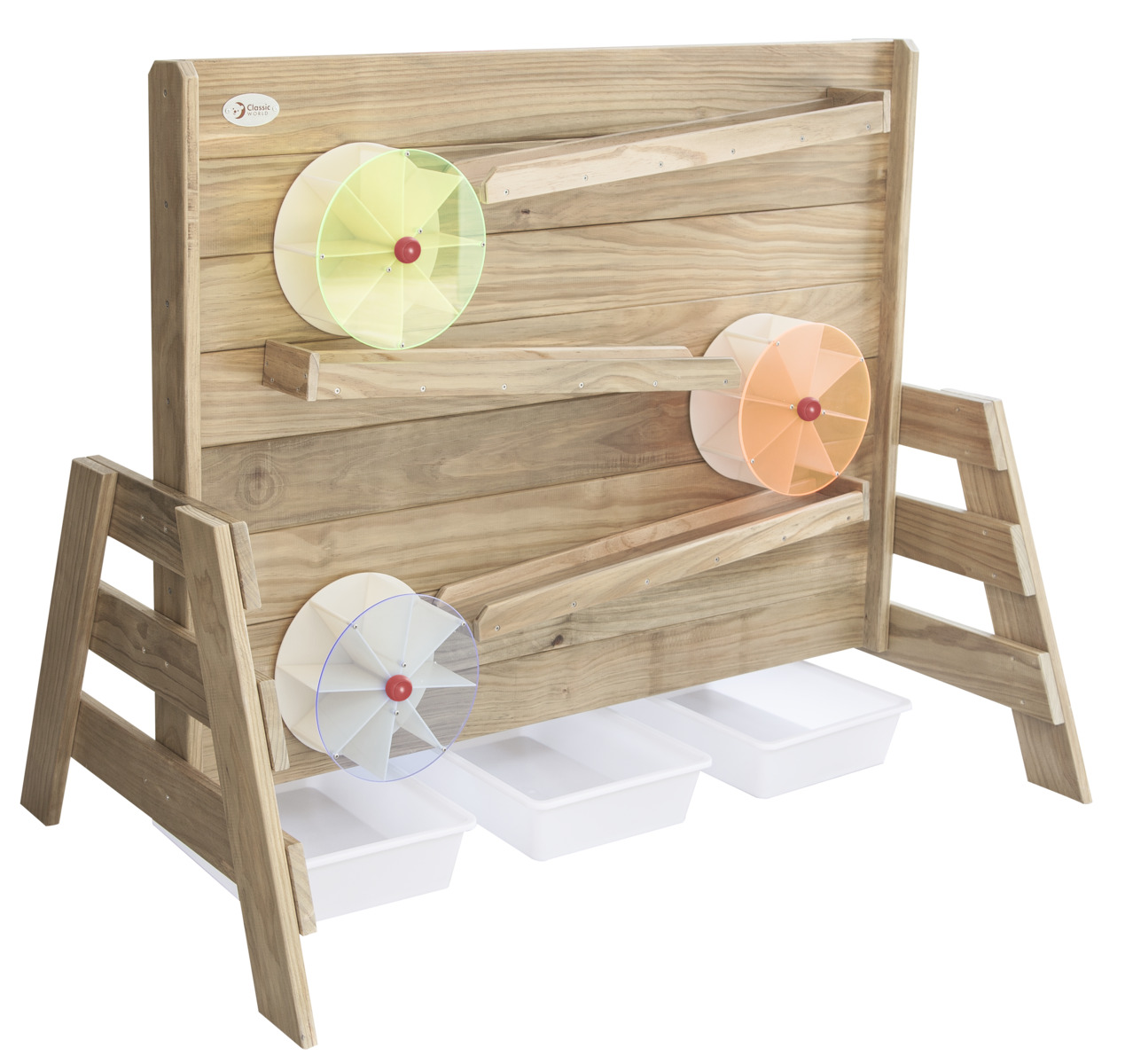 Underhållande vattenvägg med vattenlek på både fram- och baksida. Tillverkad i träskyddsbehandlad furu. Mått: 133x80x108,5 cm. PVC-fri. Från 3 år. Ämnad för utomhusbruk.