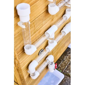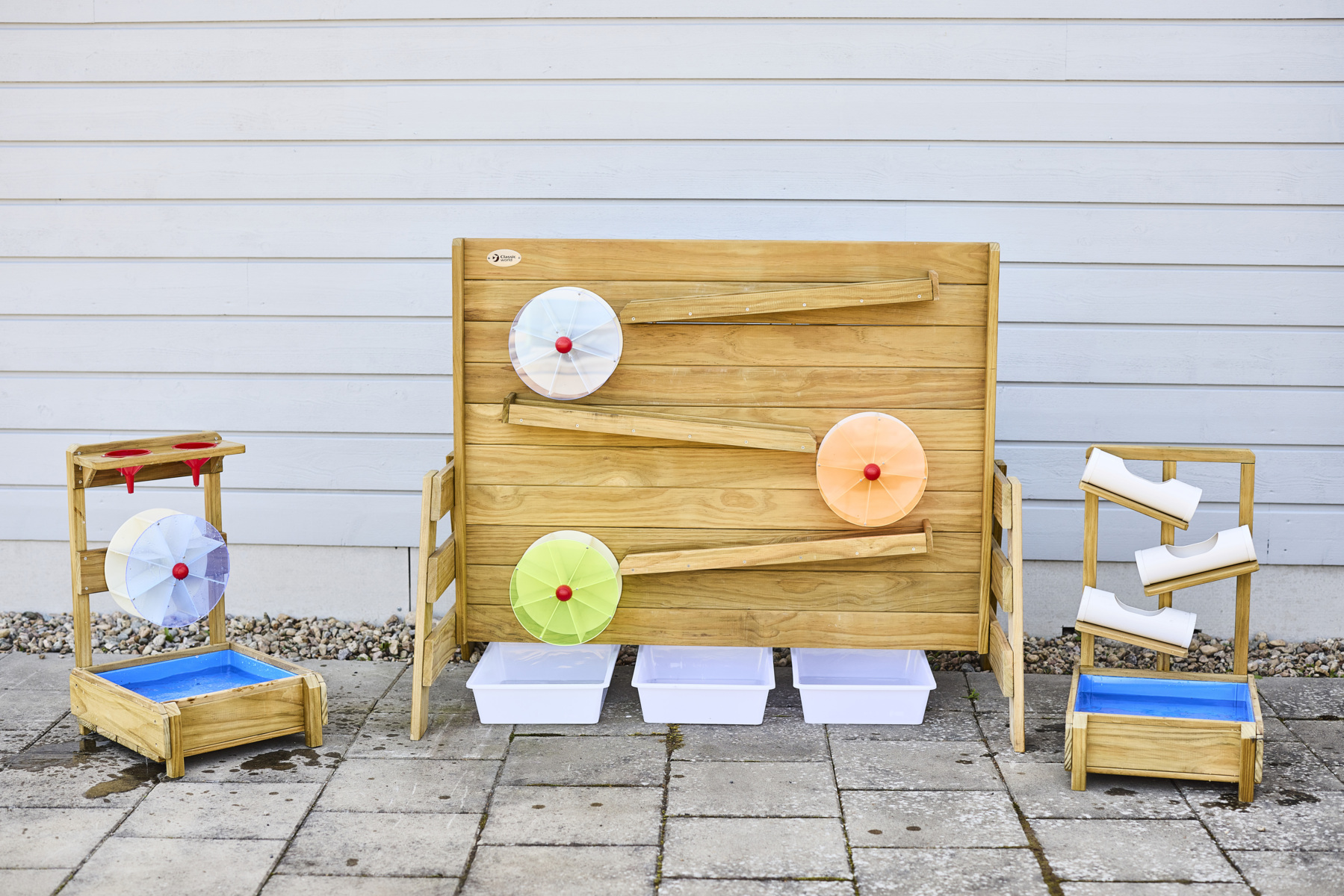 Vattenlek med lösa rännor. Barnen kan bygga och förändra på många olika sätt. 30 st träklossar, 6 st rännor 92 cm och 2 st fördelningsrännor 50 cm. Levereras av Eibe