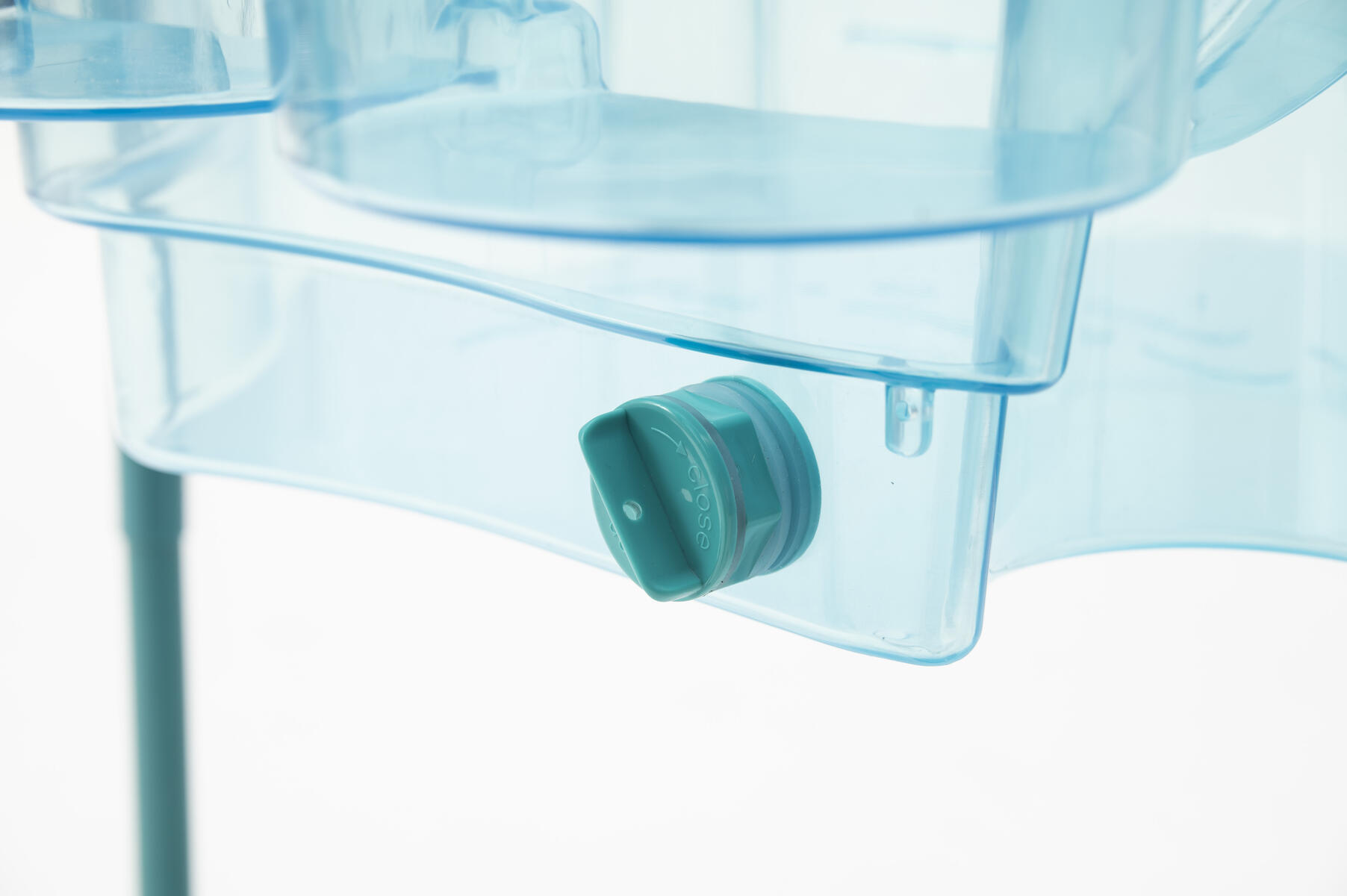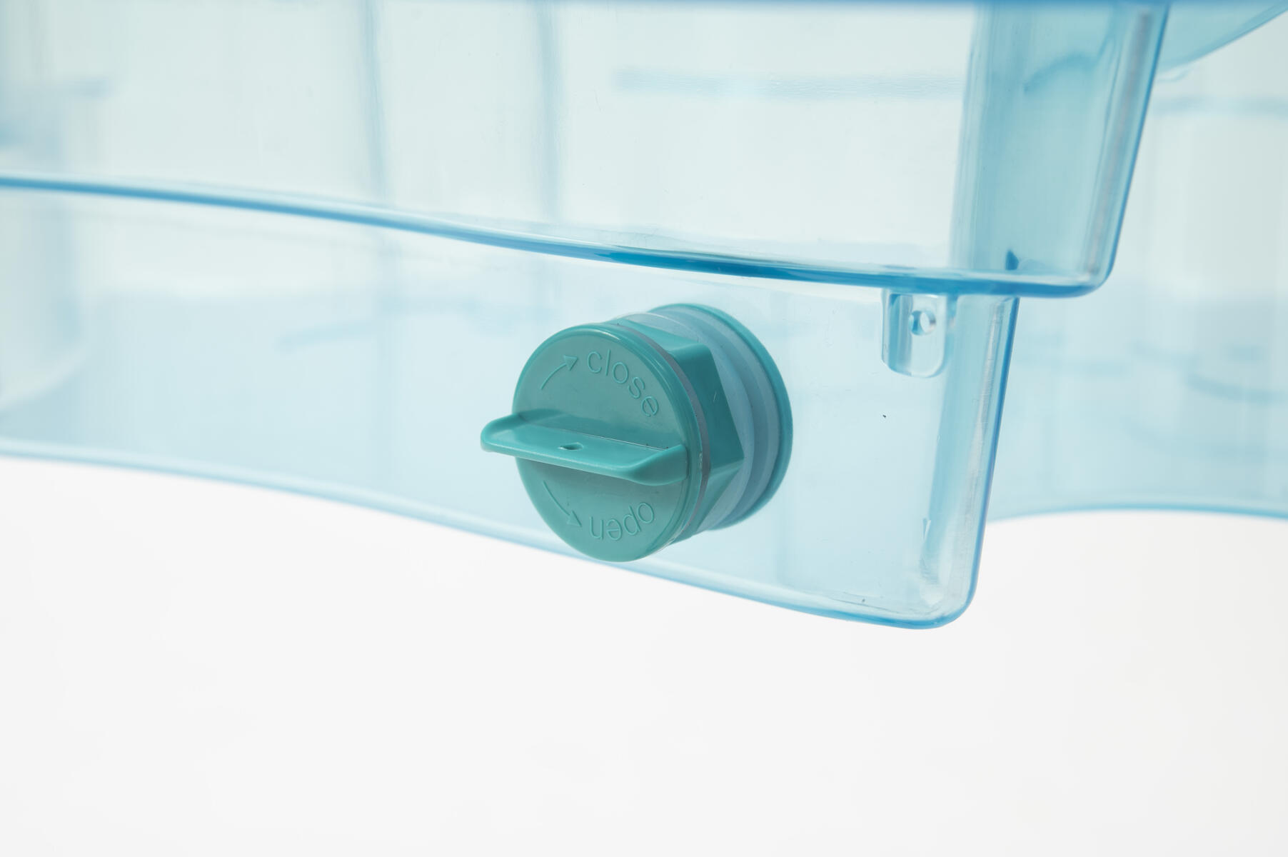 En stor sand- och vattenbalja i transparent plast med två medföljande brickor. Brickorna kan användas var för sig, och går då att skjuta i sidled, eller tillsammans och fungerar då som lock. Bordet är utrustat med avtappningskran i botten för enkel urtappning av vatten. Storlek balja: 110x58x23 cm. Stativ höjd 48,5 cm. Stativet har hjul på en ena kortsidan och kan fällas ihop för enkel förvarning när produkten inte används. Av stål. PVC-fri.