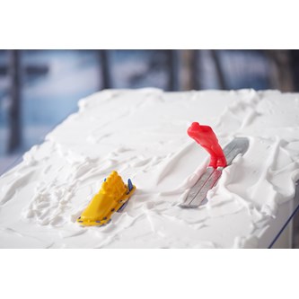 Bygg en 150 cm lång bana i snön med kurvor, backar och hopp. Låt barnen putta sin bob runt i tur och ordning. När alla barn puttat första varvet börjar man på nästa. Den som har ledningen börjar och först i mål vinner. Längd 10 cm. Av HDPE. PVC-fri. Från 3 år.