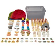 113 delar. En stor låda full med saker för att arbeta med berättandet utomhus. Tåliga bilar, hus, djur och figurer som man bygger upp sagovärldar med i både sol och regn. Med sagostenarna skapas en saga lättare då barnen får hjälp med olika delar i berättelsen. Den populära sagan om Bockarna Bruse görs med fördel utomhus. Med rullarna så skapar vi också en scen för olika berättelser – rulla dem i våt sand och stämpla dit figurer och bygg sagan tillsammans. Babblarna i naturgummi är också med och kan användas både i snö, regn och sol. Allt kan förvaras i sammetspåsarna och den vädertåliga förvaringslådan.