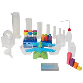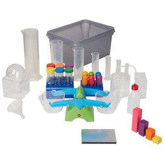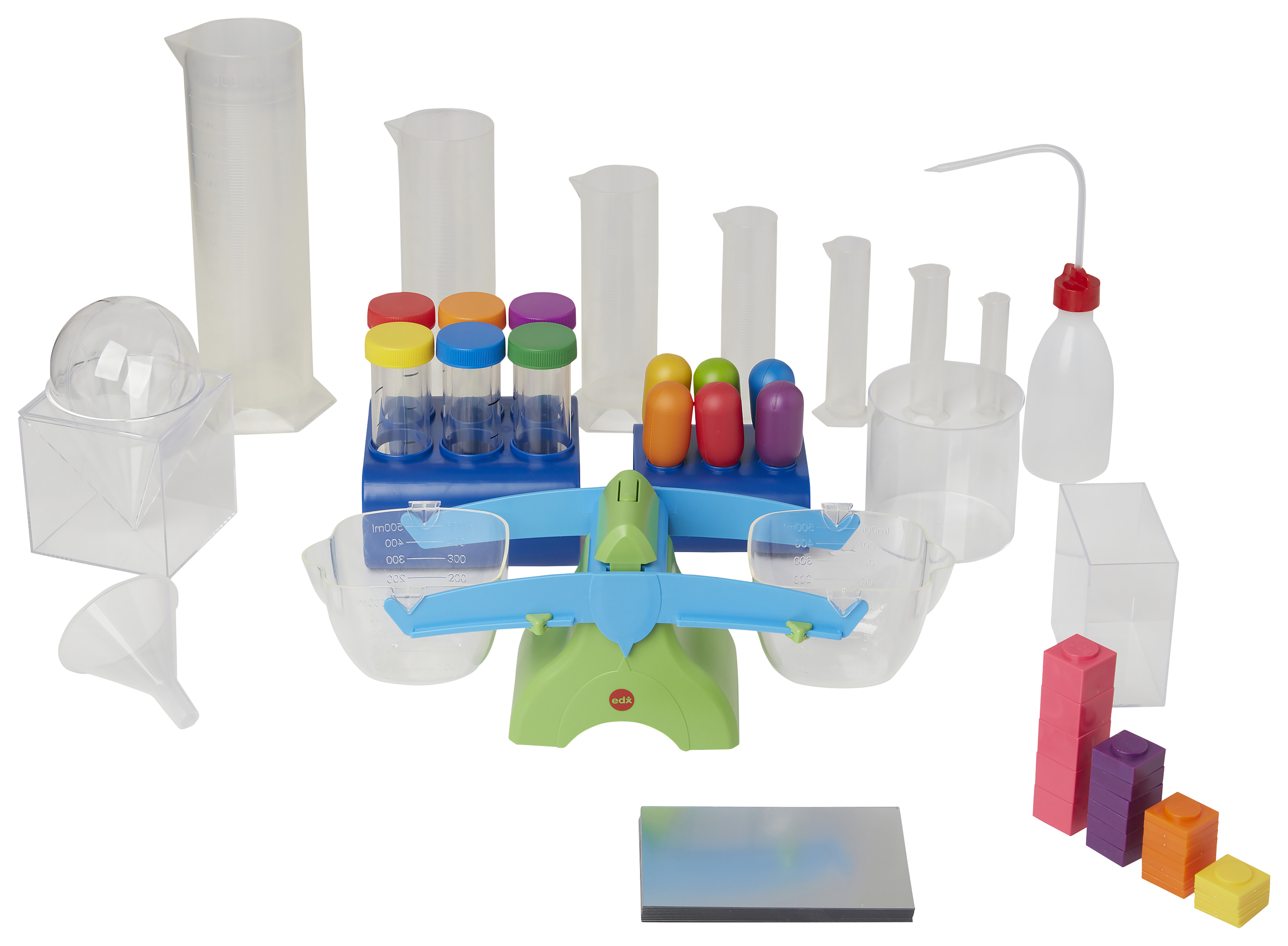118 delar. Utforska vattnet och dess egenskaper. Se hur mycket de geometriska formerna rymmer. Hur mycket väger vatten med hjälp av balansvåg och vikter? Utforska de olika aggregationsformerna fast, flytande och gas och låt barnen fundera på vad som händer med vattnet. Från 3 år.
