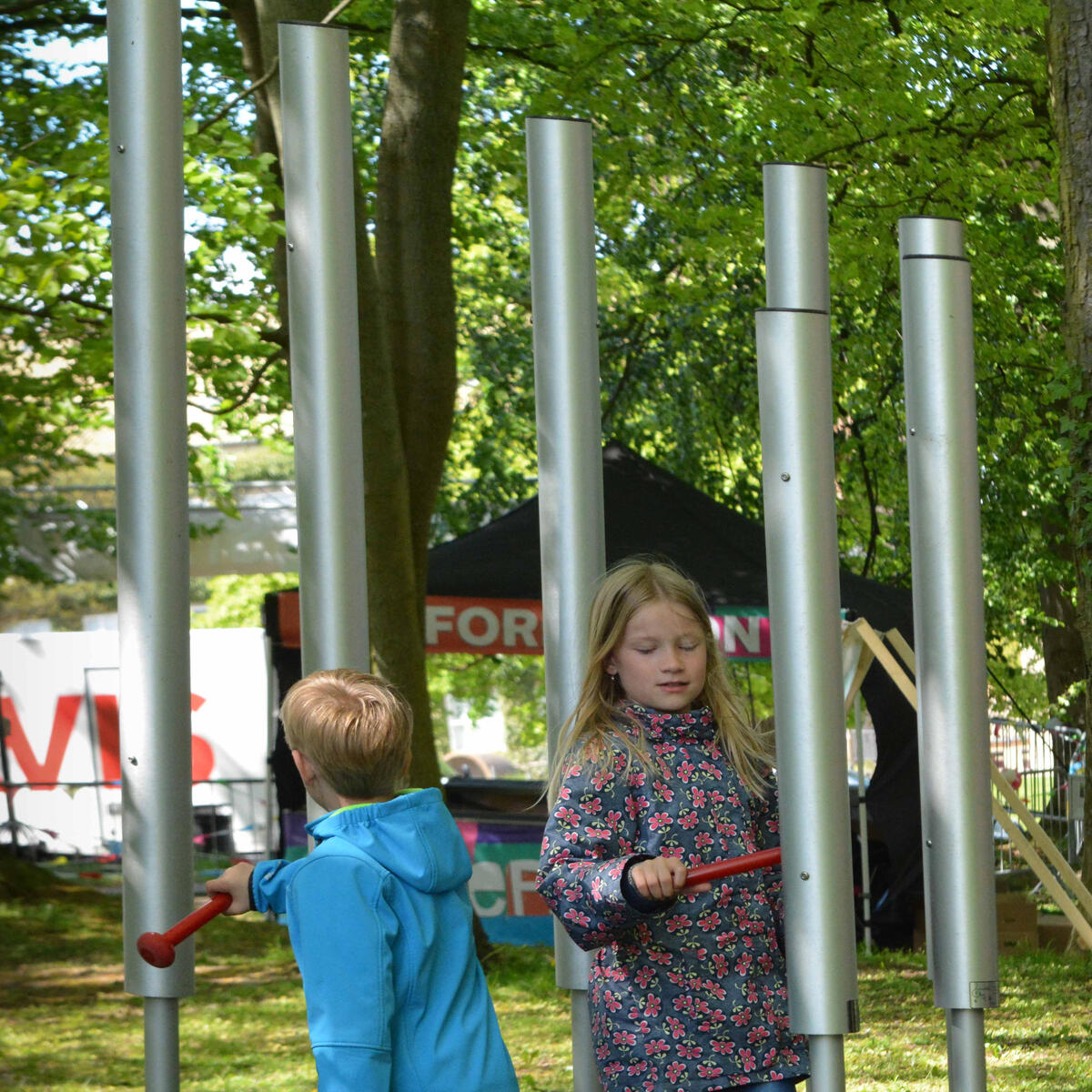 Tre par congas för utomhusbruk. Monterade på stolpe av rostfritt stål. Trumskinn av slitstark ABS.