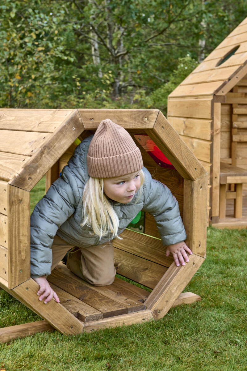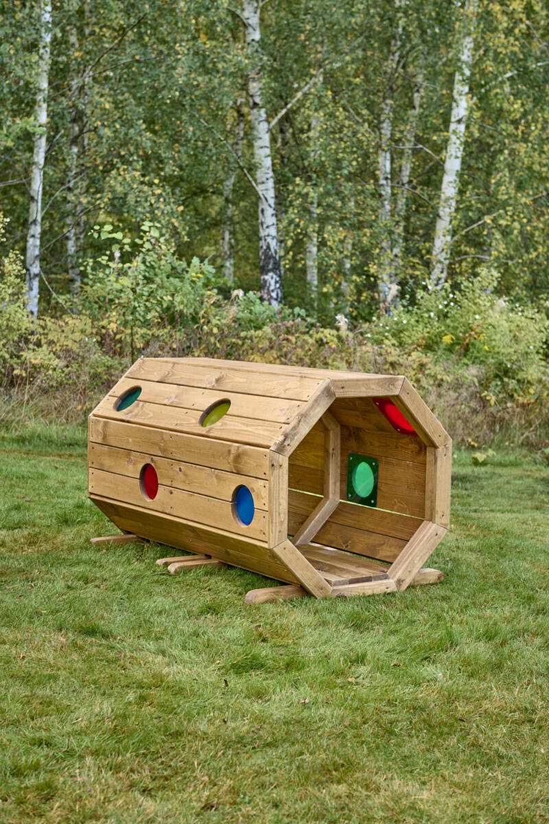 Ett mysigt krypin i utemiljön som inger trygghet. Ljuset faller fint in mellan de transparent färgade fönsterna och skapar sensoriska upplevelser som stimulerar det visuella sinnet. Kojan är öppen för olika typer av lek och passar även utmärkt som reträttplats om barnen vill dra sig undan en stund och sitta och iaktta vad som händer runt omkring dem. Med en sida som är helt öppen kan både barnen och pedagogerna att ha överblick över vad som händer på gården. Av FSC-certifierad furu. Mått: 112x134x156 cm. Kojan skall förankras, 2 set av artnr 151134 krävs, säljs separat.