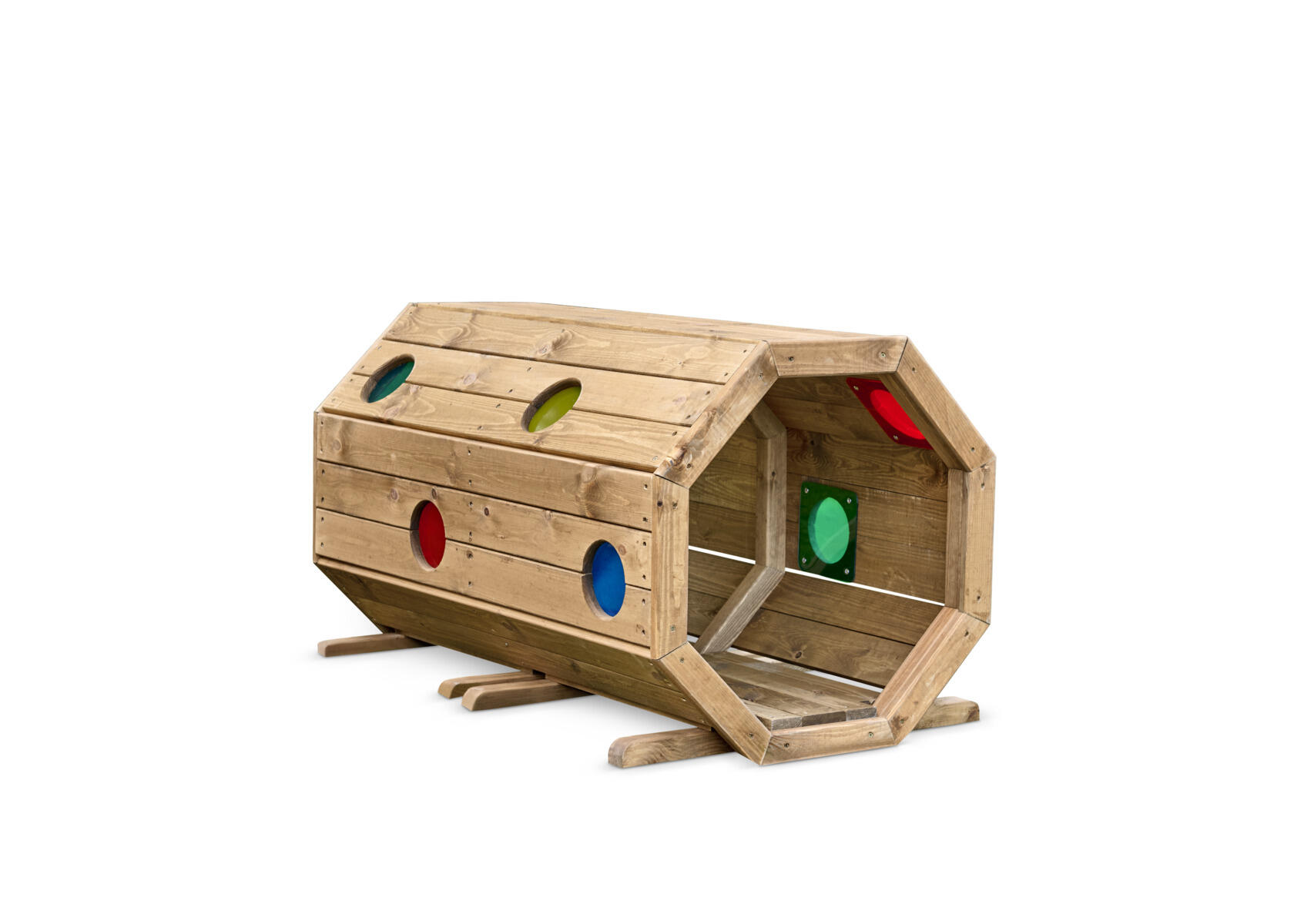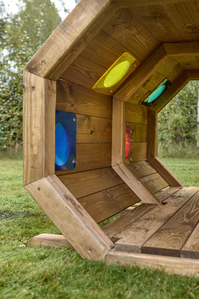 En mysig tunnel att krypa igenom och som uppmuntrar till aktiv utomhuslek och är perfekt för motorisk träning eller att leka gömme och tittut-lek. När ljuset bryts genom det färgade plexiglaset skapas fantastiska sensoriska upplevelser som stimulerar det visuella sinnet. Tillverkad av FSC-certifierad furu som är ytbehandlad med en vattenbaserad lack. För bästa hållbarhet rekommenderar att man behandlar produkten varje år. För markförankring behövs 4 st av 161297, eller 151133 för ytmontering. Levereras omonterad.