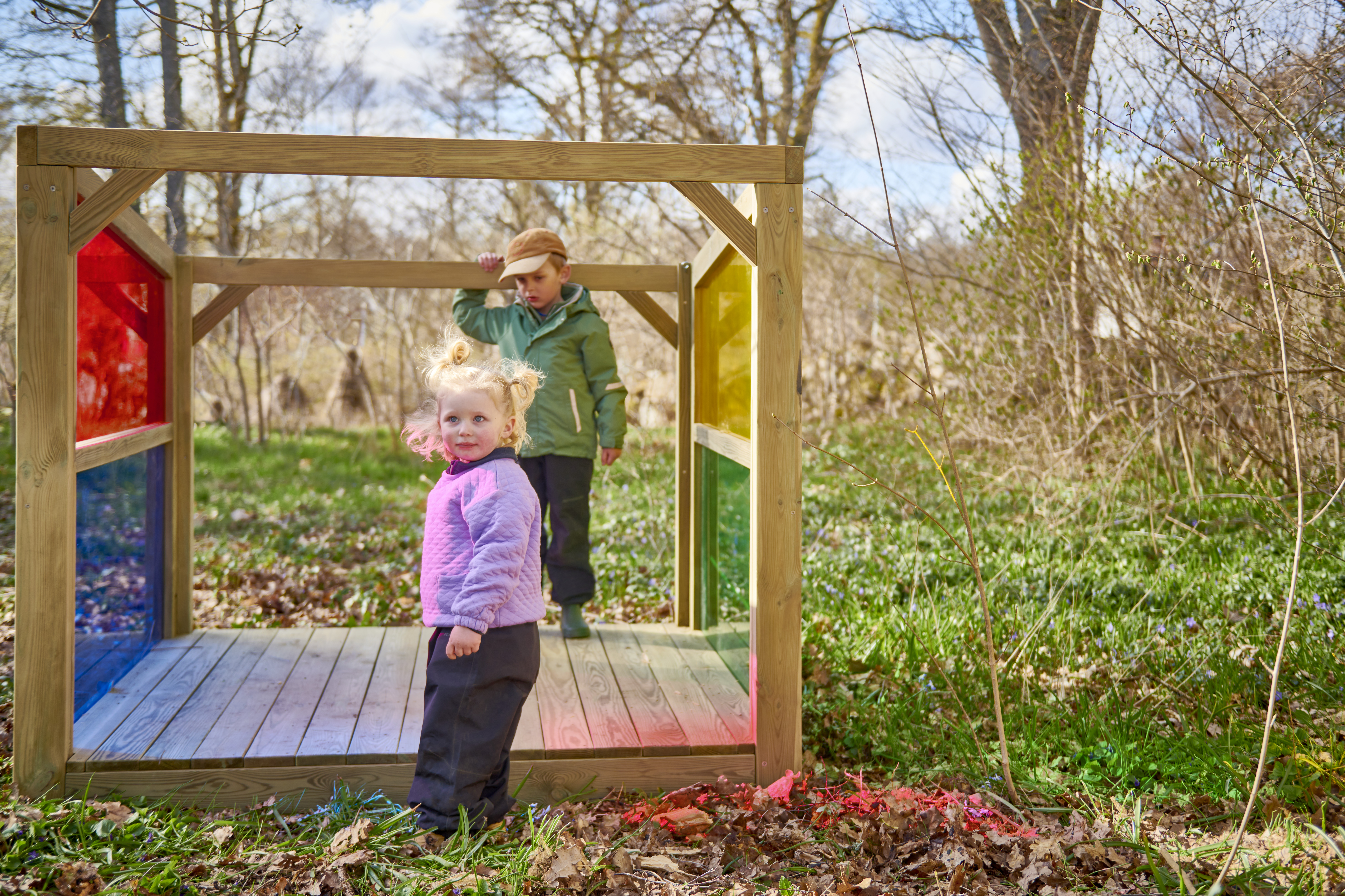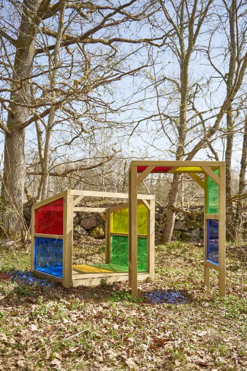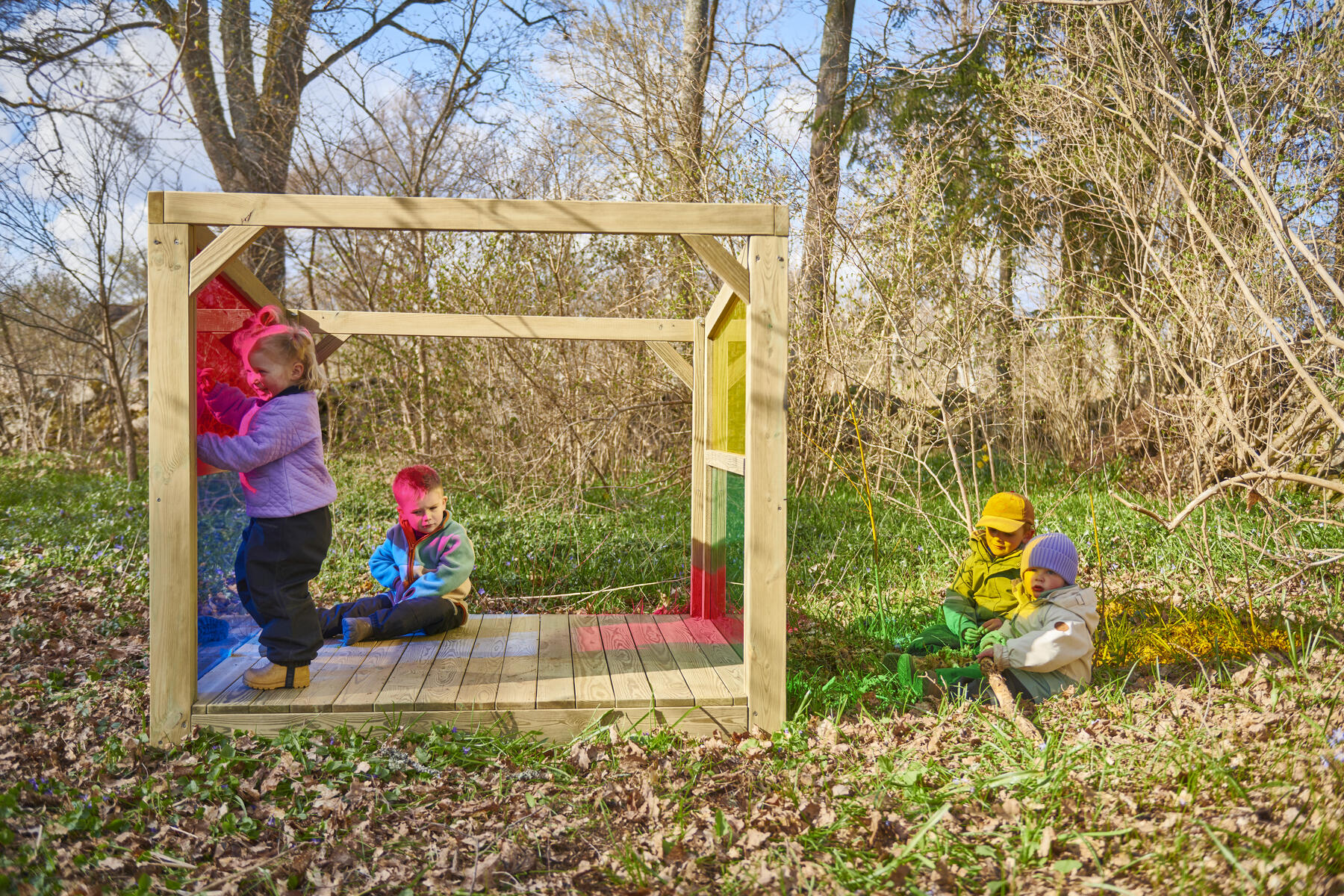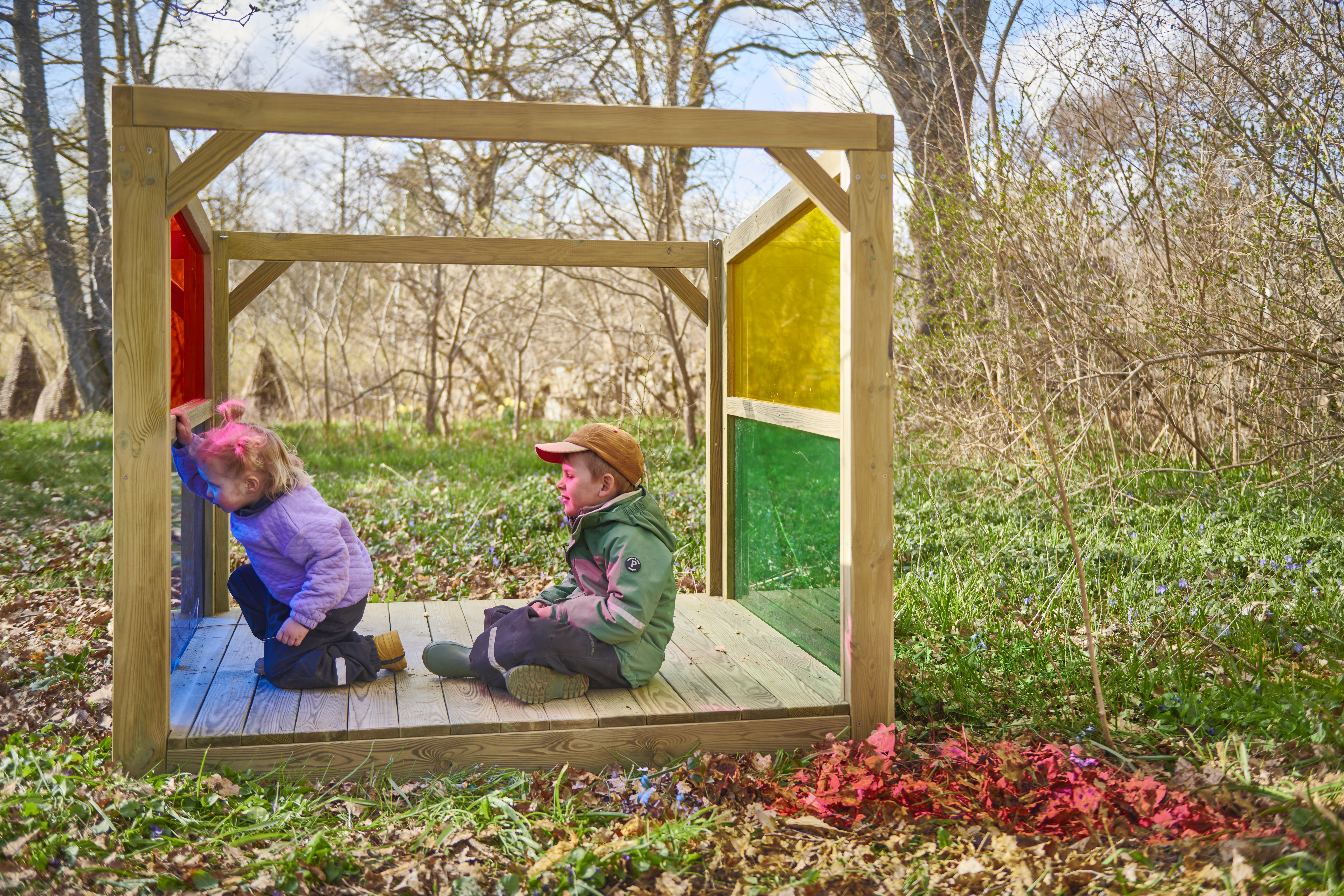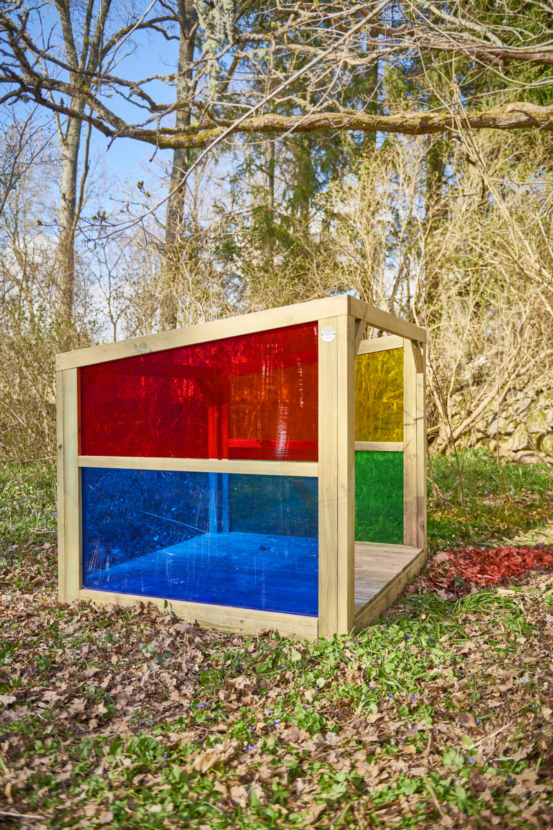 Ett mysigt krypin i utemiljön som inger trygghet. Ljuset faller fint in mellan de transparent färgade fönsterna och skapar sensoriska upplevelser som stimulerar det visuella sinnet. Kojan är öppen för olika typer av lek och passar även utmärkt som reträttplats om barnen vill dra sig undan en stund och sitta och iaktta vad som händer runt omkring dem. Med en sida som är helt öppen kan både barnen och pedagogerna att ha överblick över vad som händer på gården. Av FSC-certifierad furu. Mått: 112x134x156 cm. Kojan skall förankras, 2 set av artnr 151134 krävs, säljs separat.