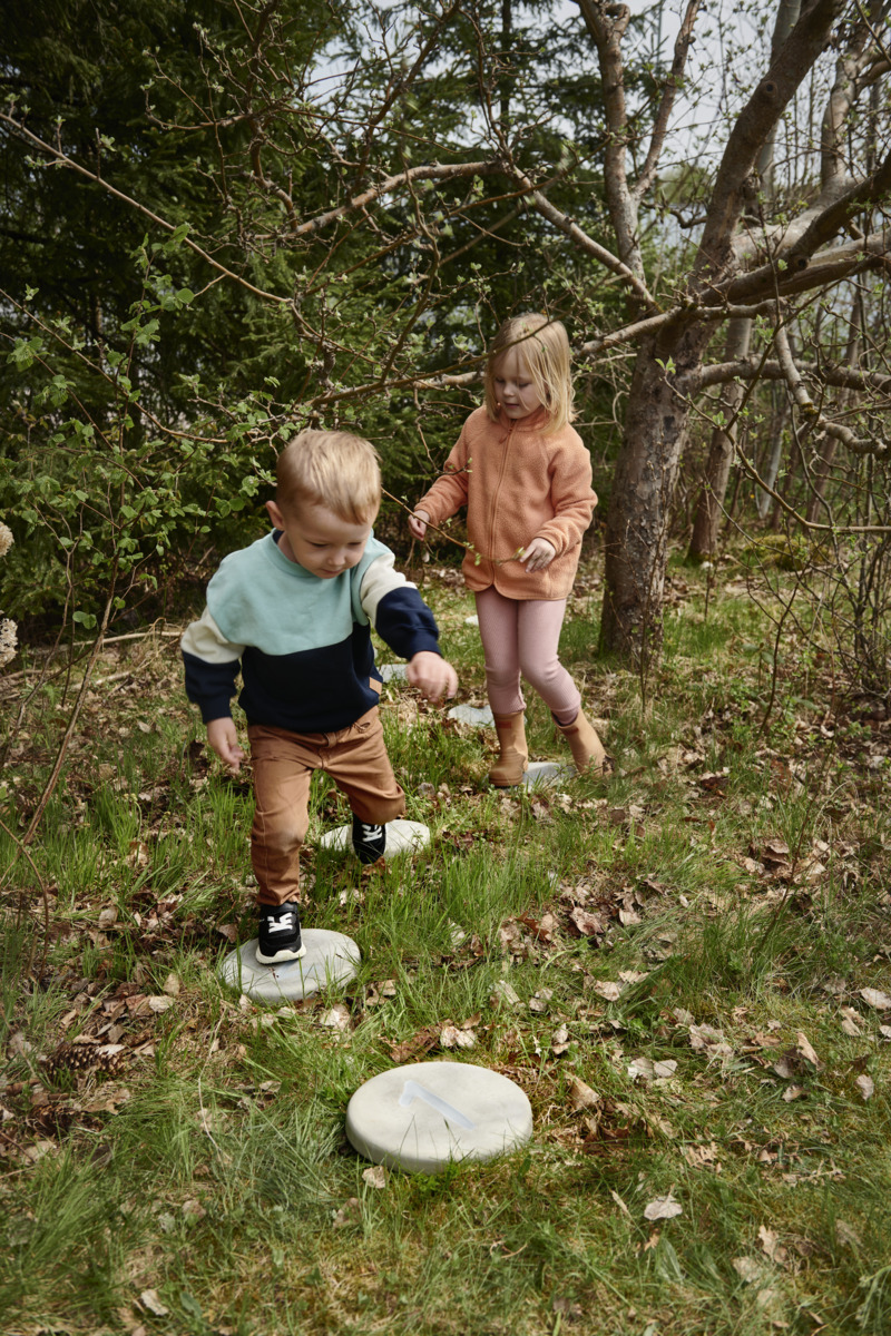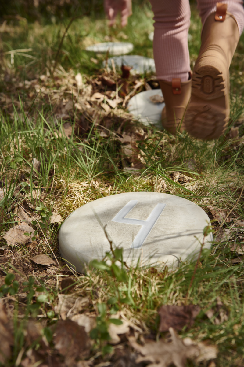 Skapa slingrande sifferstigar och integrera dem i utemiljön. Sifferplattorna lockar till rörelseglädje och genom att hoppa från siffra till siffra tränas både motorik och matematik på ett lekfullt sätt. De runda plattorna har en nedsänkt siffra och är numrerade från 1–10. Plattorna väger ca 3 kg/st och kan flyttas på, vilket bidrar till möjligheten att skapa en föränderlig utemiljö. Tillverkade av tålig betong och kan ligga utomhus året runt. ø 25 cm, höjd 3 cm.