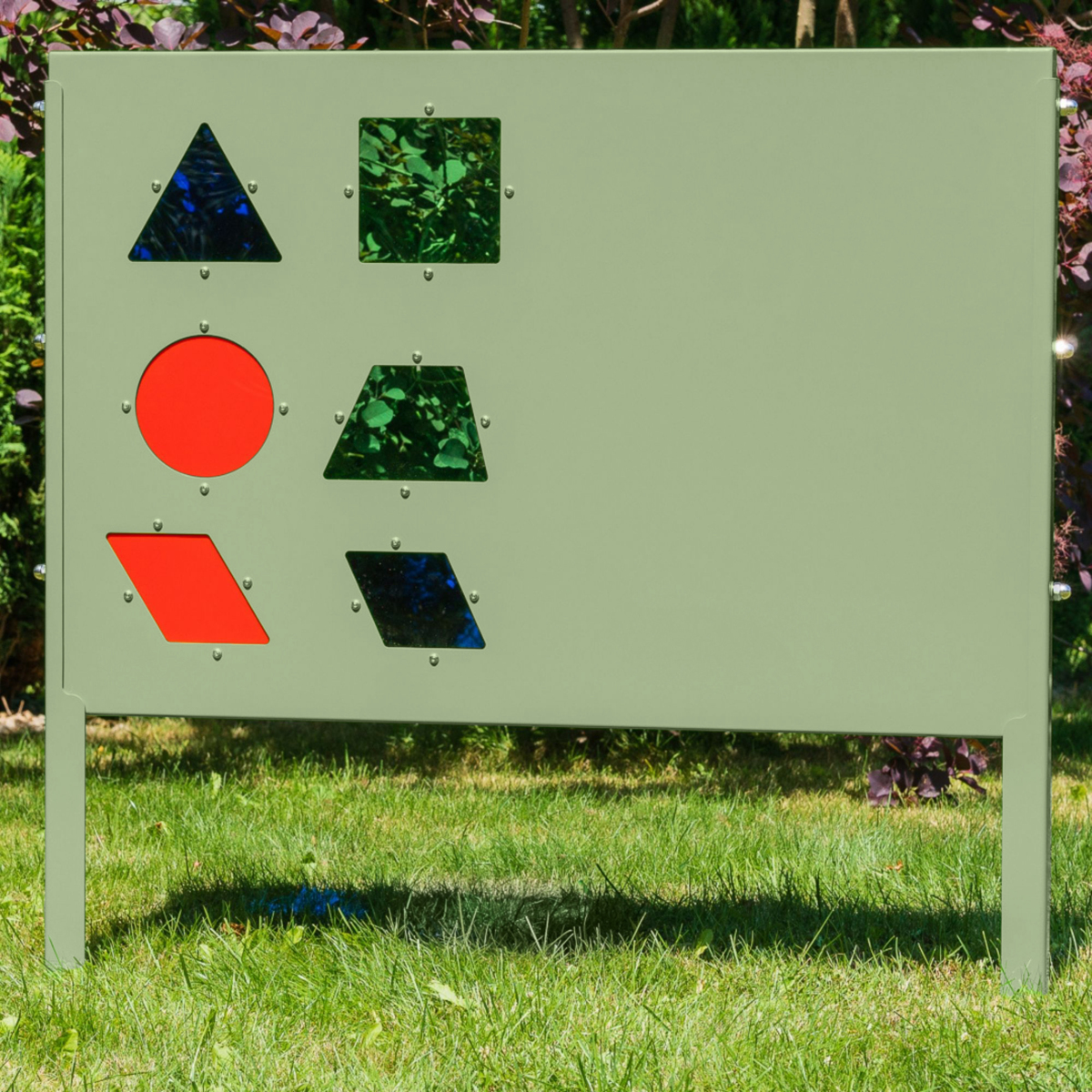 Upplev världen genom olika färger. När ljuset bryts i det färgade plexiglaset skapas fantastiska sensoriska upplevelser som stimulerar det visuella sinnet. Färger påverkar stämningar och känslor och har en betydande inverkan på utvecklingen. Träna på de olika geometriska formerna och försök finna motsvarande former i naturen. Bygg de matematiska formerna av naturmaterial. Det kan bli både vackra konstverk och träning i hur formerna ser ut. Använd andra halvan av brädan för olika magnetiska spel, t.ex. tangram, skapa olika mönster och undersöka och urskilja olika matematiskt begrepp. En rejäl konstruktion av galvaniserat och pulverlackerat stål. Galvaniserad markförankring ingår.