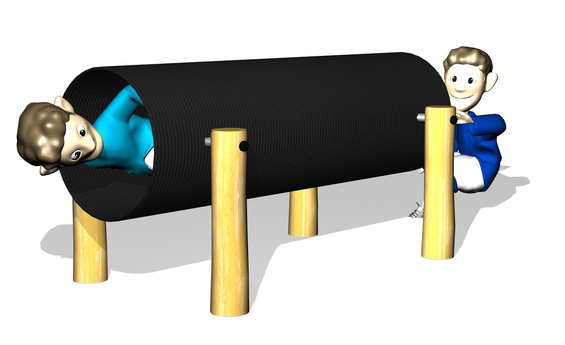 Tunnel i massiv, skandinavisk norrlandsfuru med fyra plexiglasfönster: två på varje sida i olika färger. Behandlad för utomhusmiljö. Beslag ingår. Mått: L145xB80xH88 cm.