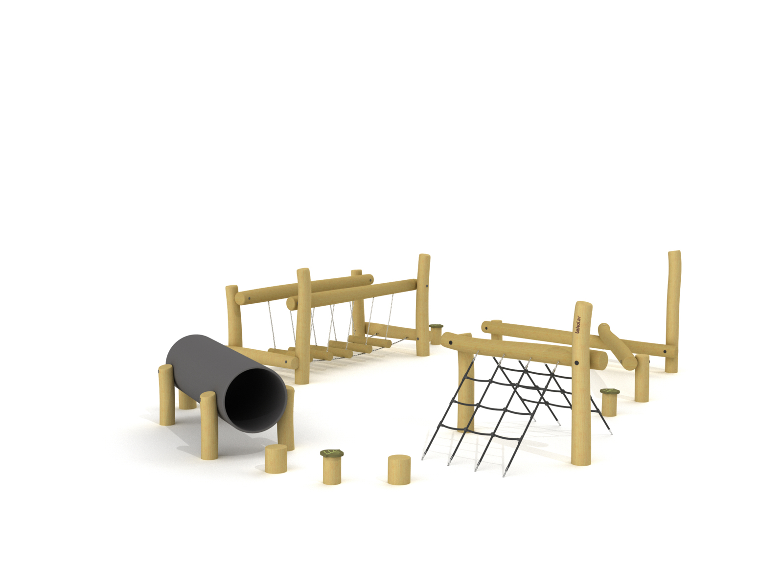 Robinia ger ett mjukt och naturligt intryck och smälter in fint i utemiljön. När barnen tar sig fram längs hinderbanan utmanas barnens balans, koordination och kroppsmedvetenhet. De lövdekorerade balansstubbarna slingrar sig fram mellan ett dubbelt klätternät, genom en tunnel, en svajig hängbro och över dubbla balansstockar. Tillverkad av FSC-certifierad Robinia, ett träslag med hög motståndskraft mot väderpåverkan. Det har förmågan att absorbera minimalt med vatten och utmärker sig genom sin extremt långa hållbarhet. Tunnel av HDPEMonteras enligt installationsmanual.