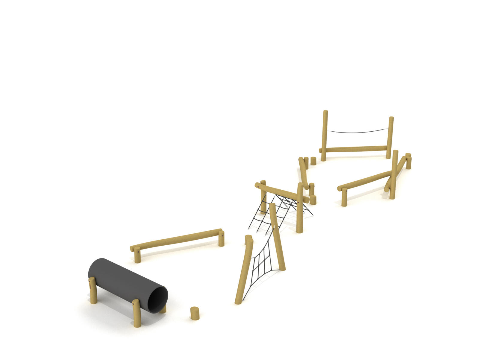 Robinia ger ett mjukt och naturligt intryck och smälter in fint i utemiljön. När barnen tar sig fram längs hinderbanan utmanas barnens balans, koordination och kroppsmedvetenhet. Balansstubbarna slingrar sig fram över ett dubbelt klätternät, två balansbommar, ett balanshinder, två balansbommar med rep, stående klätternät, balansbro och genom en tunnel. Tillverkad av FSC-certifierad obehandlad Robinia, ett träslag med hög motståndskraft mot väderpåverkan. Tunnel av HDPE. Det har förmågan att absorbera minimalt med vatten och utmärker sig genom sin extremt långa hållbarhet. Monteras enligt installationsmanual.
