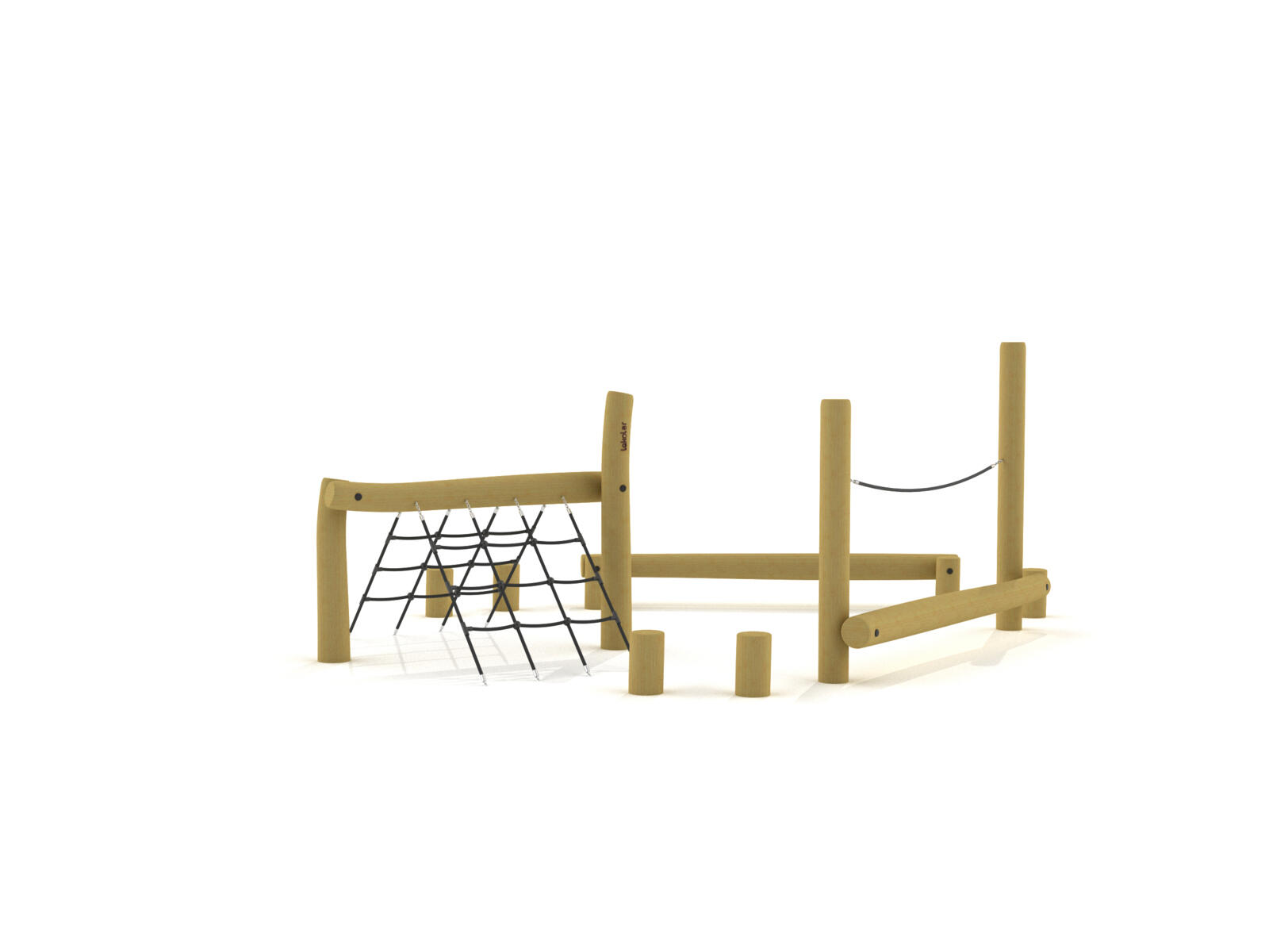 Robinia ger ett mjukt och naturligt intryck och smälter in fint i utemiljön. När barnen tar sig fram längs hinderbanan utmanas barnens balans, koordination och kroppsmedvetenhet. Balansstubbarna slingrar sig fram över ett dubbelt klätternät, balansbom och en balansbom med rep. Tillverkad av FSC-certifierad Robinia, ett träslag med hög motståndskraft mot väderpåverkan. Det har förmågan att absorbera minimalt med vatten och utmärker sig genom sin extremt långa hållbarhet. Monteras enligt installationsmanual.