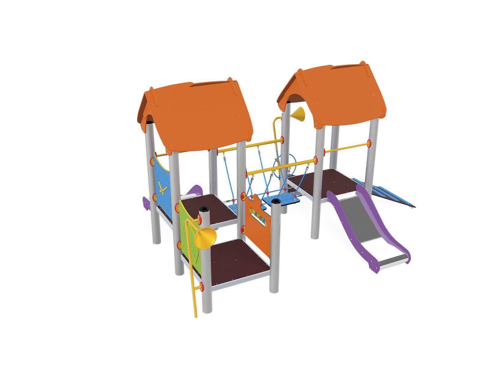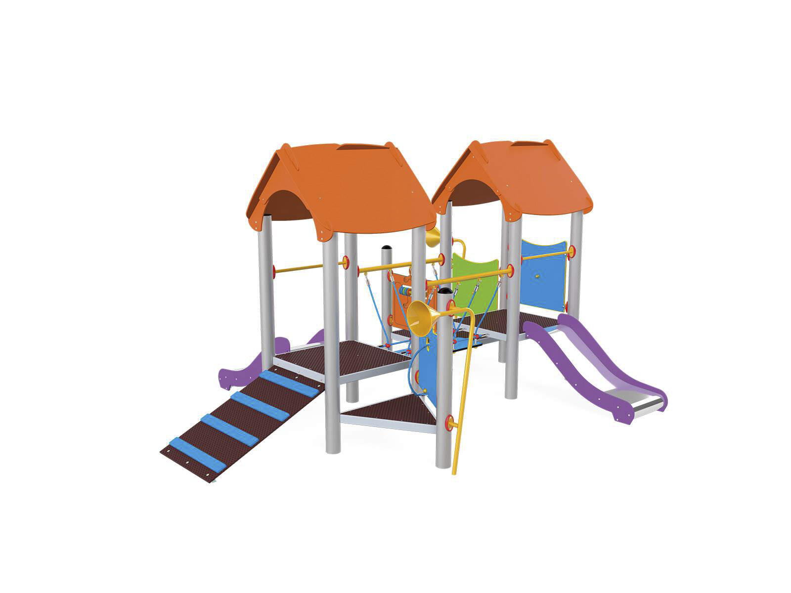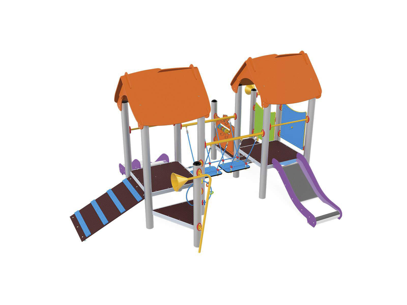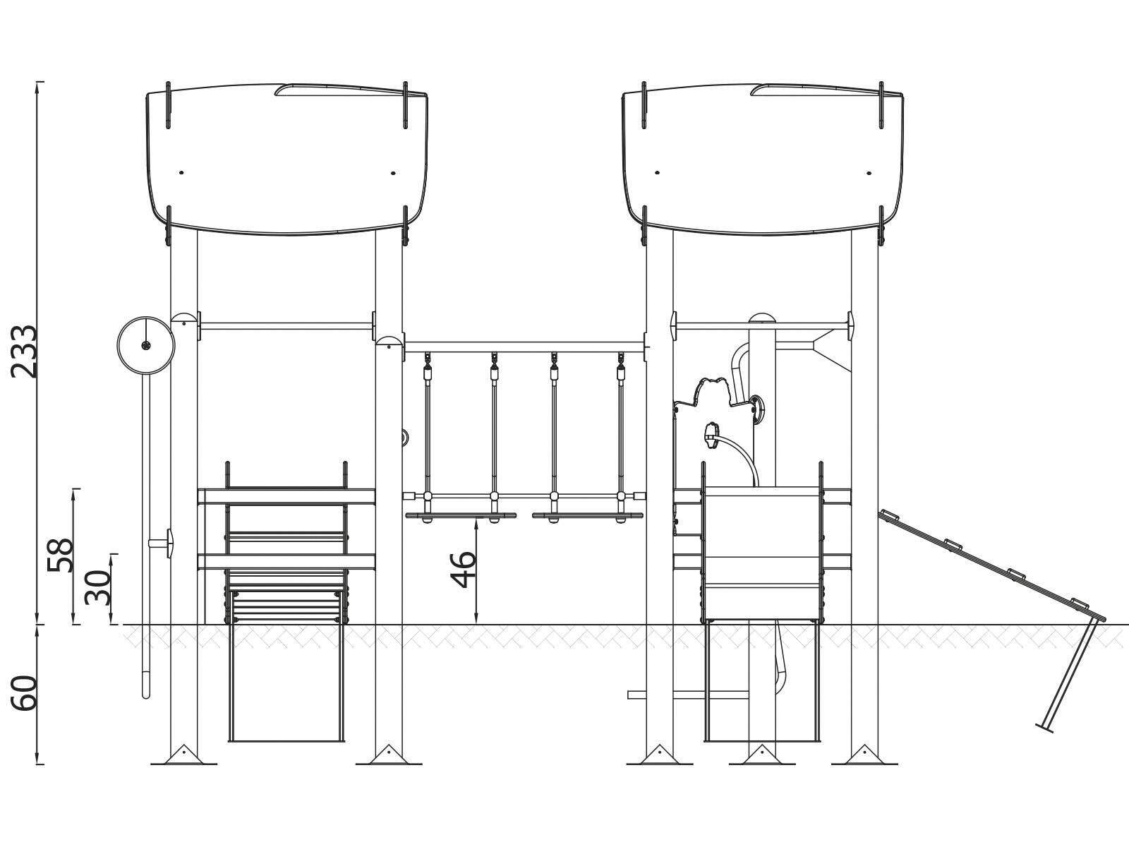 Klätterställning med flertalet lekmoment som t.ex. klättervägg, repbro, gångbro, stege, klätternät, dubbelstege och tv¨å lekpaneler samt rutsch i stål. Stomme av trä med paneler i HDPE.