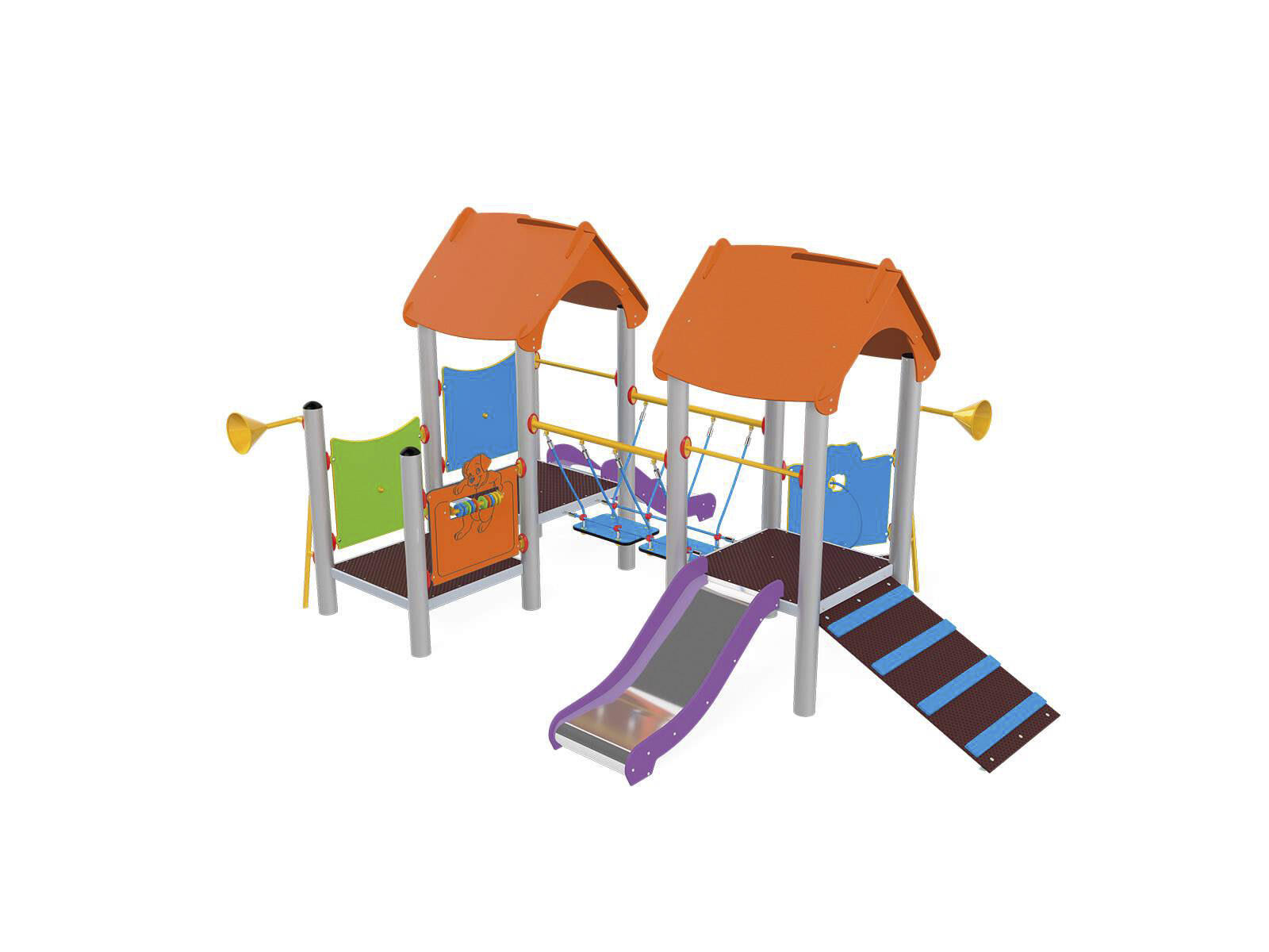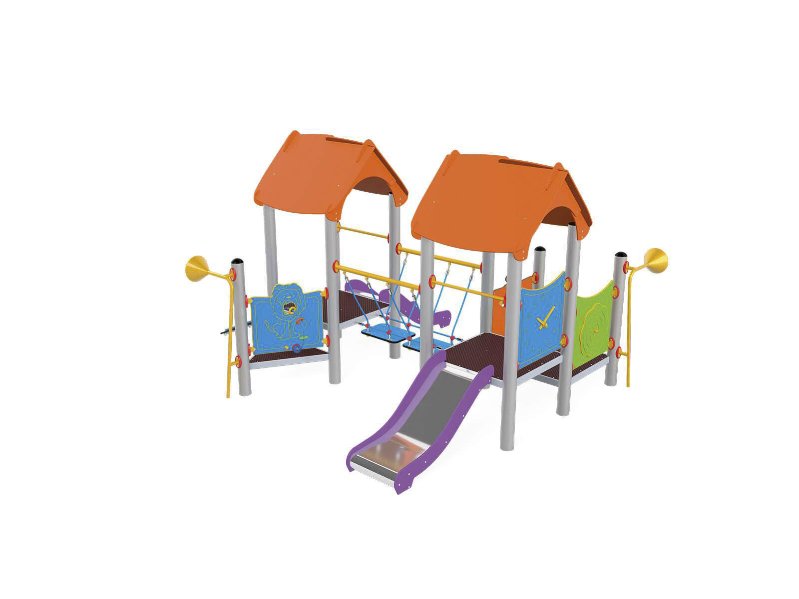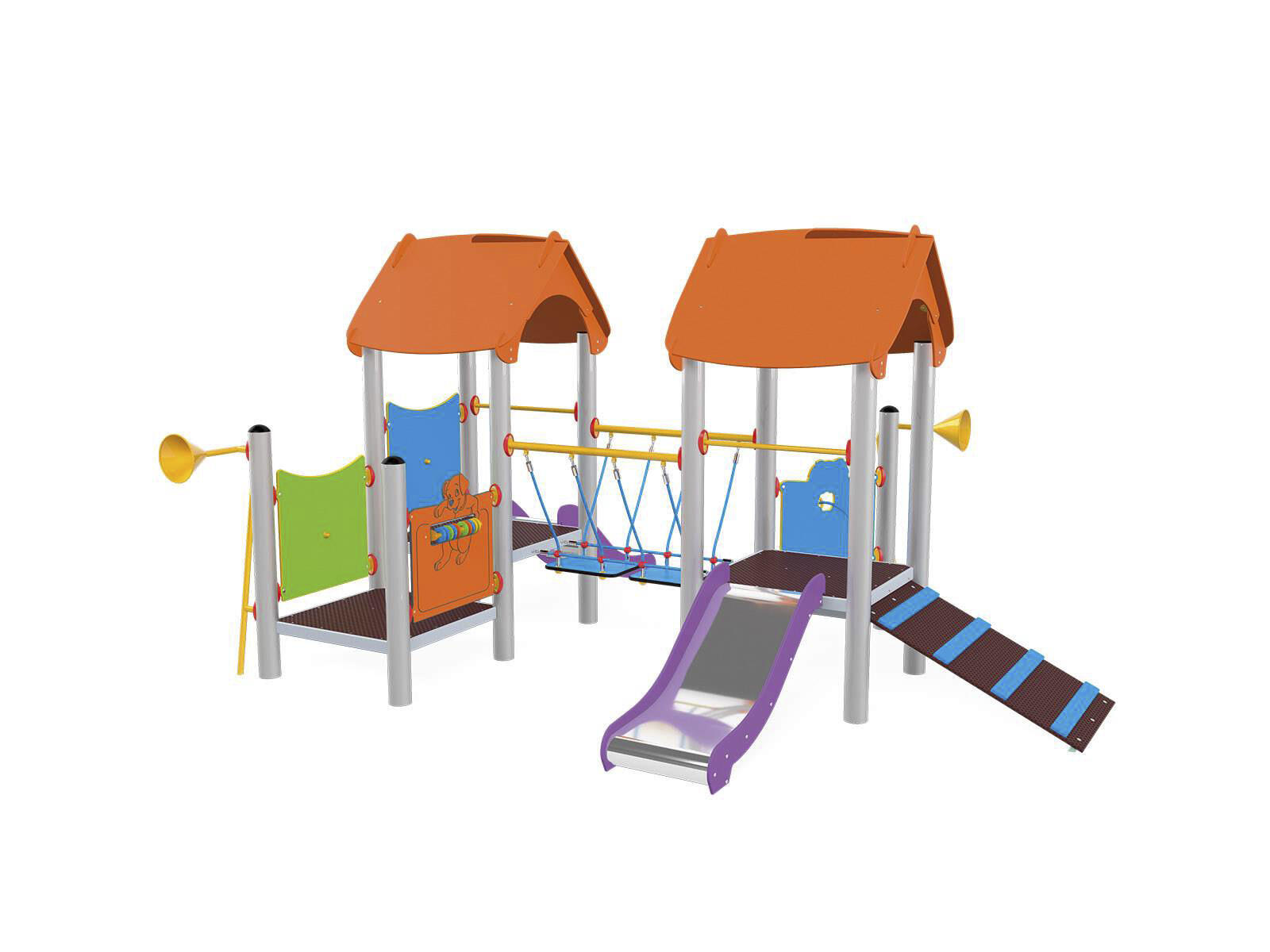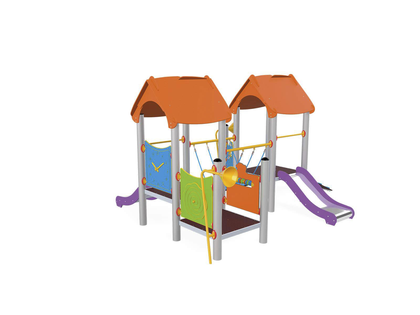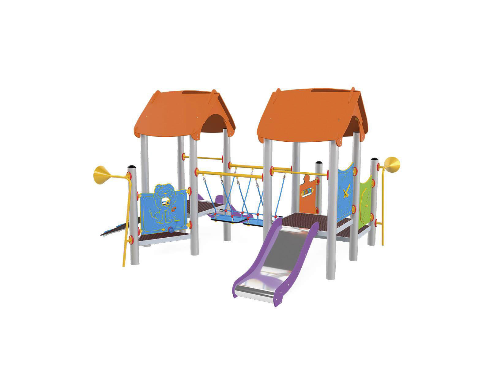 Klätterställning med flertalet lekmoment som t.ex. klättervägg, repbro, gångbro, stege, klätternät, dubbelstege och tv¨å lekpaneler samt rutsch i stål. Stomme av trä med paneler i HDPE.