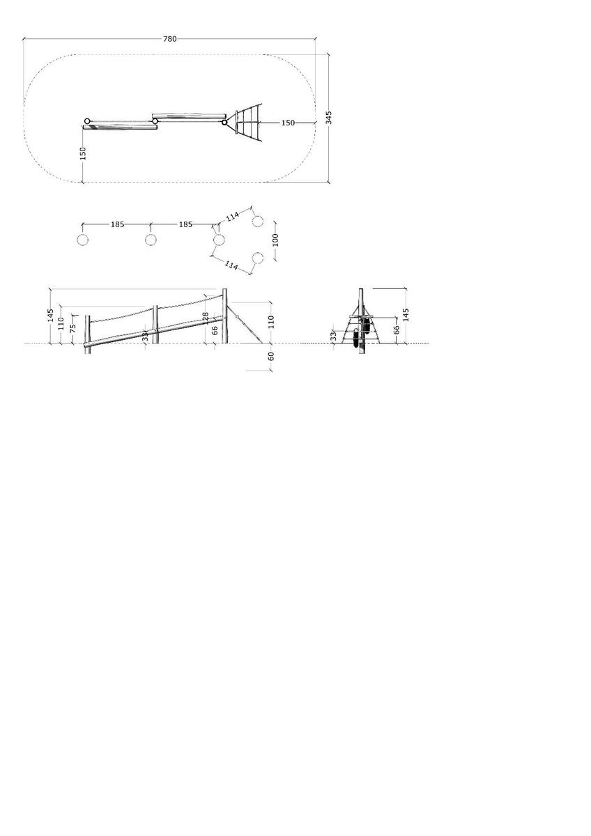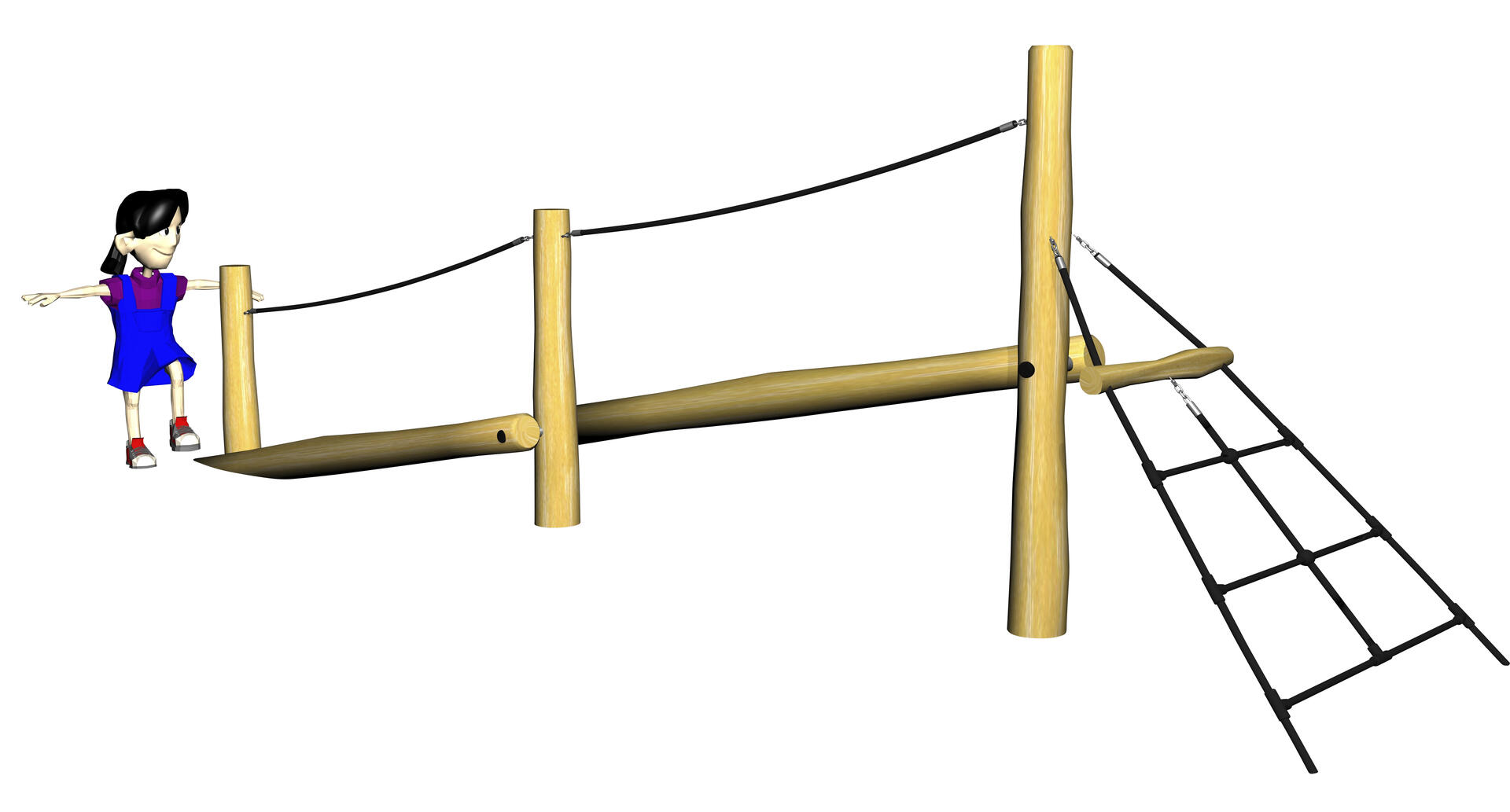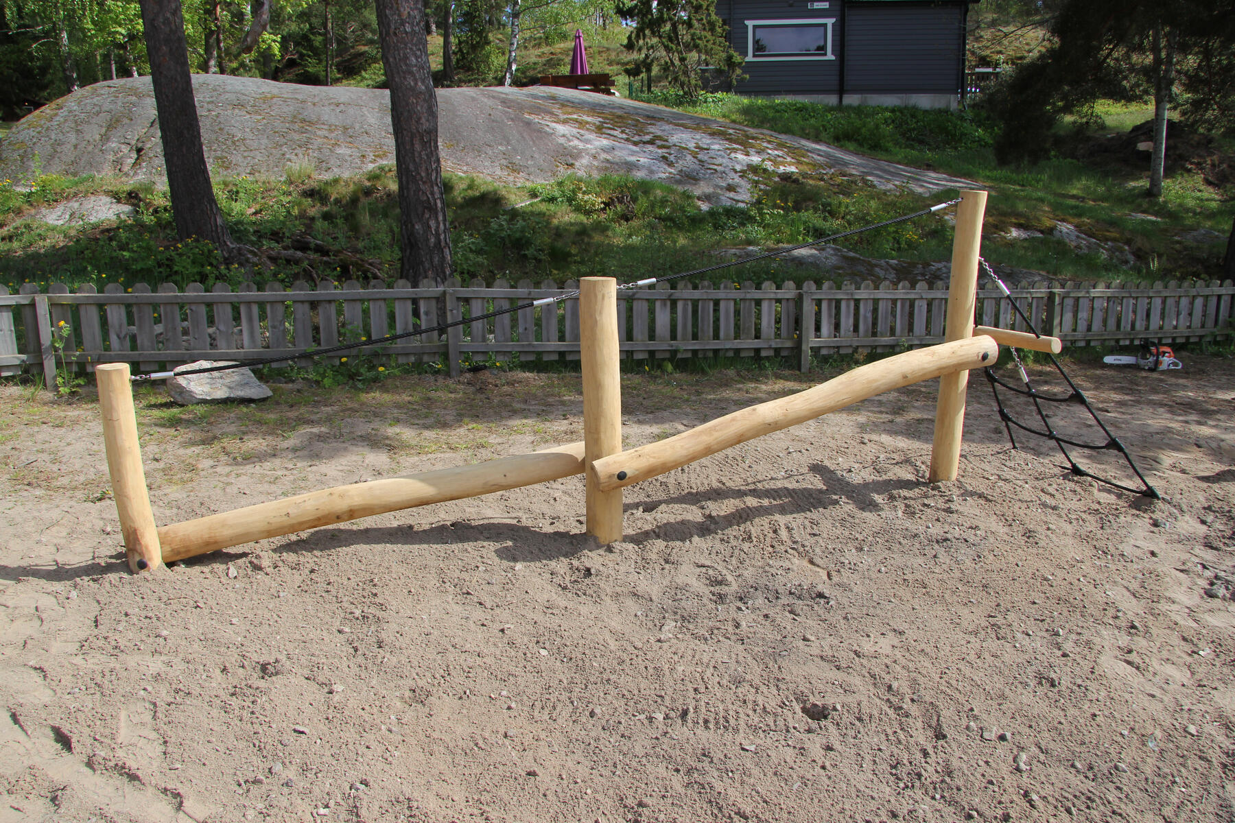 Dubbel balansbom i robinia med rep och klätterställning. För exakta mått och övrig information, se dokument.