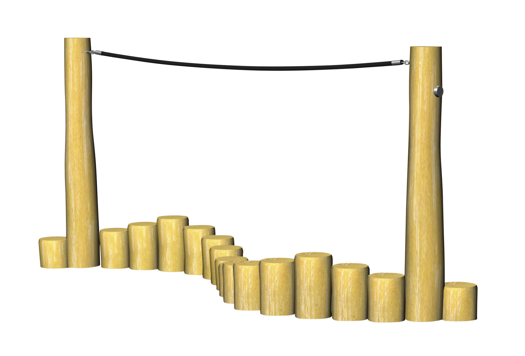 Balansplintar med rep. Rep i stål, täckt med flätad polypropen. På tre av plintarna sitter det en platta av halkfritt HT-laminat. Bas i Robinia, ett träslag som är väderbeständigt, tar upp lite vatten och är extremt hållbart. Vid installation ska alltid den medföljande manualen användas. Den senaste versionen finns att tillgå på begäran. Leverantörens artikelnummer Robinia RB1272