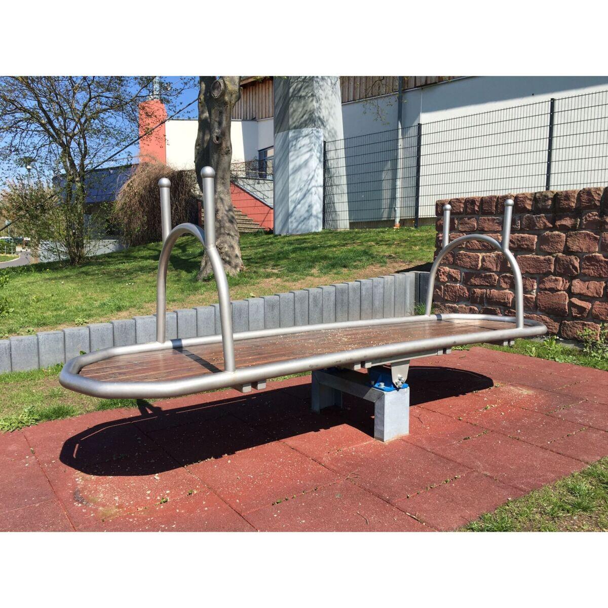 Denna unika stående gungbräda bjuder in två eller fler barn till rolig och aktiv gunglek i utemiljön. Den generösa ytan gör det möjligt för barn att både stå och sitta i mitten, vilket skapar variation och spänning i leken. Vippgungan främjar samarbete och viktiga sociala färdigheter som kommunikation och turtagning. Samtidigt tränas balans och koordination, vilket stärker barnens motoriska utveckling på ett lekfullt sätt. Av rostfritt stål med platta av obehandlad lärk.