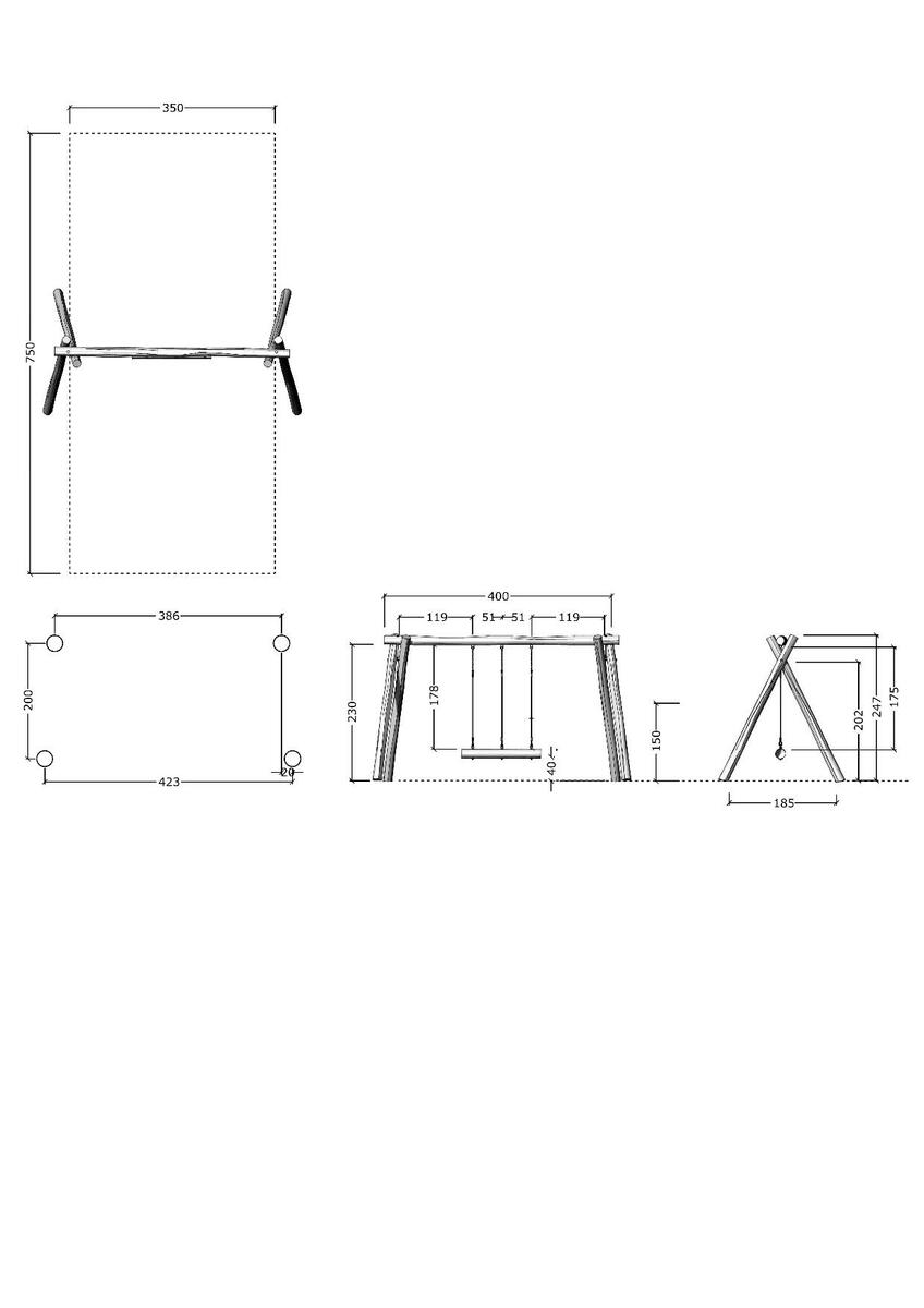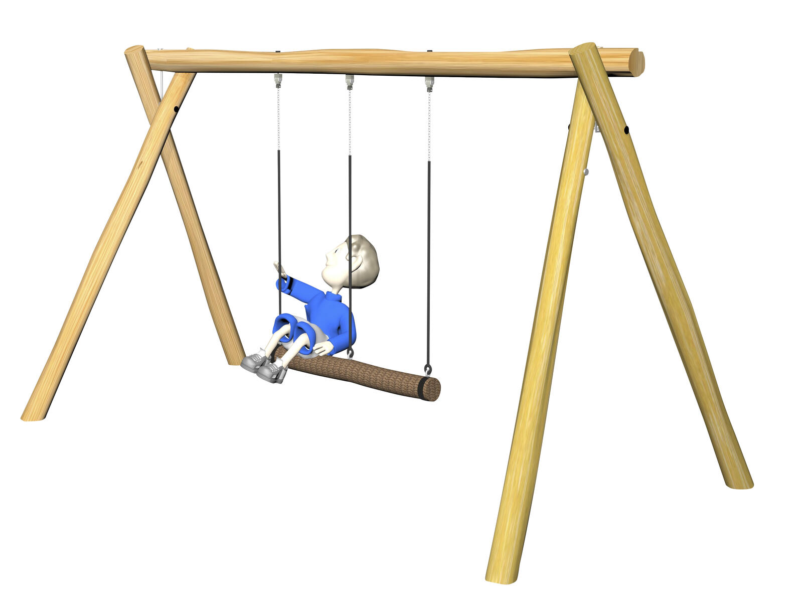 Stabil gungställning med gunga av tjock tross, upphängd i 3 kedjor. 2 platser. Säkerhetsområde: 3,5x7,5 m. För exakta mått och övrig information, se dokument.