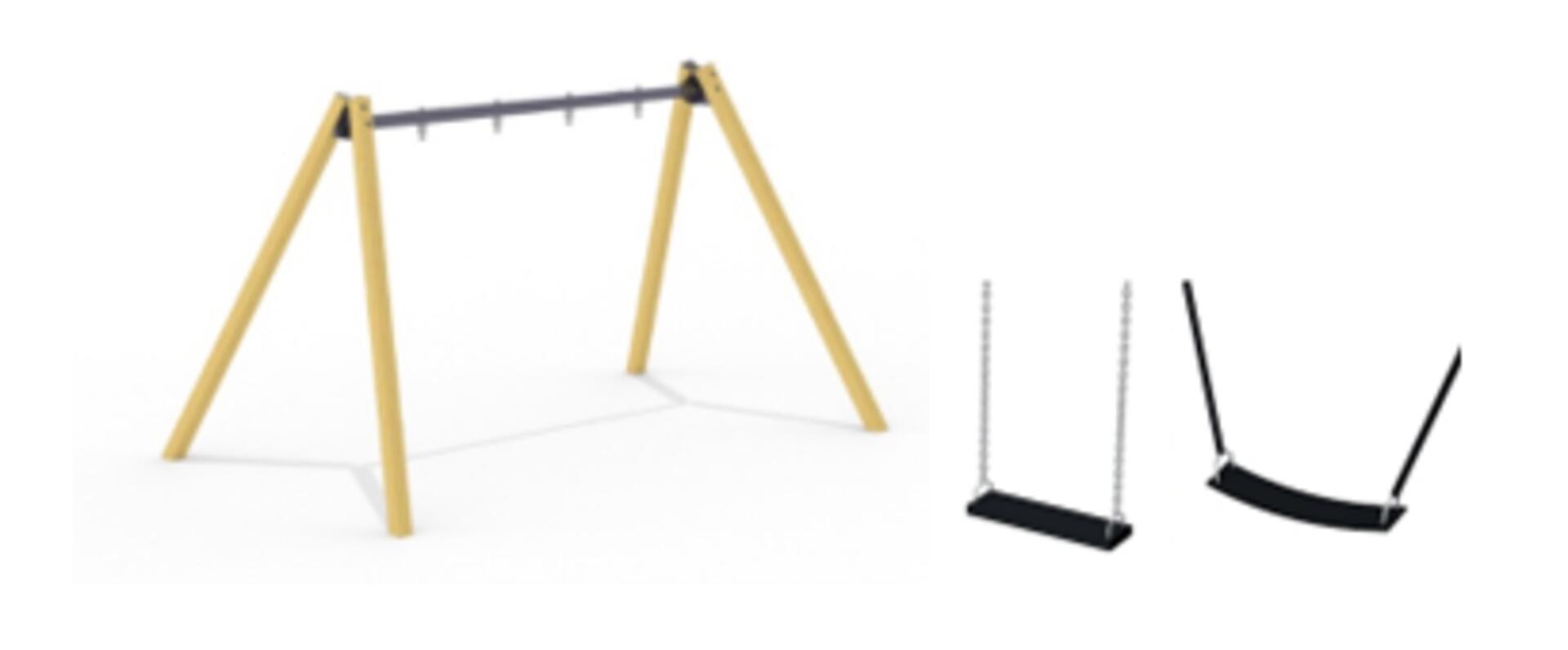 Stolpar av douglasgran med markförankring i galvaniserad stål, tvärbalk av pulverlackerad stål med galvaniserade gungleder, slitstarka gungsitsar med rostfri kätting.