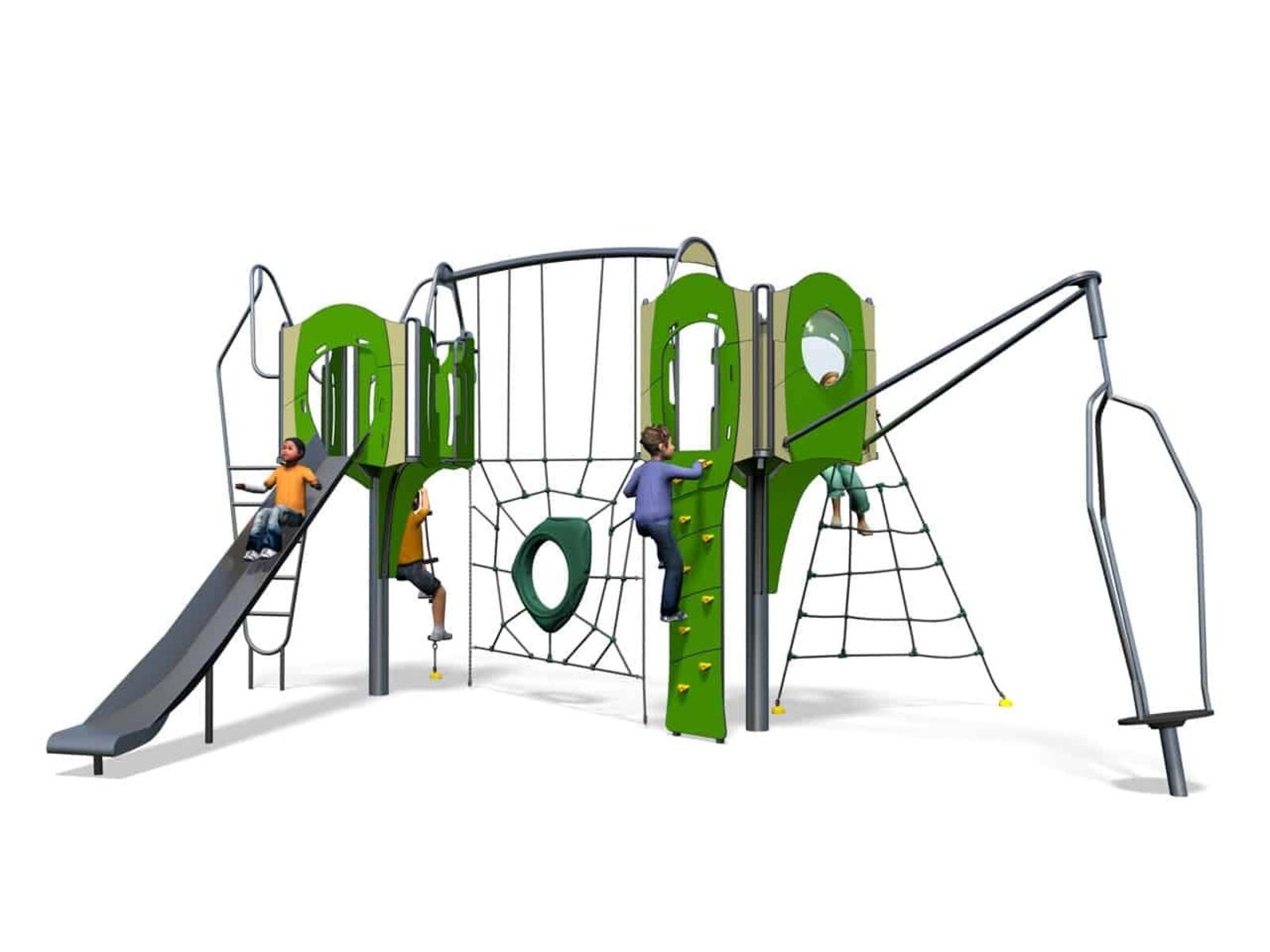 En spännande kombination med två torn som är sammanlänkade med ett utmanande klätternät. Denna stora modul erbjuder en spännande blandning av klätternät, snurrkarusell, stege, klättervägg och rutschbana. Här kan de äldre barnen utmanas och inspireras i timmar samtidigt som fysik och motorik utvecklas. Tillverkat i rostfritt stål och slitstarka material som kräver minimalt underhåll.