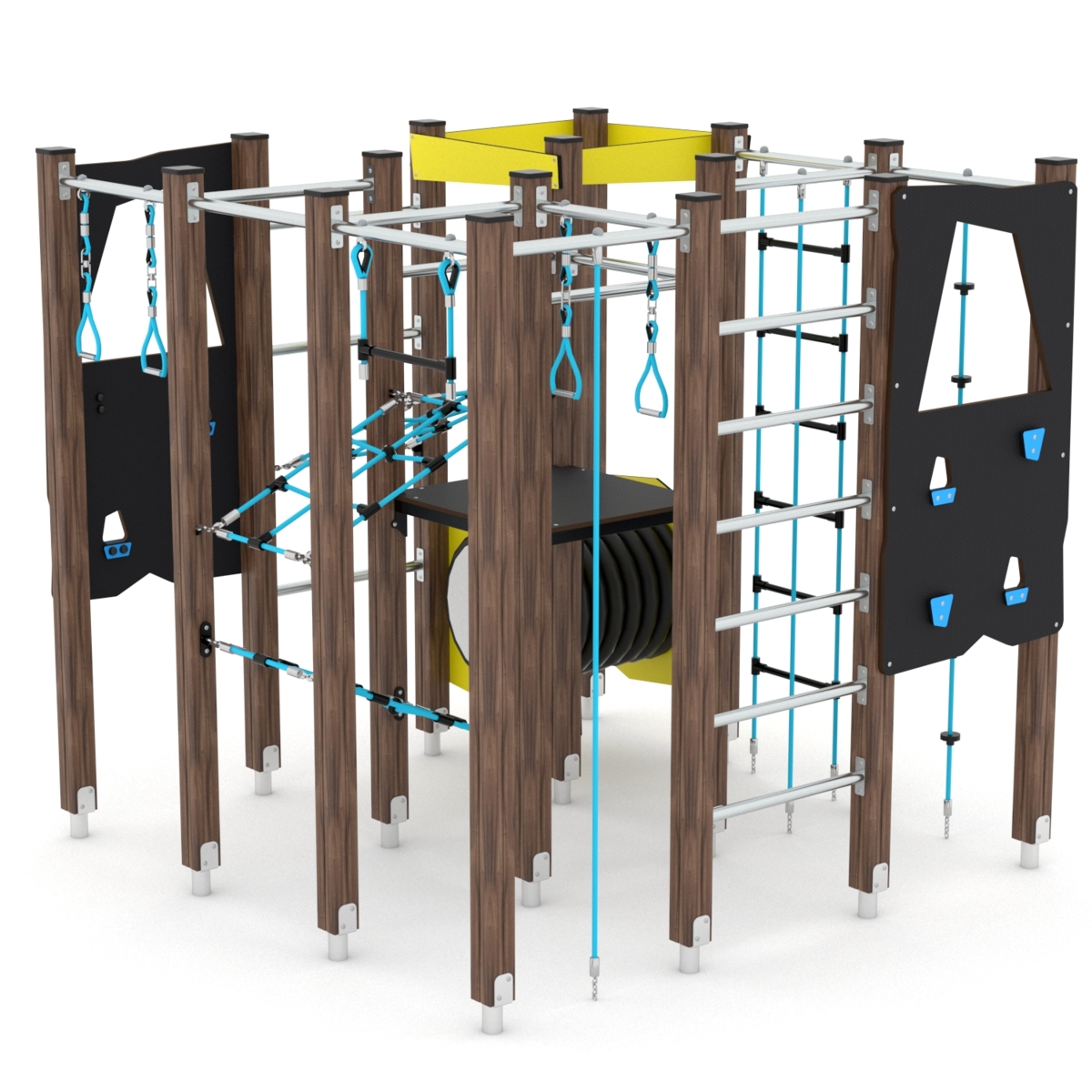 Klättervägg med rep. Väggen är tillverkad i laminerad furu. Markfästen i varmförzinkat stål för att öka livslängden på produkten. Vid installation ska alltid den medföljande manualen användas. Den senaste versionen finns att tillgå på begäran. Leverantörens artikelnummer Climboo 0499