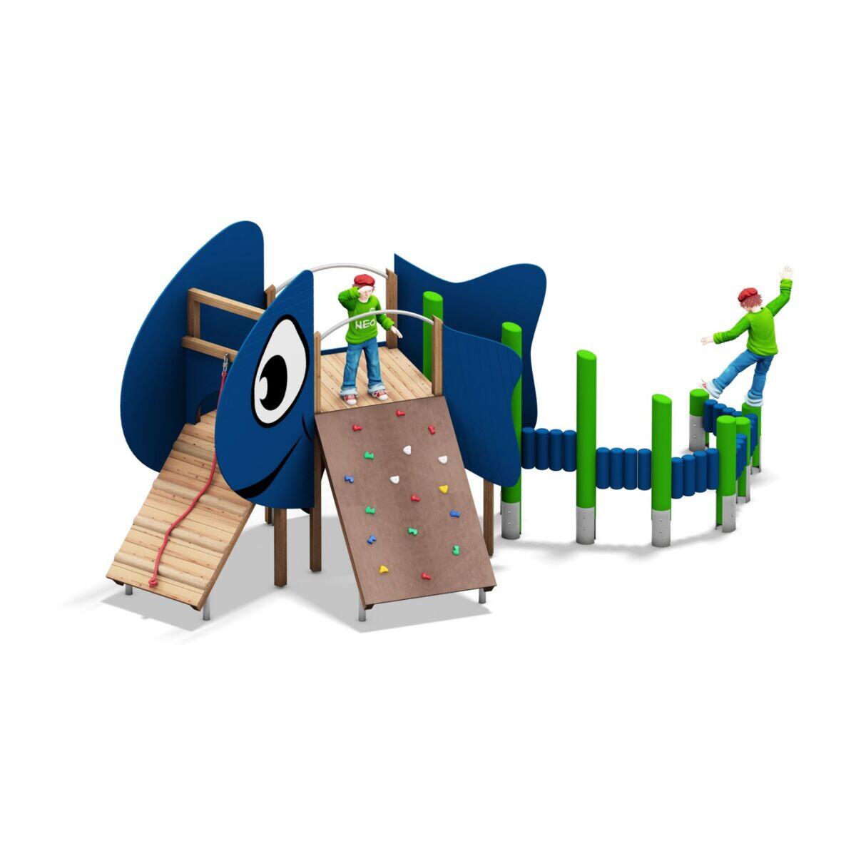 Fantasifulla former och roliga detaljer som stimulerar motorik, koordination och social interaktion via en kombination av olika klätter- och balansmoment. Av obehandlad lärk och stolpskor av rostfritt stål.