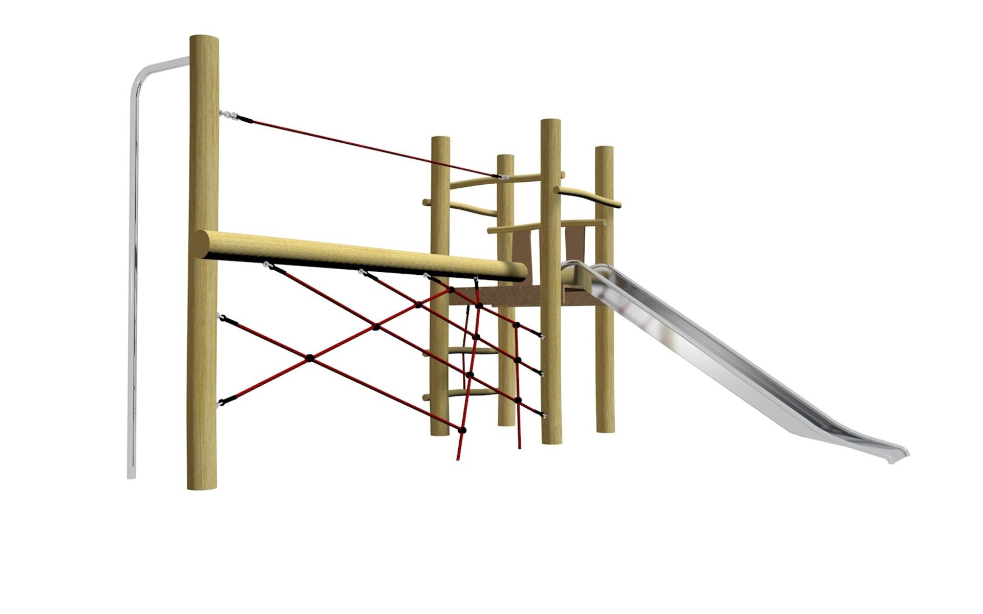 Ett kompakt multilek för de äldre barnen som tränar motorik, balans och koordination. Klätterställningen är utrustad med både ett sluttande klätternät och ett lodrätt nät, brandmannastång, två balansrep, klätterplank, repstege, rutschkana av stål och två köpmansdiskar för sociala rollekar, Grundstomme av stål och plattform av HDPE.