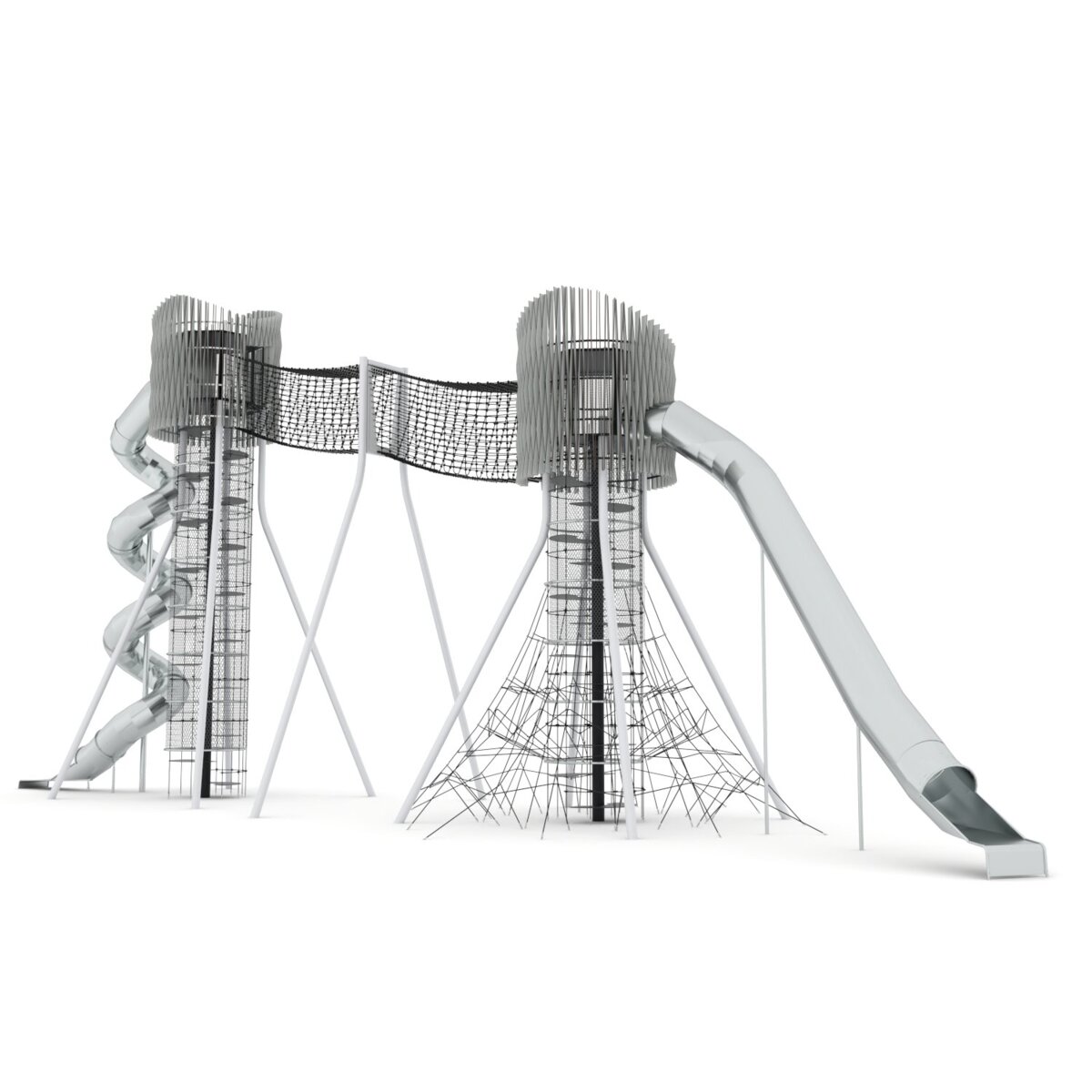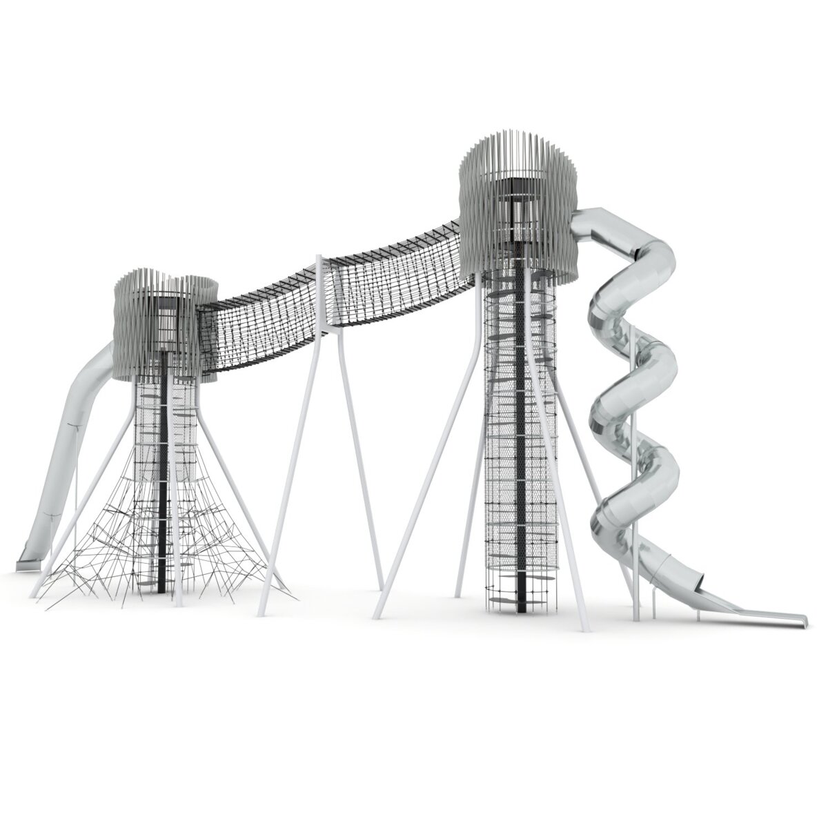 Att klättra högt i torn som nästan når upp till himlen är både spännande och utmanande. Genom att klättra utvecklar barnen sin motorik, koordination, balans och kroppsmedvetenhet. MAXX är ett modulärt system av högsta kvalitet. Denna modell består av två höga torn, klätternät, sprialtrappsteg, hängbro mellan tornen och en lång spiraltunnelrutschbana samt en tubrutschbana. Modulerna är tillverkade av varmgalvaniserat stål Vid installation ska alltid den medföljande manualen användas. Den senaste versionen finns att tillgå på begäran.