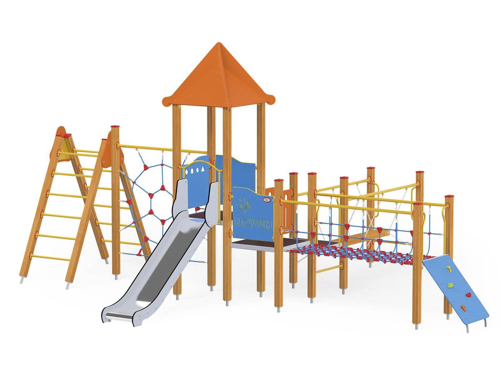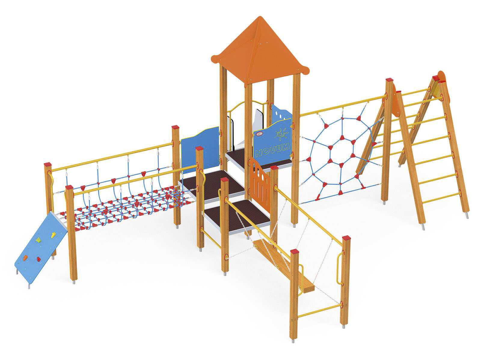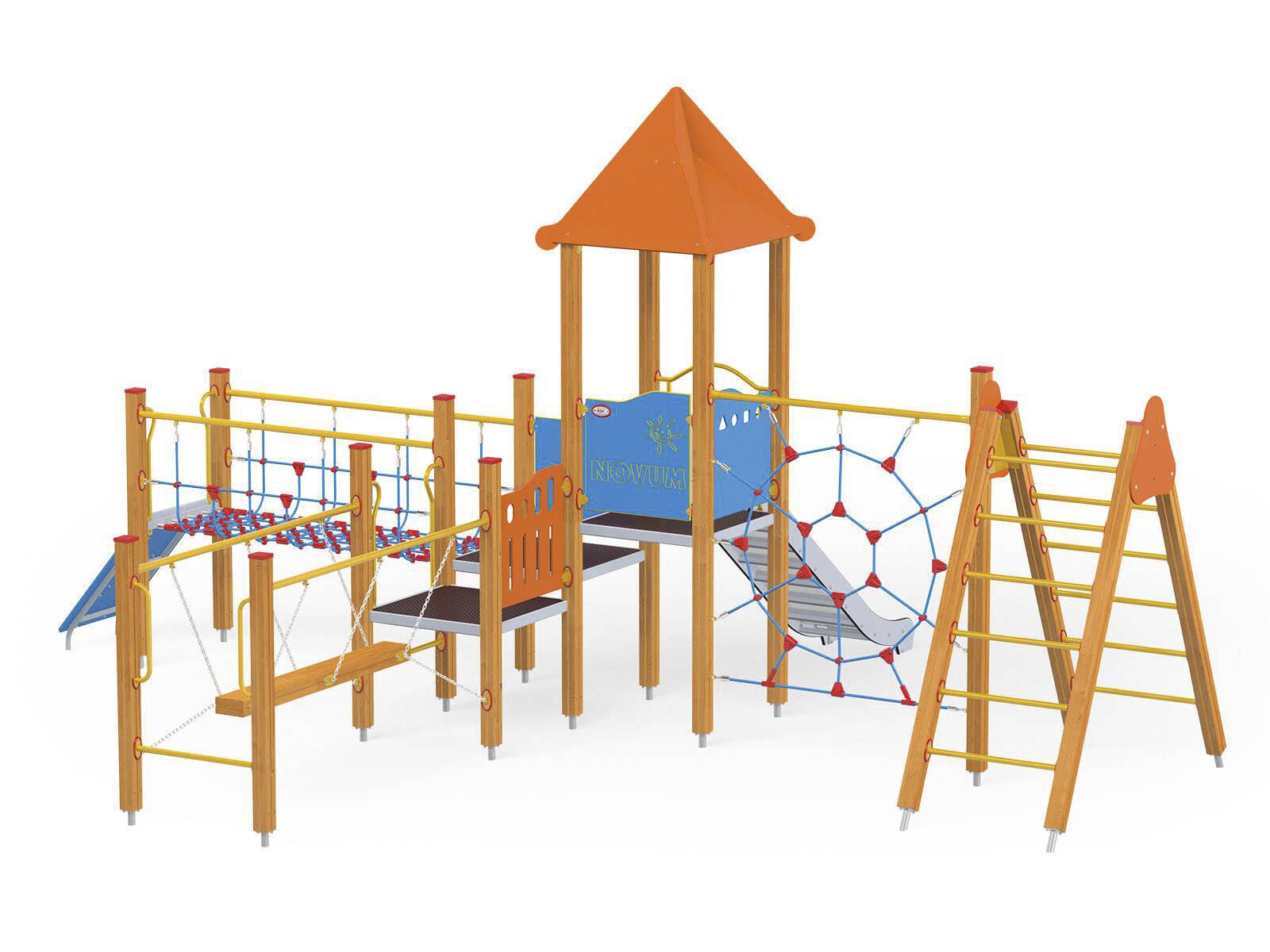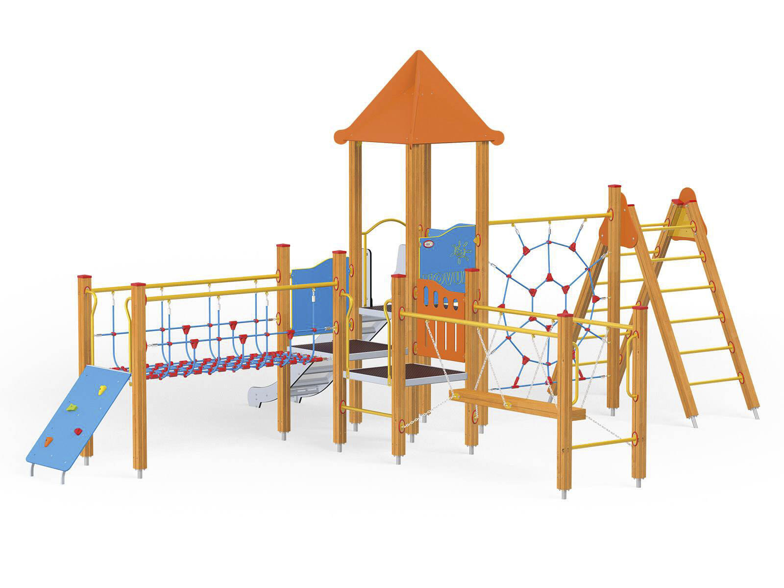 2 aktivitetstorn med rutschkana, 2 broar, klätterrep, stege, brandmansstång med steg och lärpanel. HDPE-paneler i multifärgad och HPL-paneler i övriga färger. Vid installation ska alltid den medföljande manualen användas. Den senaste versionen finns att tillgå på begäran. Leverantörens artikelnummer WD1411