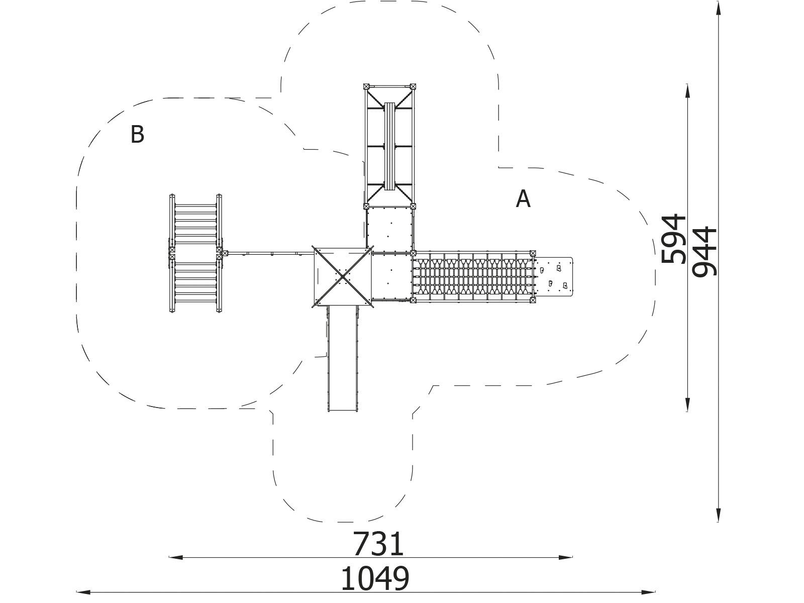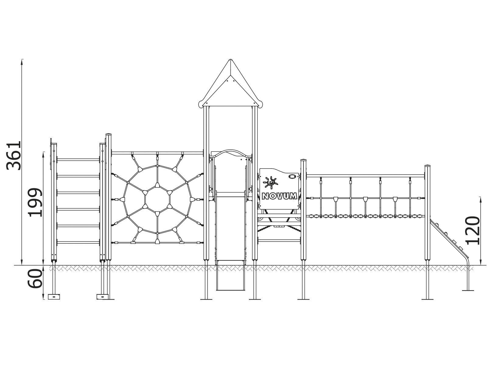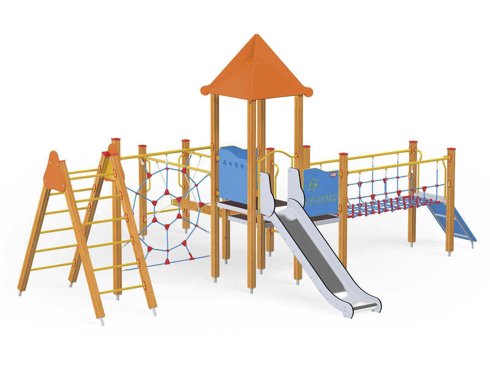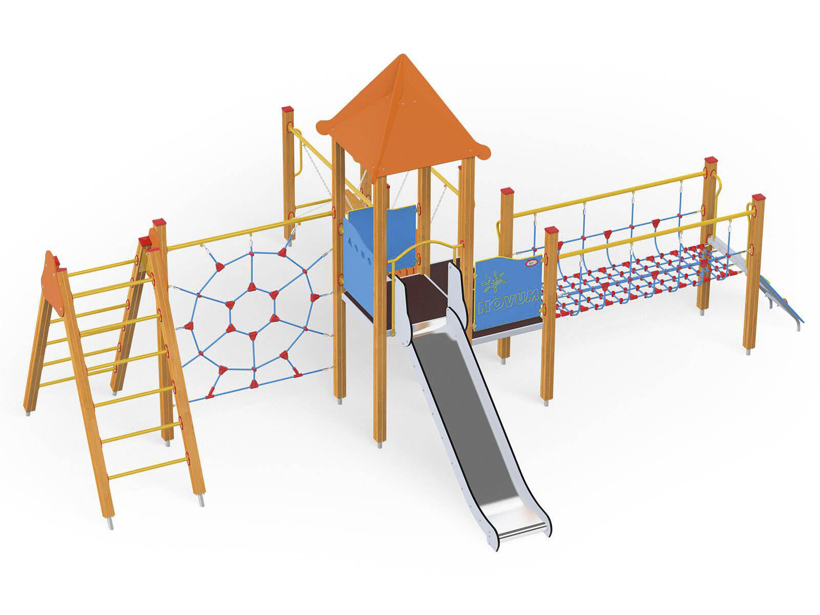 2 aktivitetstorn med rutschkana, 2 broar, klätterrep, stege, brandmansstång med steg och lärpanel. HDPE-paneler i multifärgad och HPL-paneler i övriga färger. Vid installation ska alltid den medföljande manualen användas. Den senaste versionen finns att tillgå på begäran. Leverantörens artikelnummer WD1411