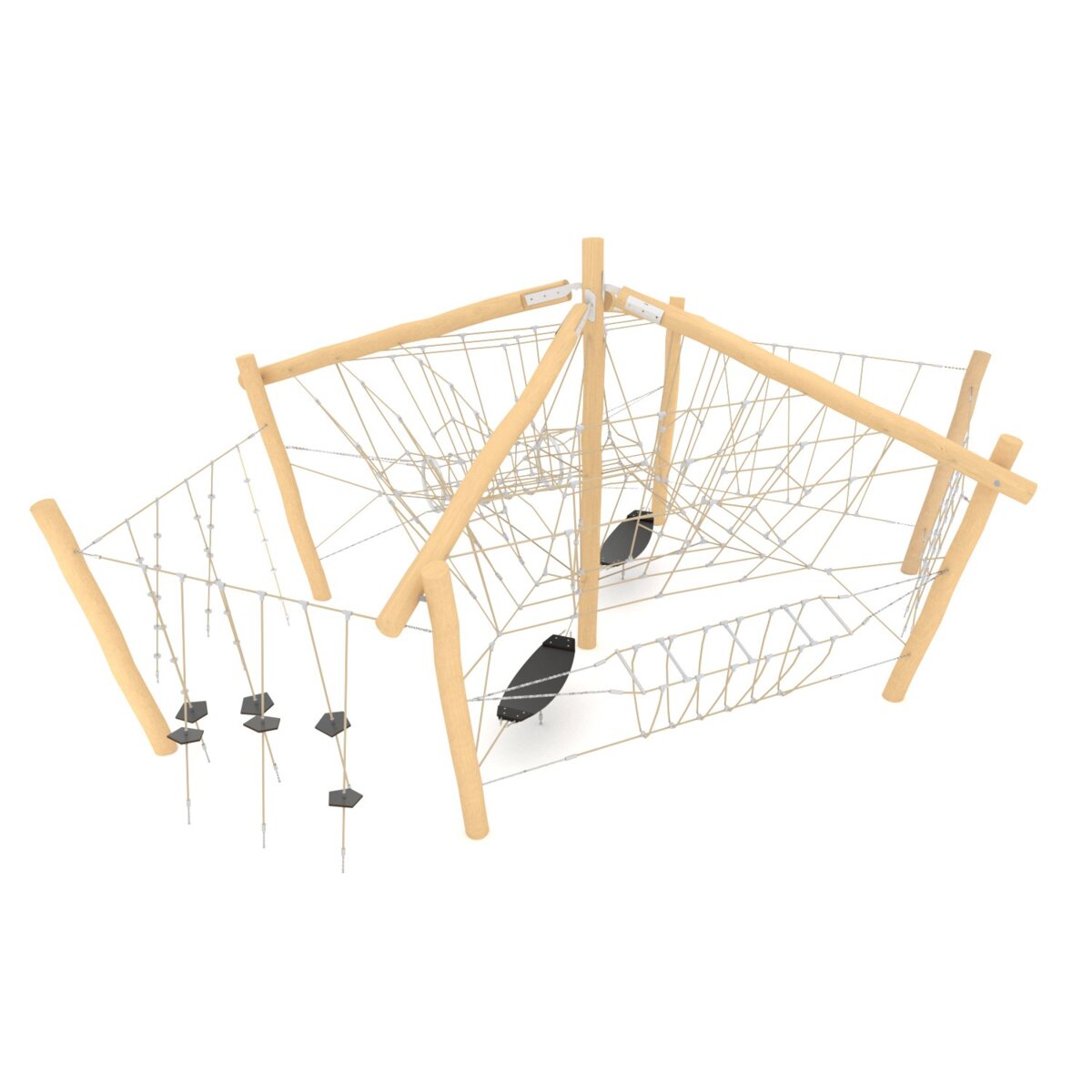 Robinia smälter fint in i utemiljön på förskolan och ger ett mjukt och naturligt intryck. Denna stora och utmanande klätterbana har rep i många olika lutningar och erbjuder klättring både vertikalt och horisontellt där både koordination, balans, ben- och armmuskler tränas. Gummiplattorna och knutarna hjälper till och ger stöd åt fötterna när man klättrar. Robinia är ett träslag med hög motståndskraft mot väderpåverkan. Det har förmågan att absorbera minimalt med vatten och utmärker sig genom sin extremt långa hållbarhet. Klätternät och rep av stål, täckt med flätad polypropen. Monteras enligt installationsmanual. Vid installation ska alltid den medföljande manualen användas. Den senaste versionen finns att tillgå på begäran.